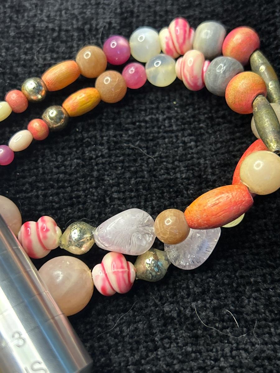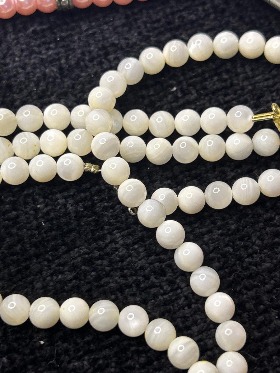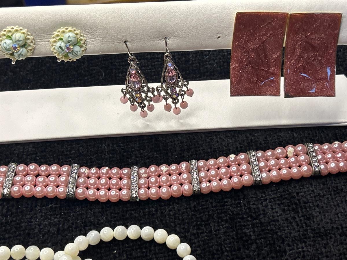 The two white necklaces are glass. The two pink pair of earrings are pierced, and the other is clip. The ring with the red stone is stamped 925. The other is not, but it looks like Sterling.
