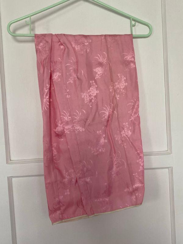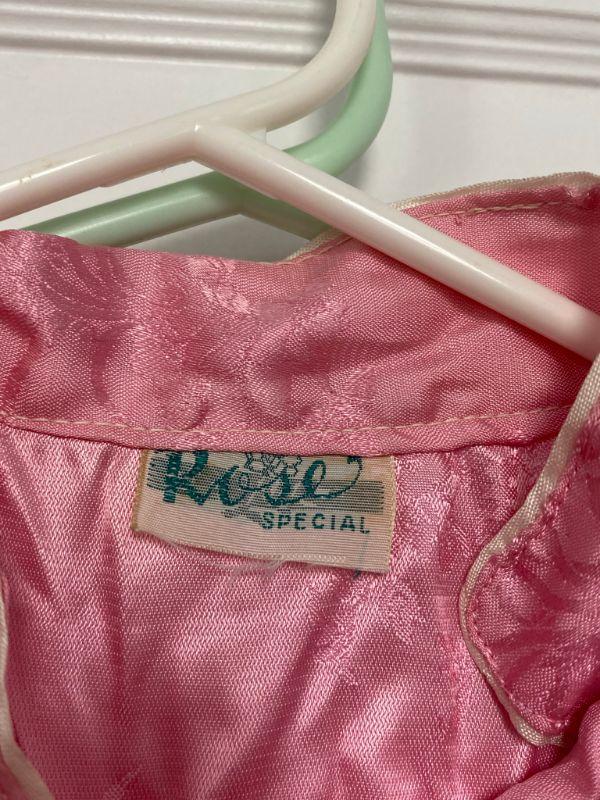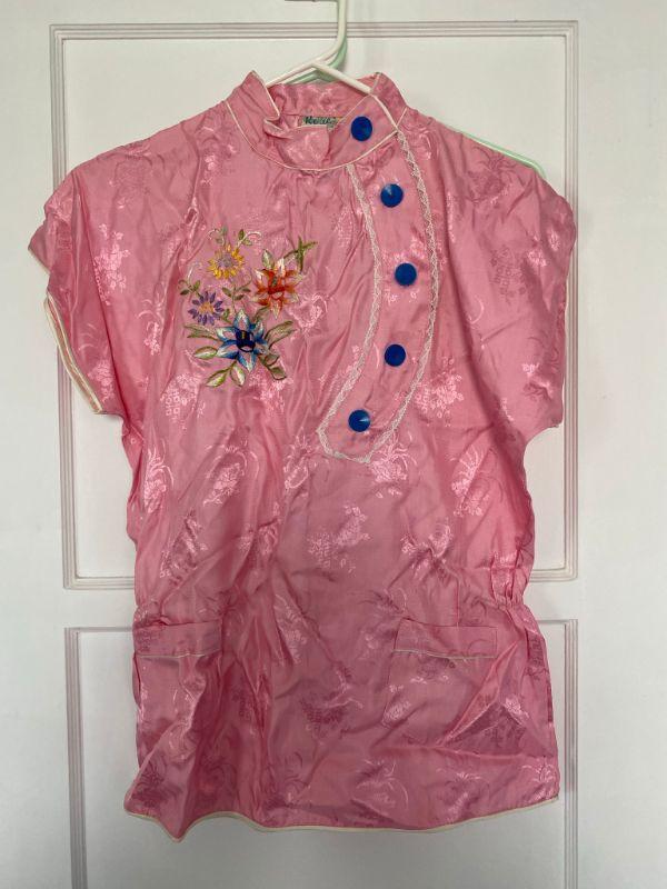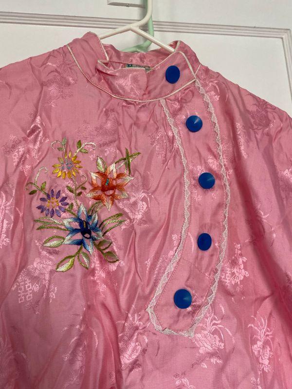 Vintage pink Asian inspired 2 piece pajama set. Pink satin with embroidered flowers and blue buttons. Made by Rose Special. Pants have elastic waist. Could not find a size tag but base on shirt and waist on pants I will say they are a small. Good condition, just wrinkled.