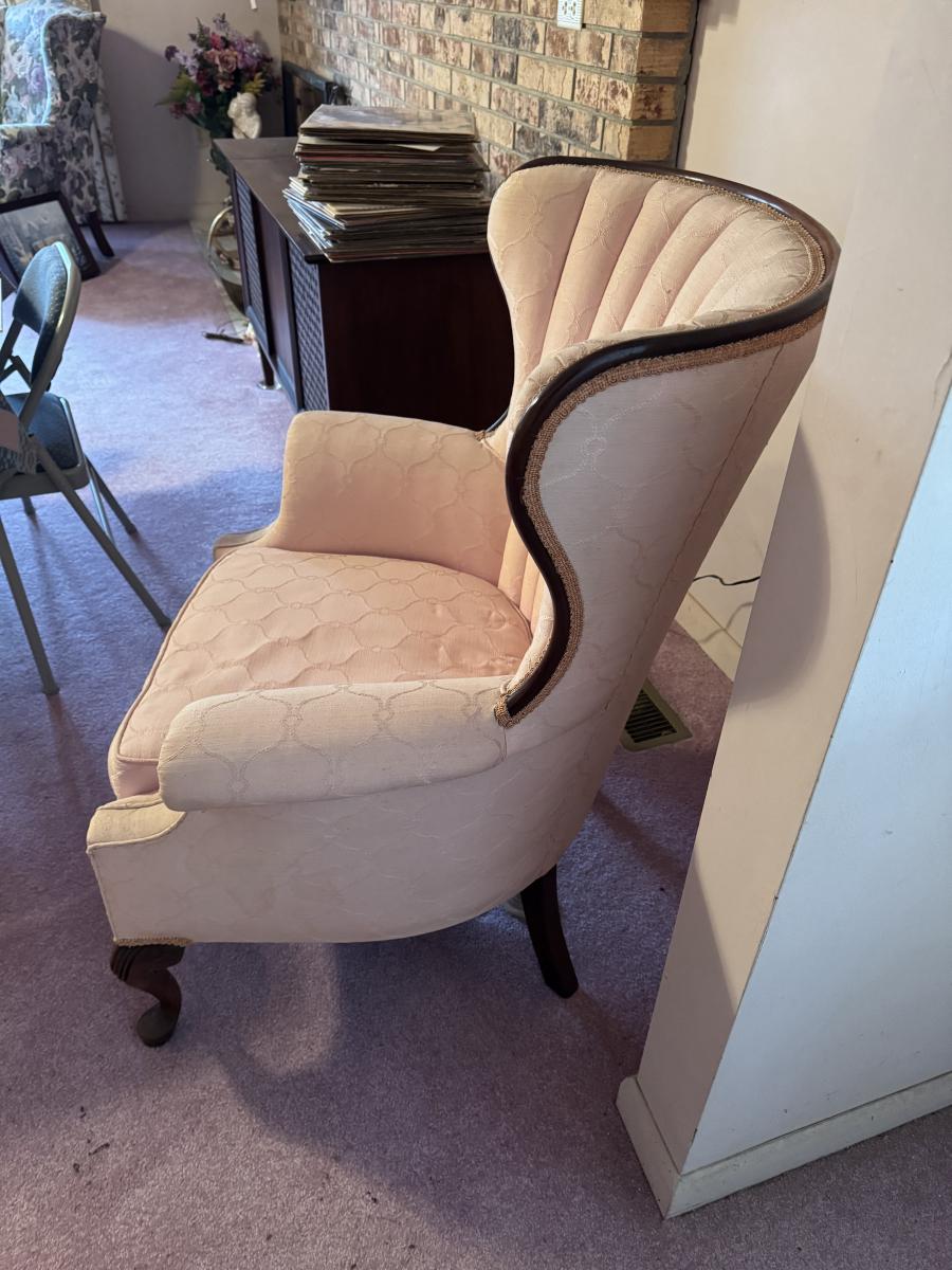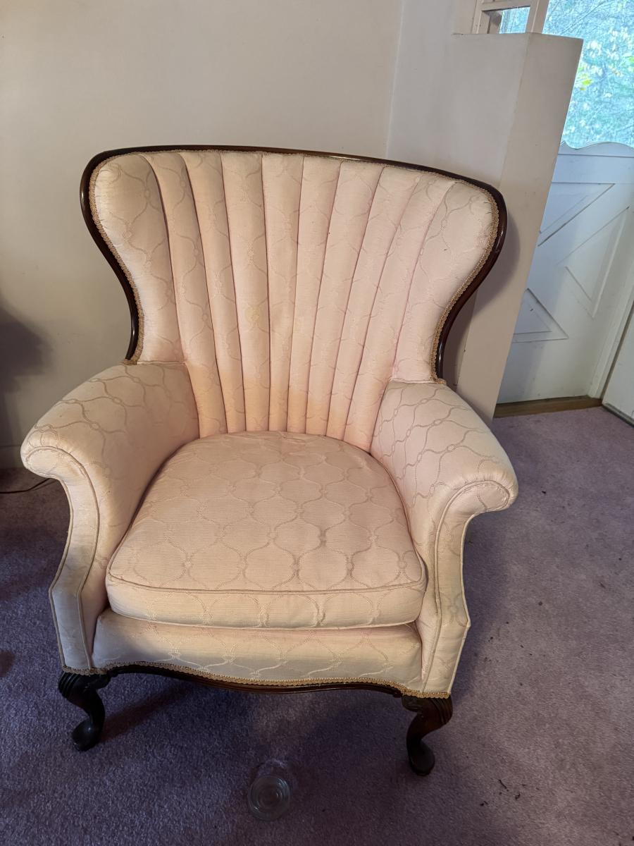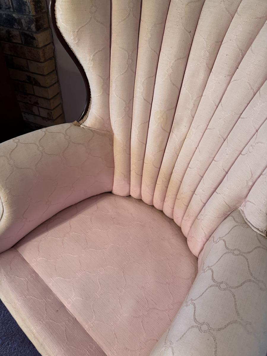 Vintage butterfly style wingback chair in pink fabric. In good condition as shown