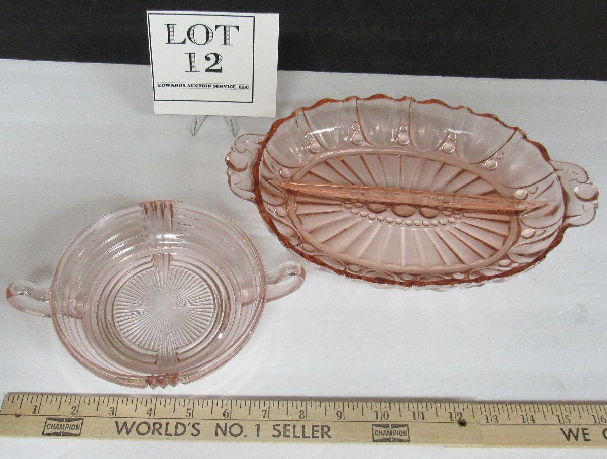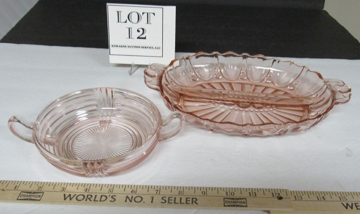 Vintage Pink Depression Glass, Handled Bowl and Oyster and Pearl Relish