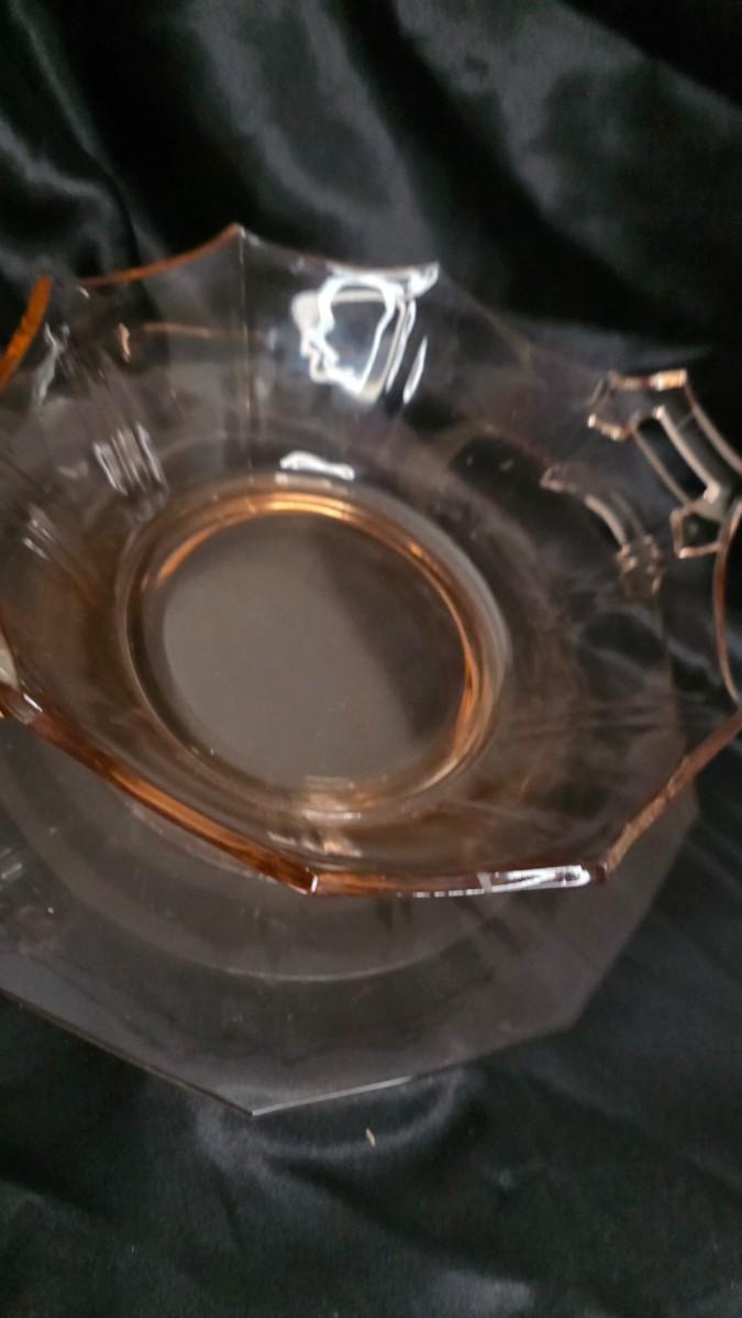 Soft, romantic color meets Depression-era craftsmanship in this elegant pink glass serving set — a matching bowl and underplate designed with a striking octagonal silhouette and geometric handles. Produced in the 1930s, pieces like this were part of the extraordinary world of Depression glass: everyday tableware made affordable during difficult times, yet crafted with unexpected beauty. This set follows the graceful lines seen in patterns attributed to Imperial Glass and similar makers of the era, where scalloped rims, faceted planes, and delicate pink tones turned simple glass into table art.