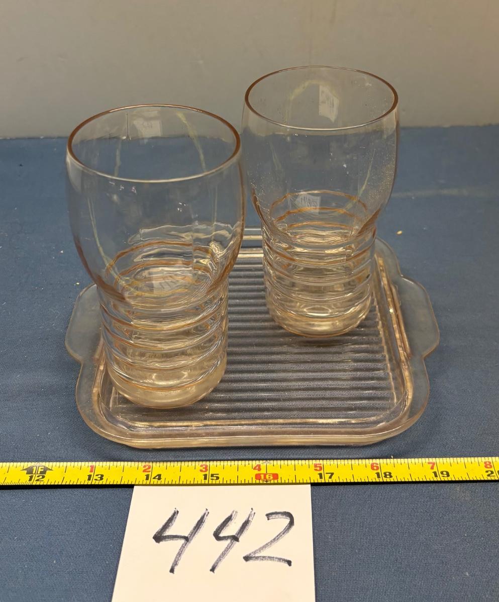Vintage Pink Depression Glass Tumblers with Tray