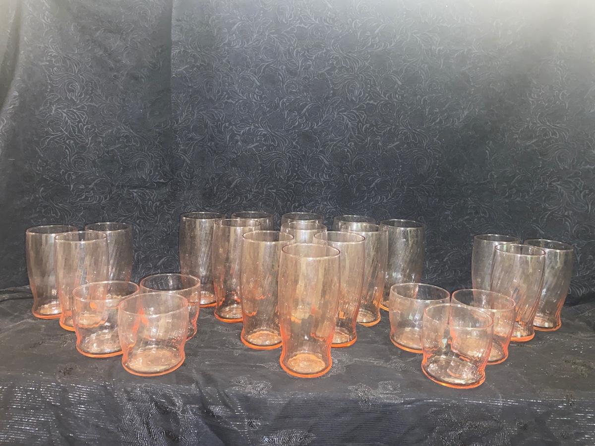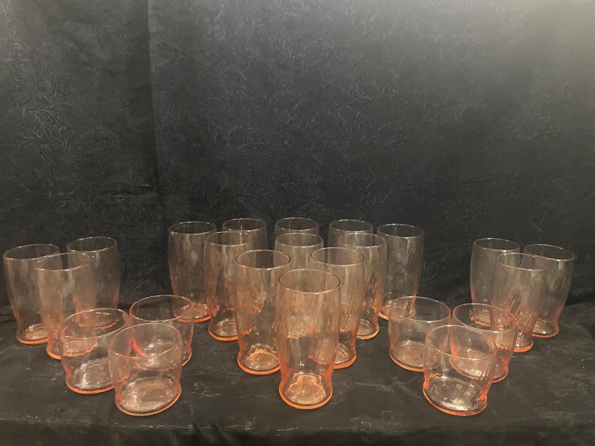 15 PINK DEPRESSION TUMBLERS AND 6 ROCKS GLASSES