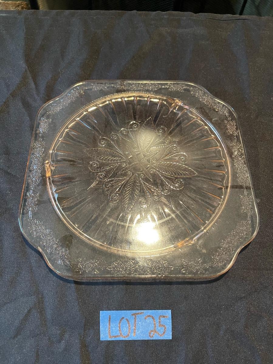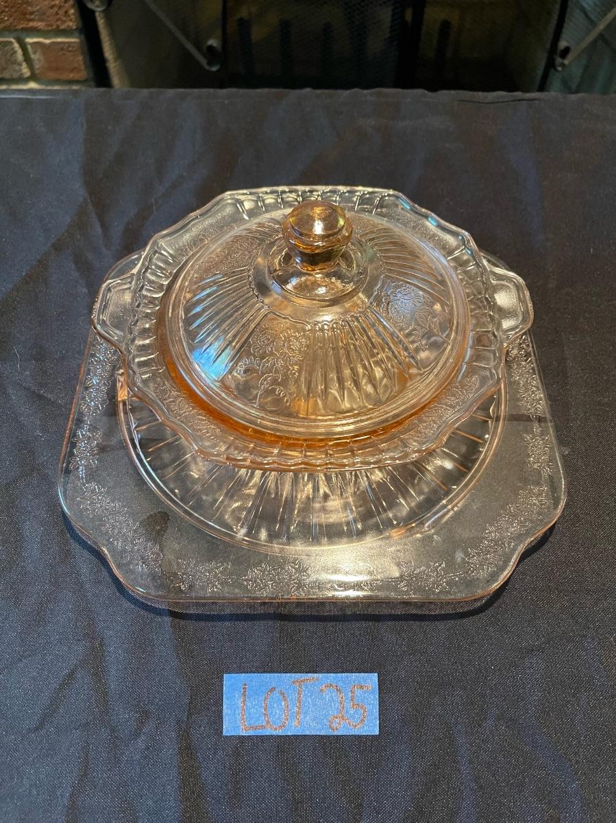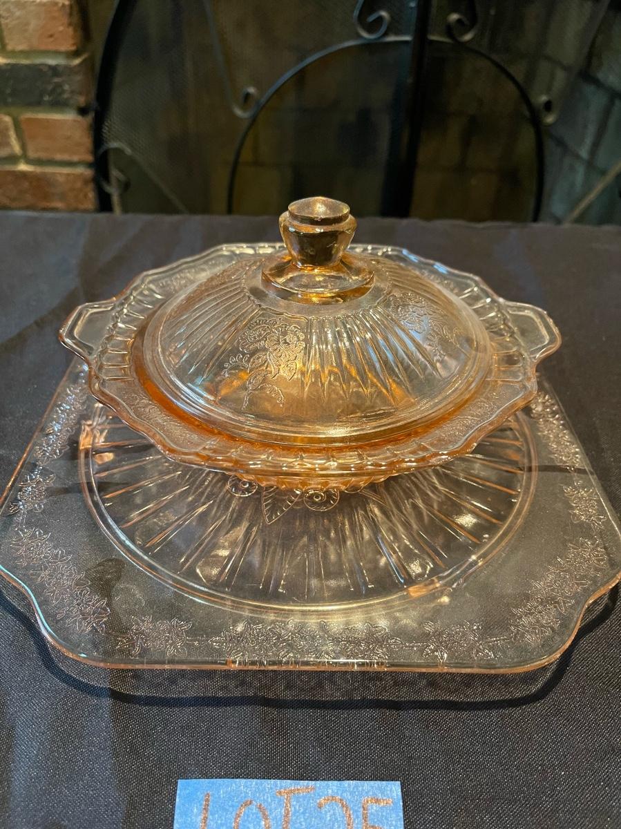 Vintage Pink Etched Depression Glass Platter + dish w/ lid.