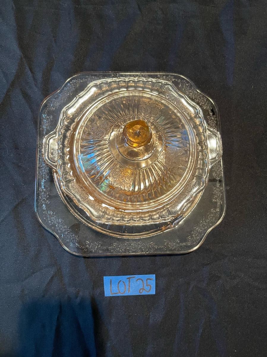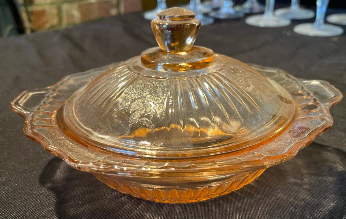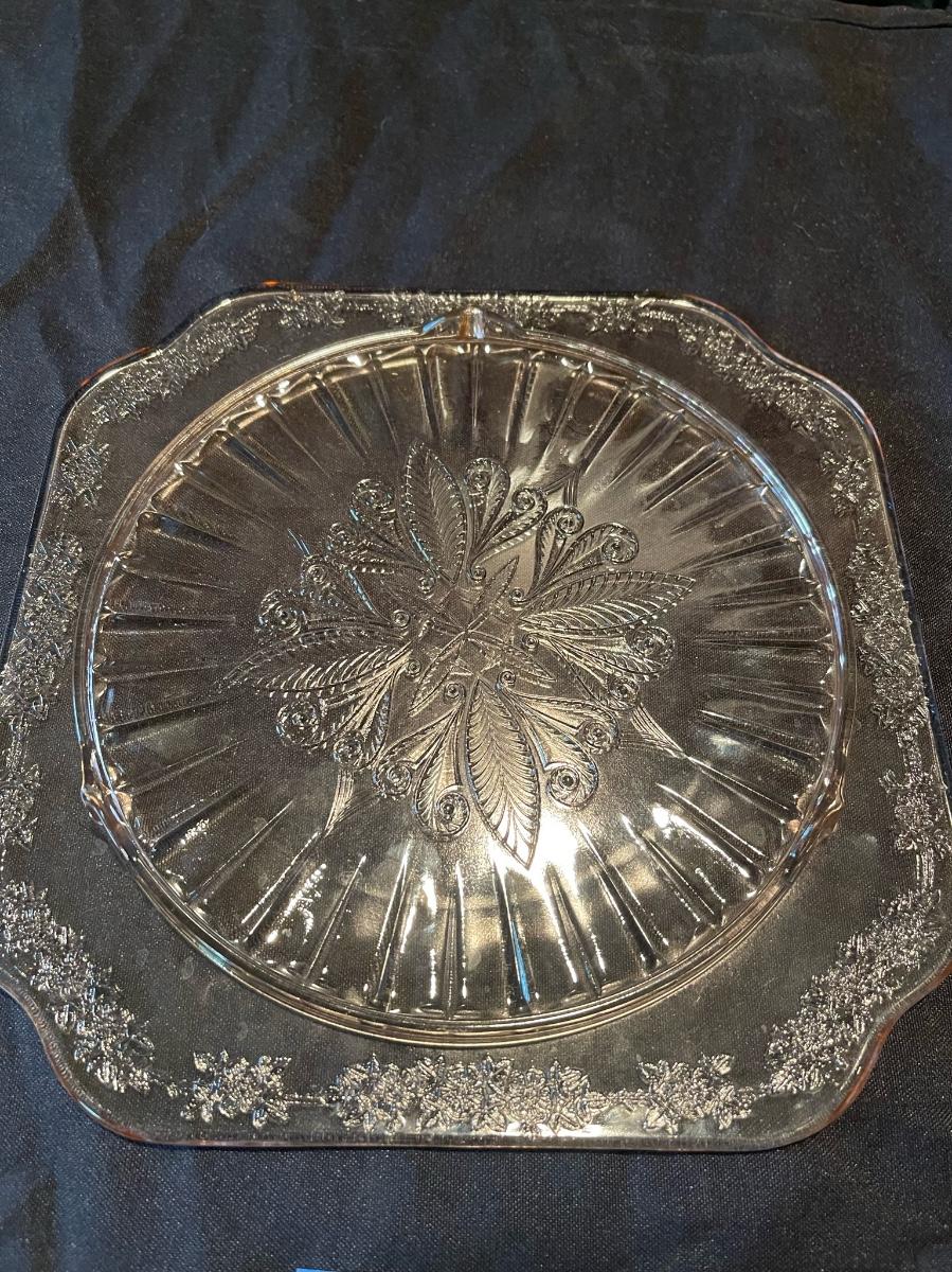 Vintage Pink Etched Depression Glass Platter + dish w/ lid.