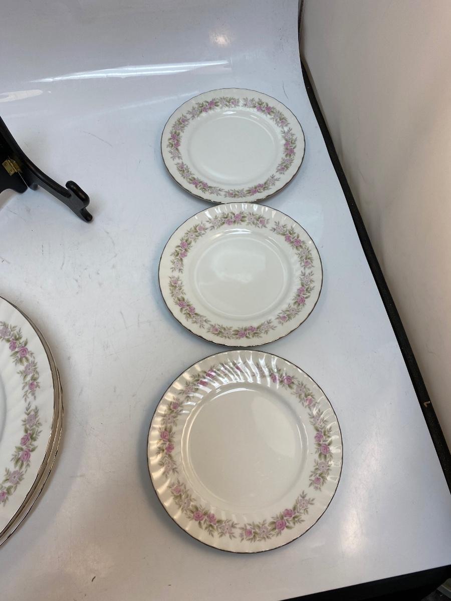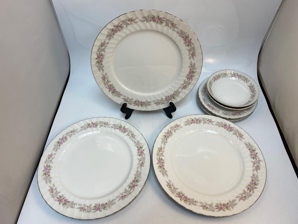 Vintage Pink Floral Teahouse Rose Dansico Collection Fine China Dishware Plates Fruit Bowls, Three dinner plates, three bread plates, and two fruit bowls. All in good condition with no chips. Made in Japan.
