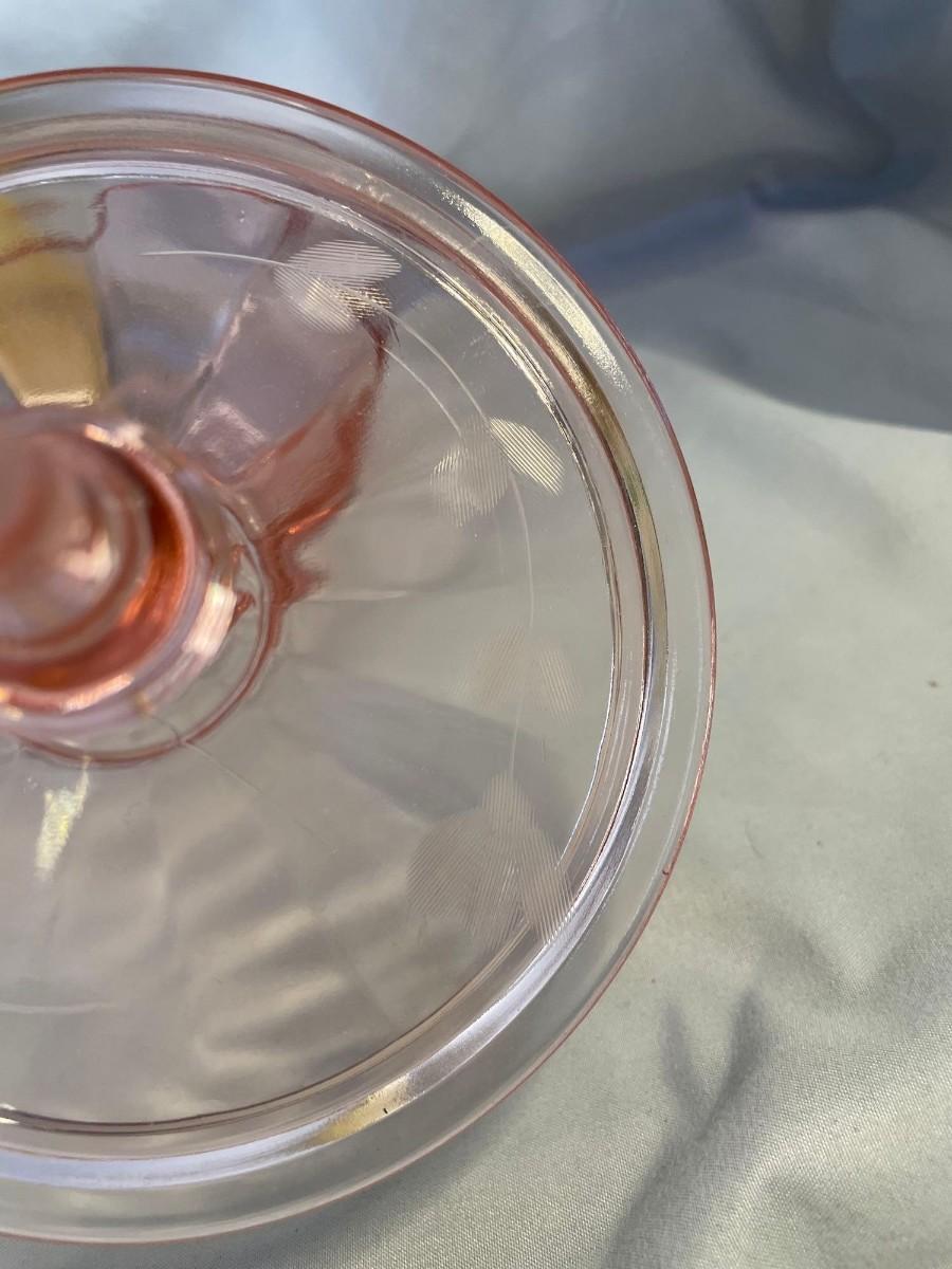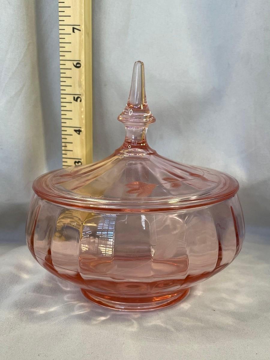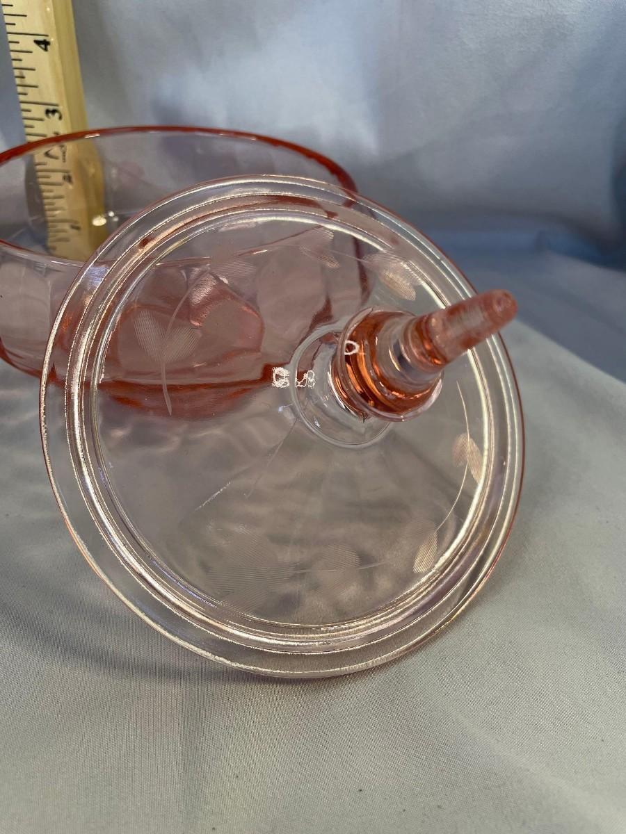 This candy dish is in excellent condition and has etched flowers on the lid. No issues found.<br />