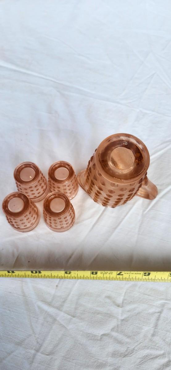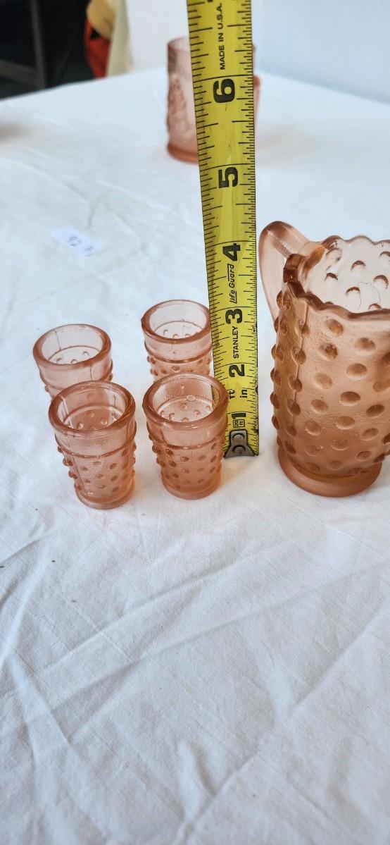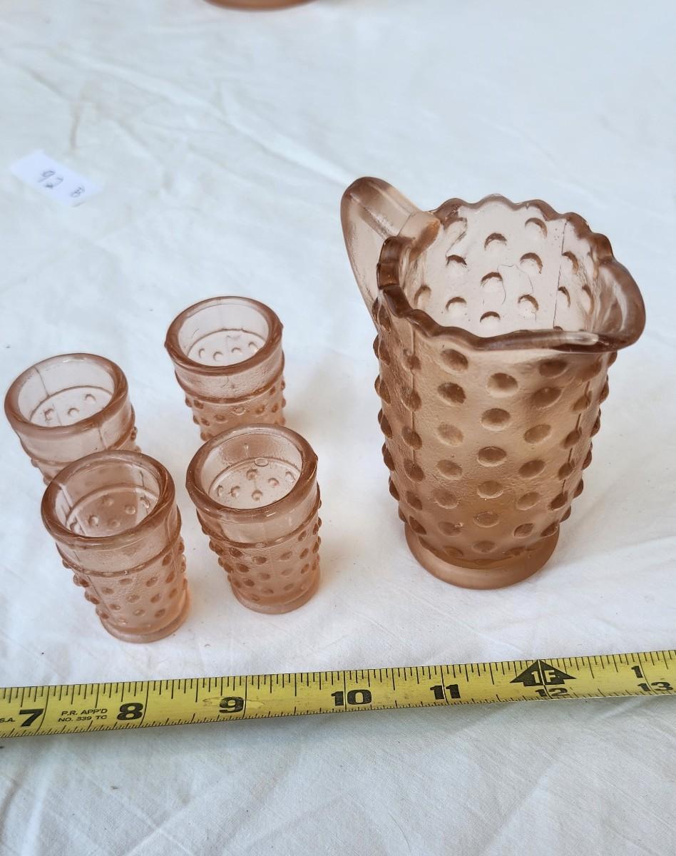 Miniature Pink Glass PITCHER and 4 Drinking GLASSES