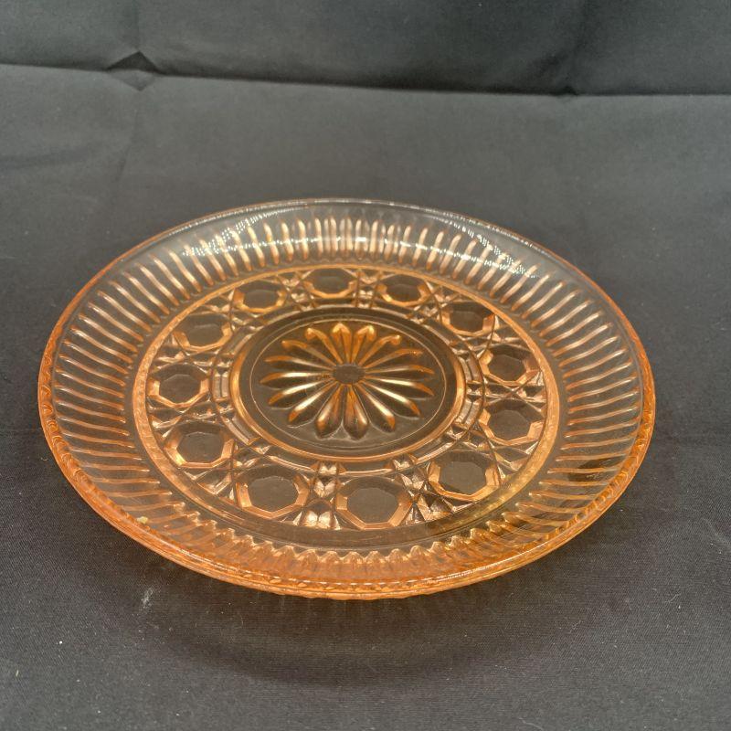 Pressed glass with numerous designs and a starburst pattern on the bottom. Unique item, potentially for storing candy, or adorable on a bedside table holding your jewelry.