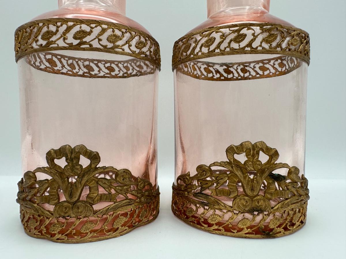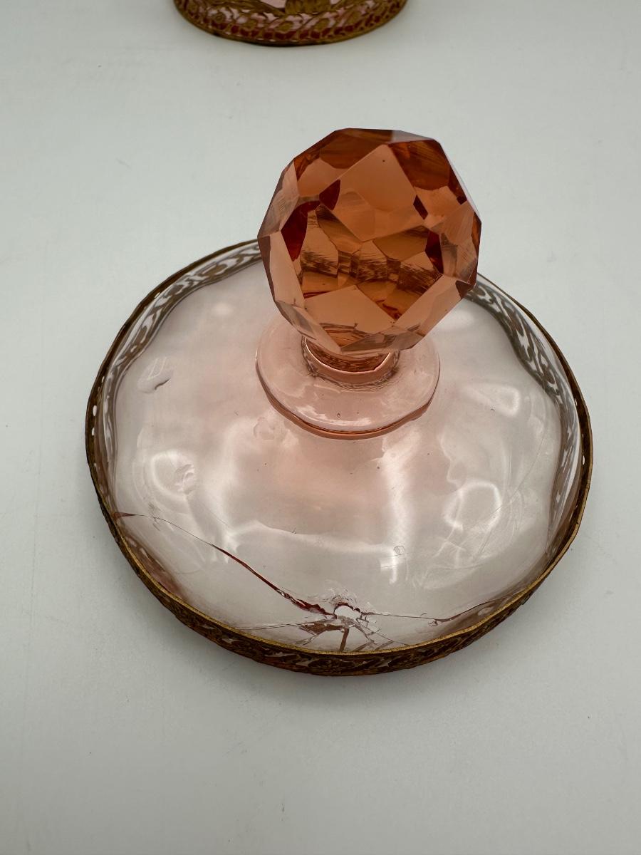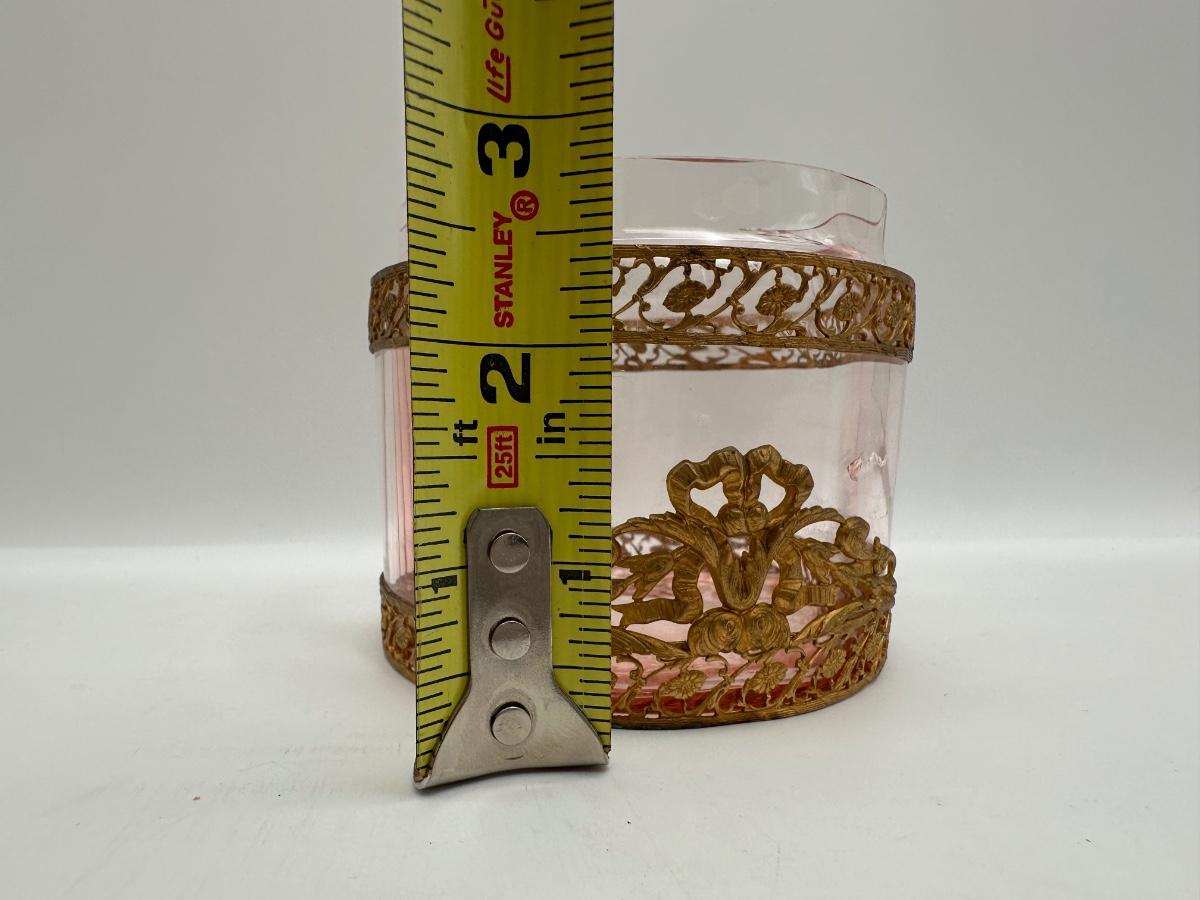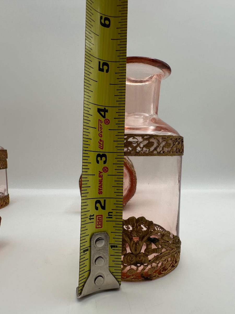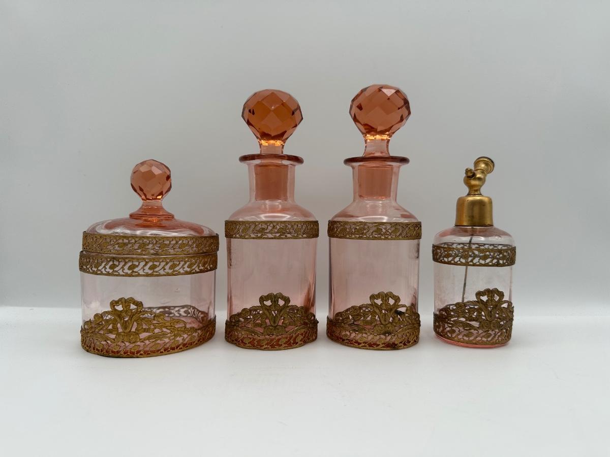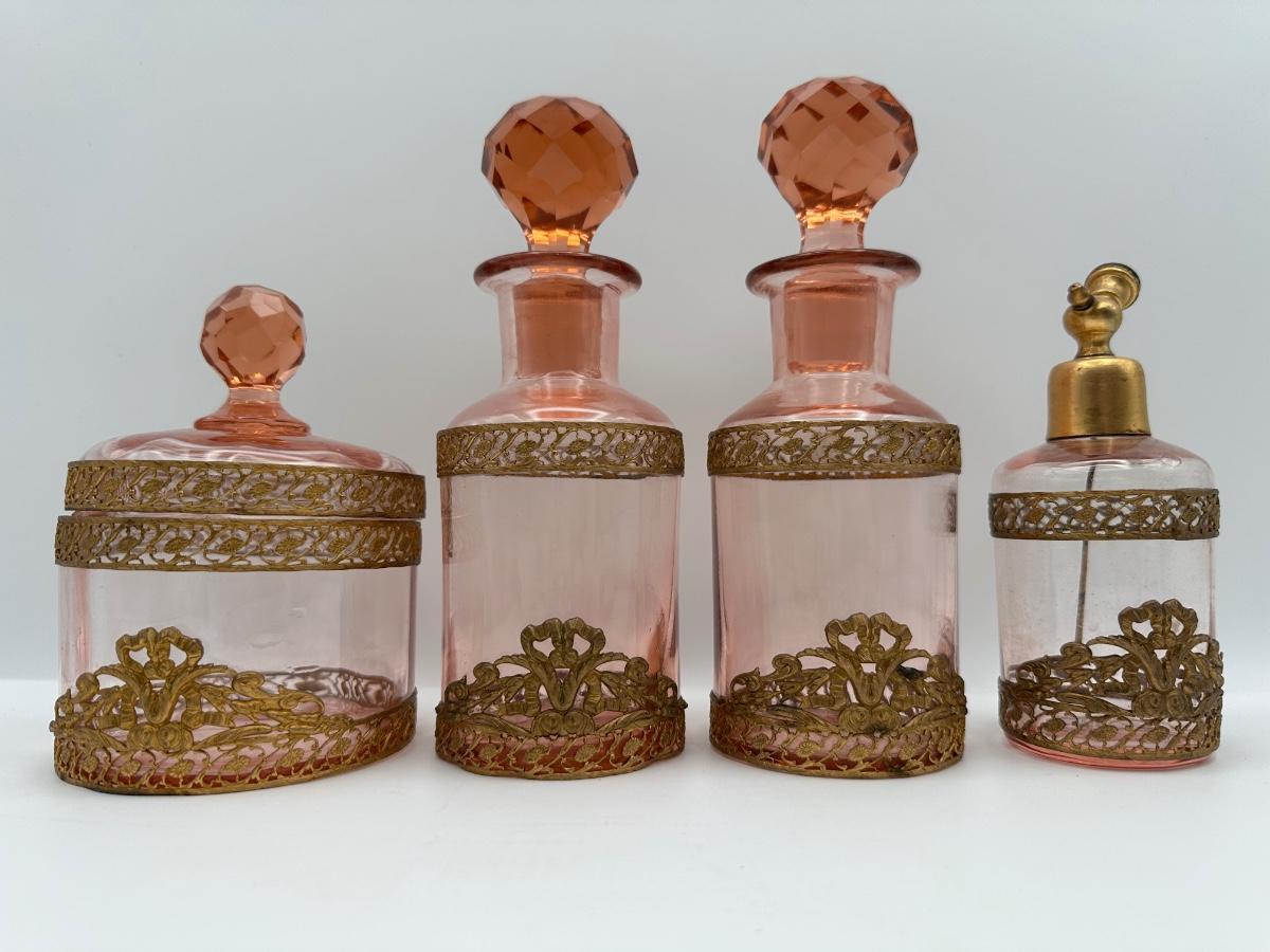 Vintage Pink Glass Vanity Dresser Set with Gilt Filigree.