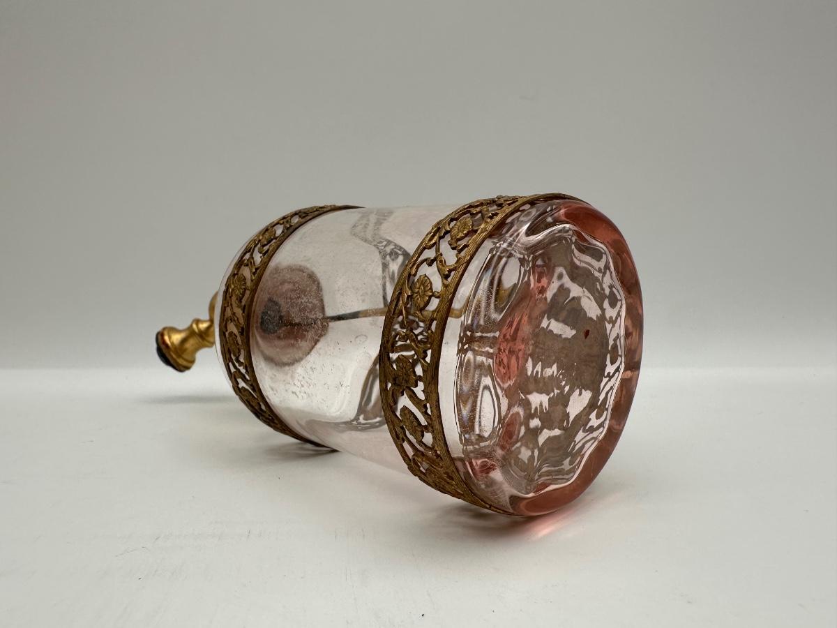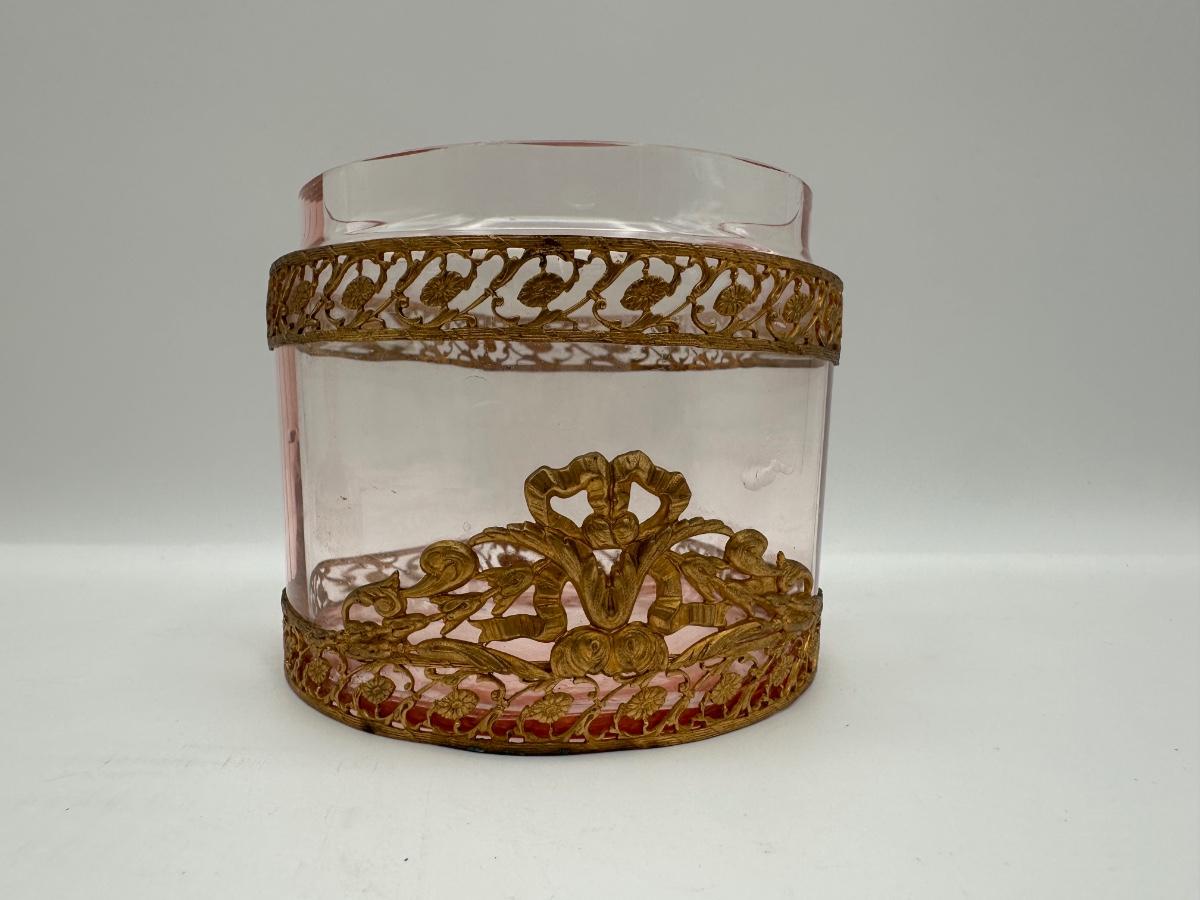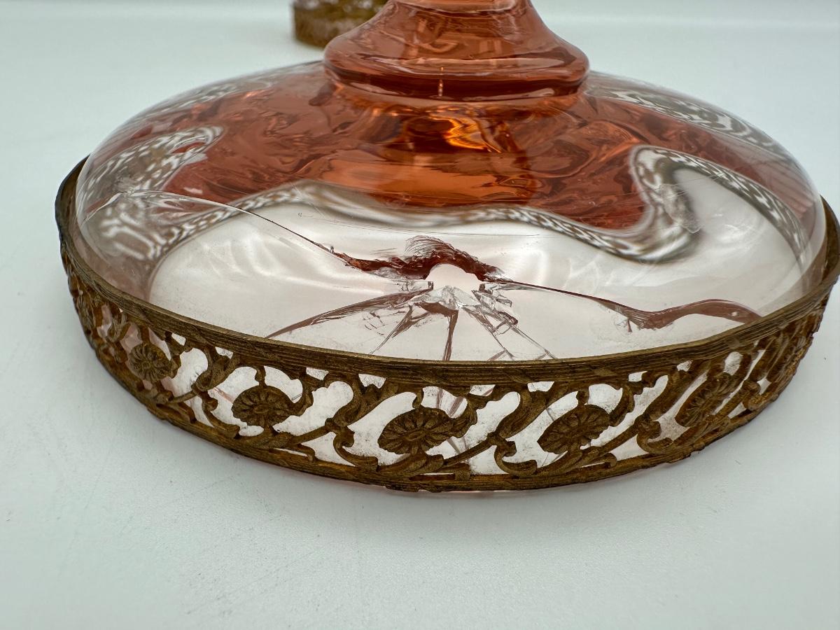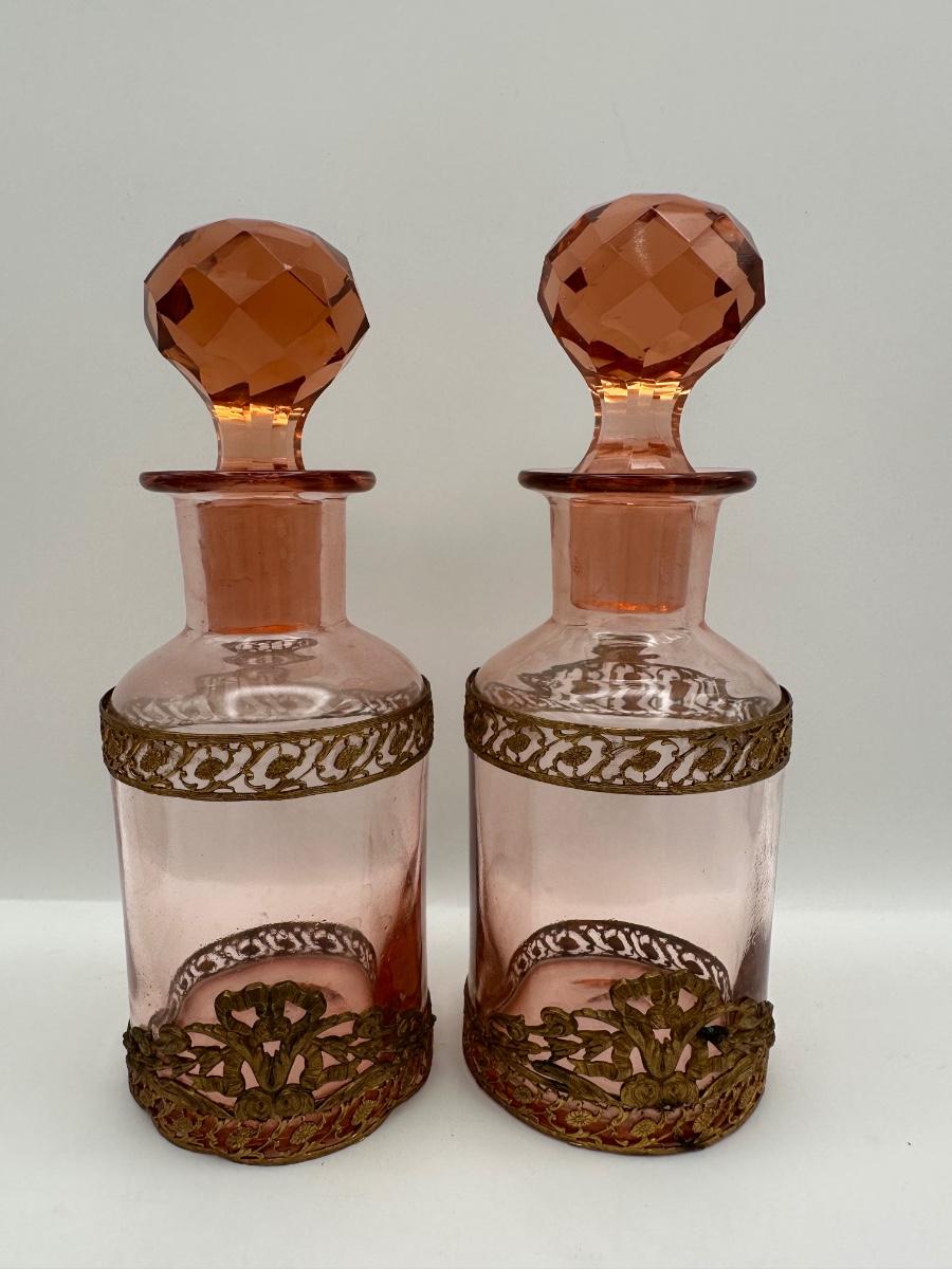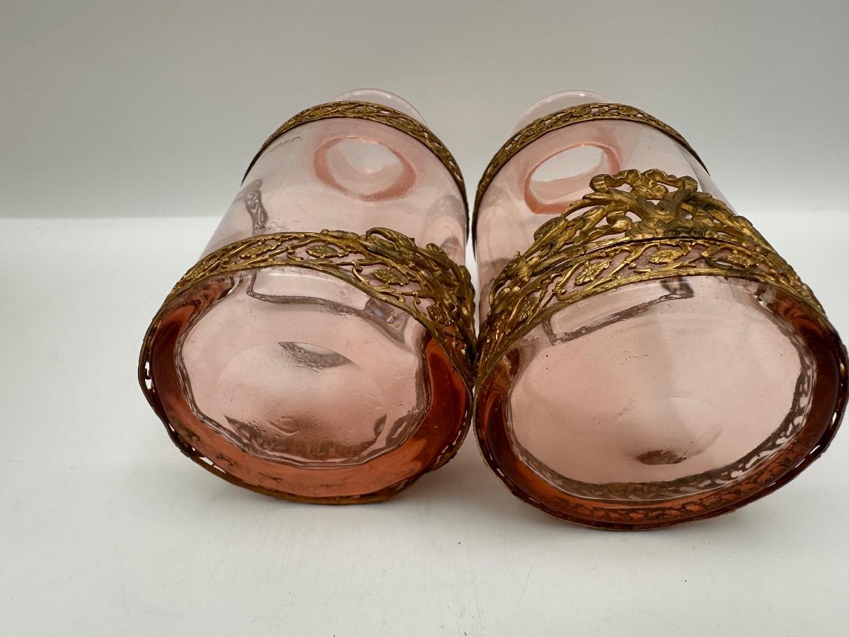 Vintage Pink Glass Vanity Dresser Set with Gilt Filigree.