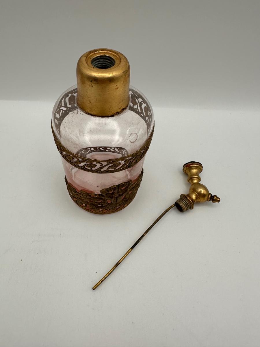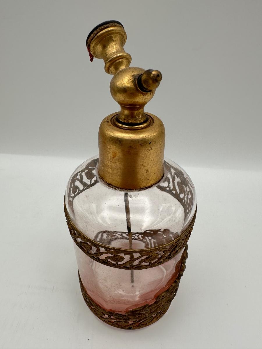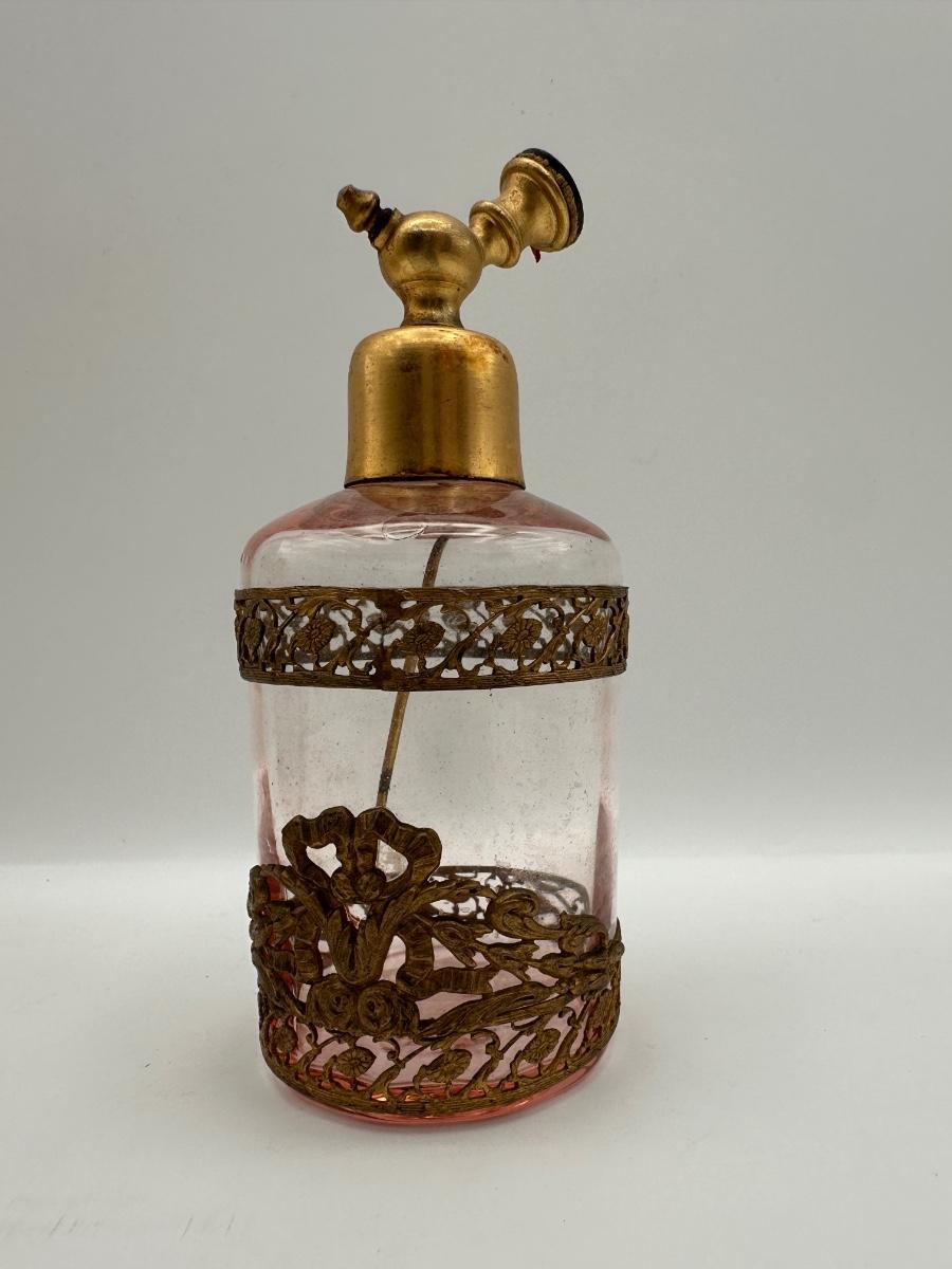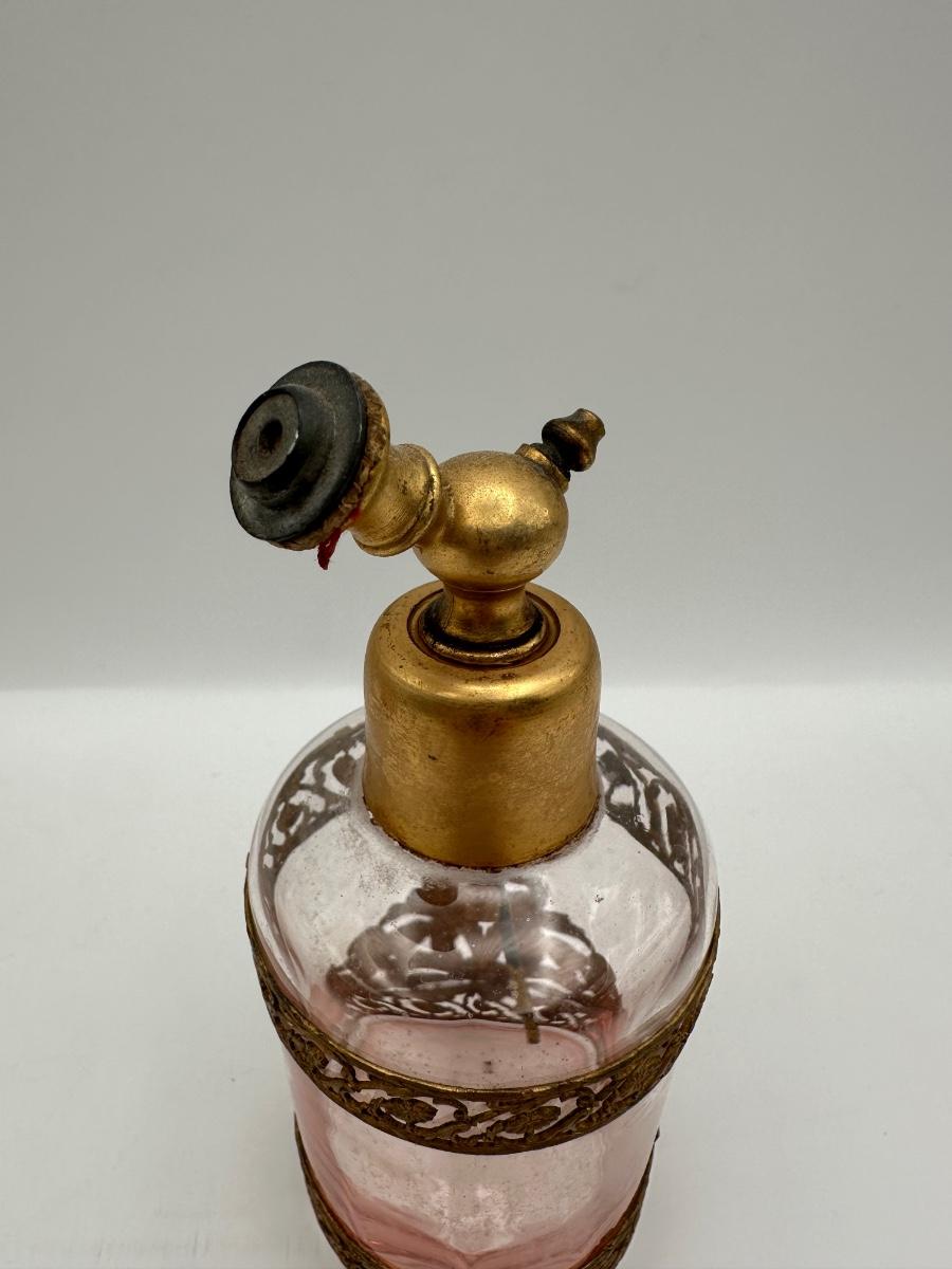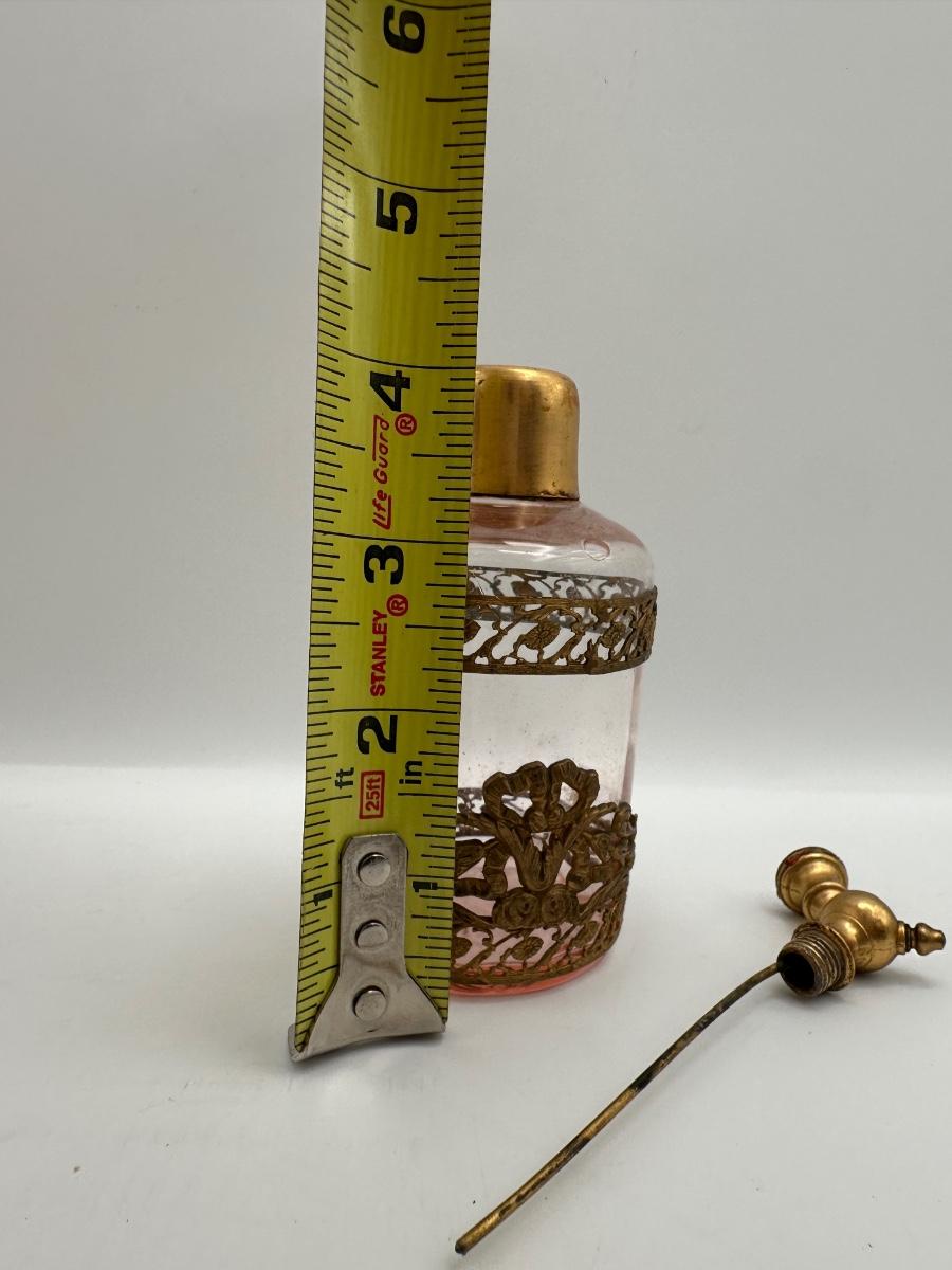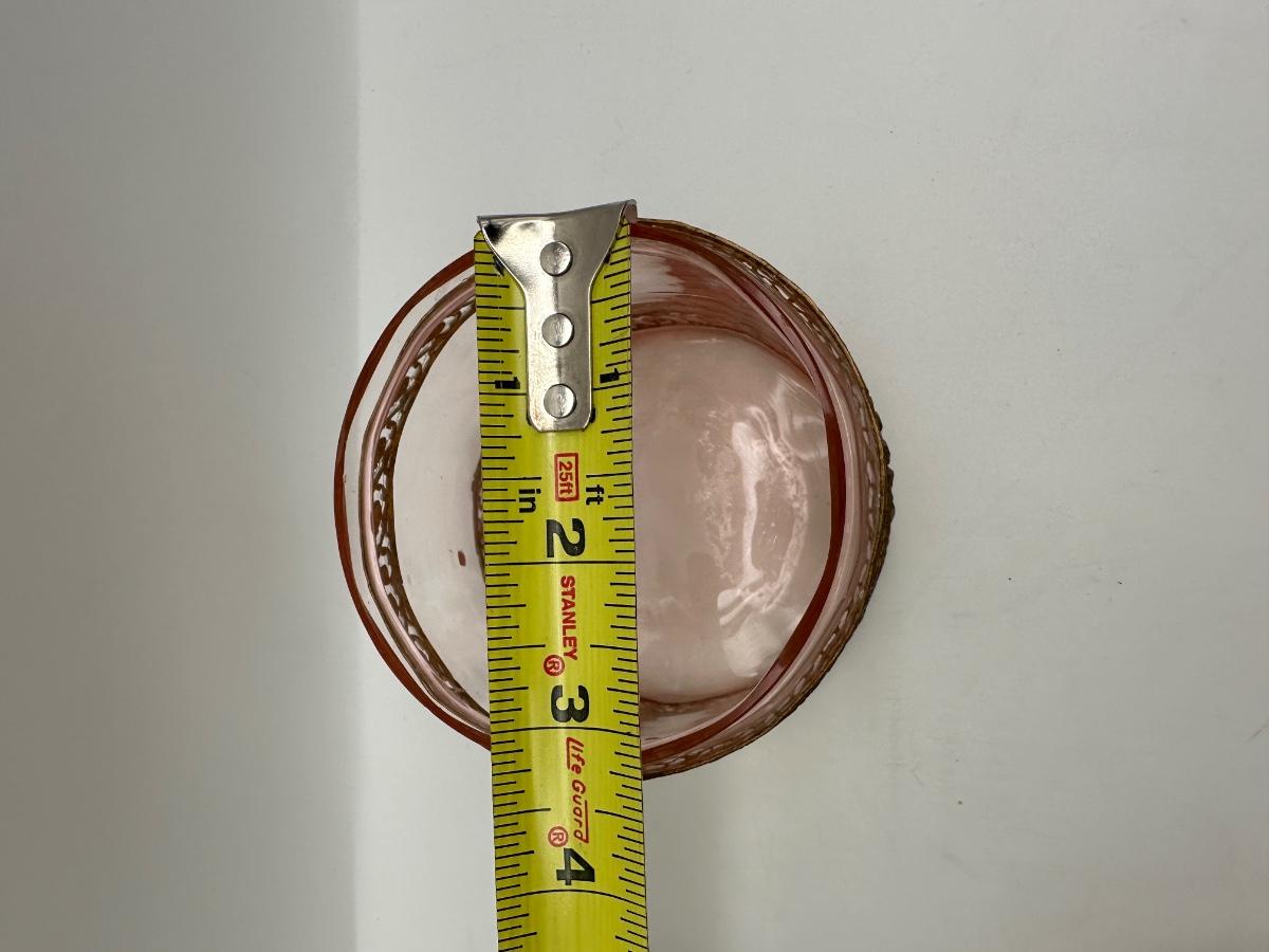 Vintage Pink Glass Vanity Dresser Set with Gilt Filigree.