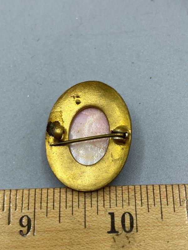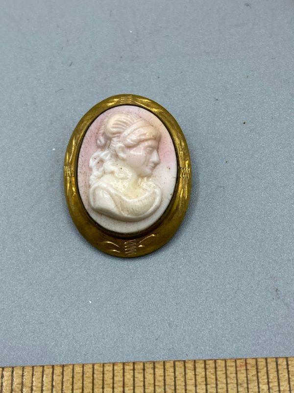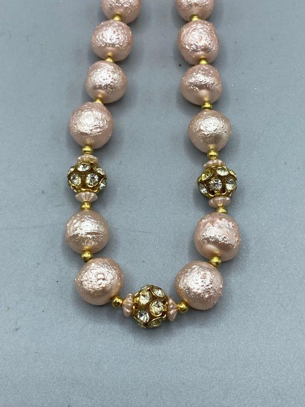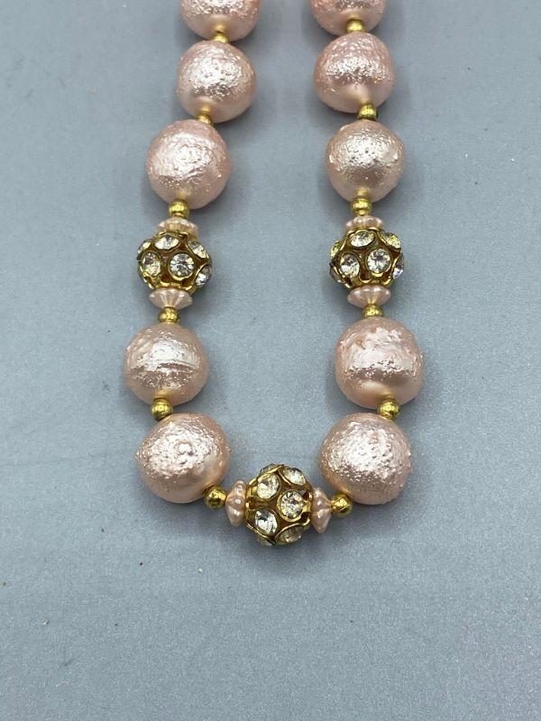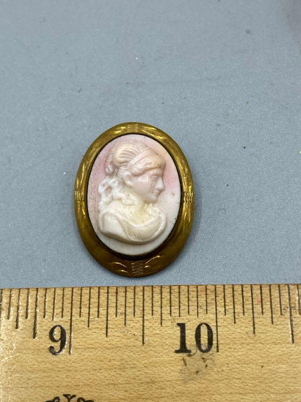 Vintage jewelry lot, shades of pink. Cameo style pin, a carved brooch and a texture bead choker necklace. Great additions to a collection.