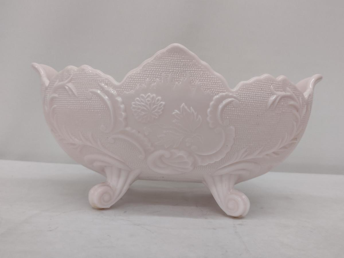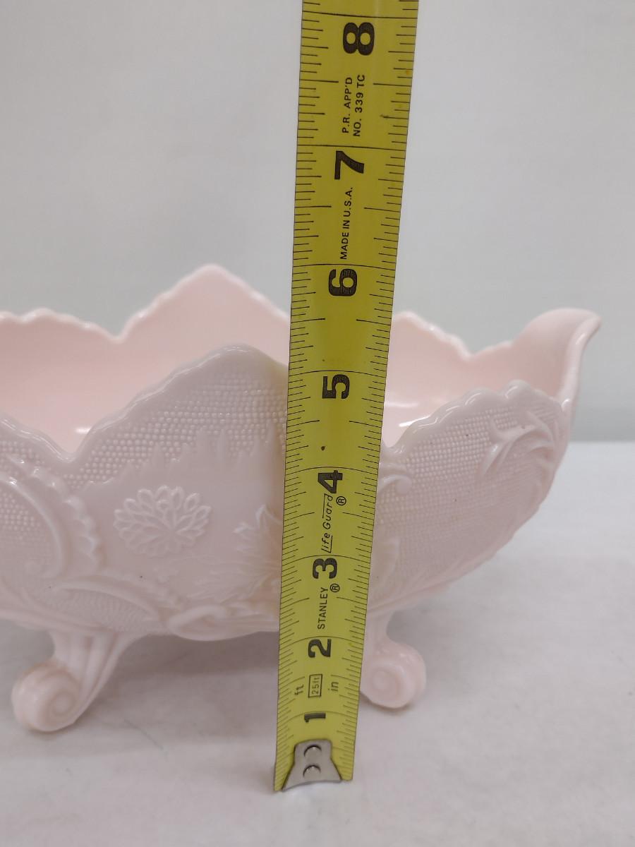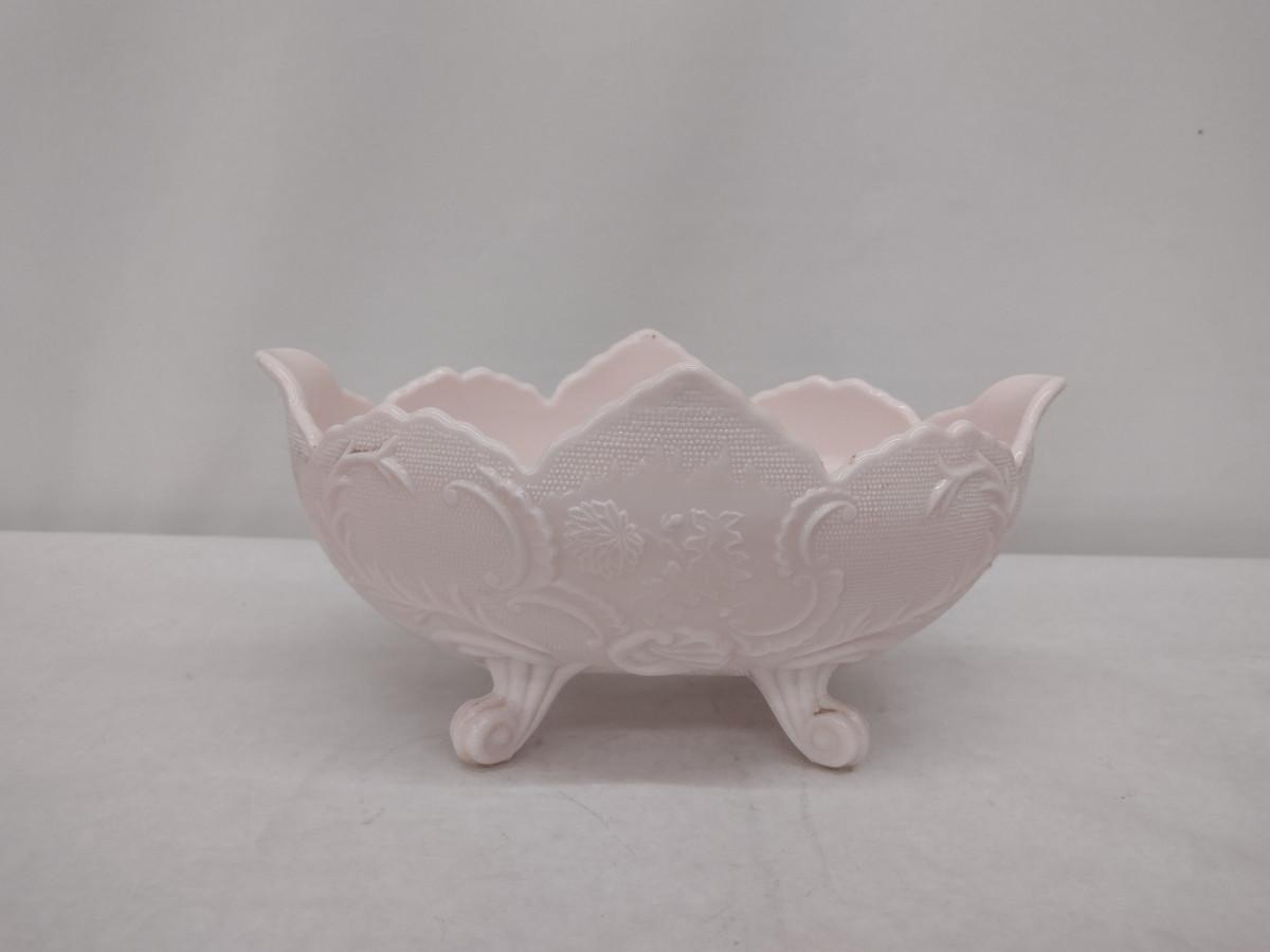 Vintage Pink Milk Glass Jeanette Lombardi Oval Footed Fruit Bowl. Approx 10 3/4" long. Item appears to be in good condition.