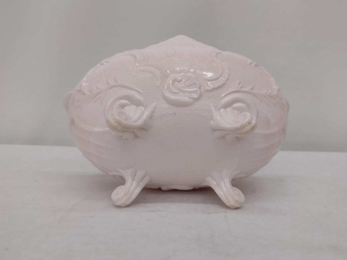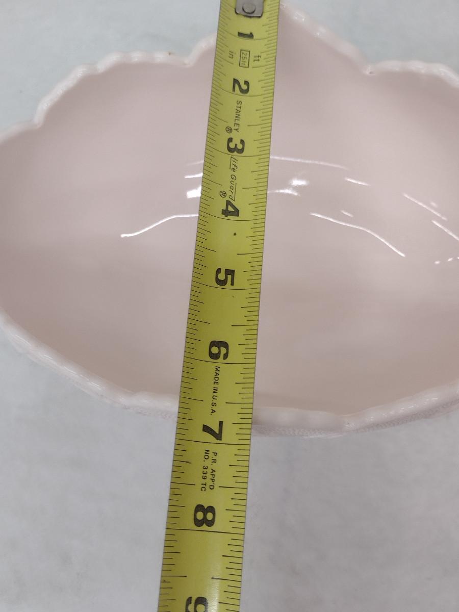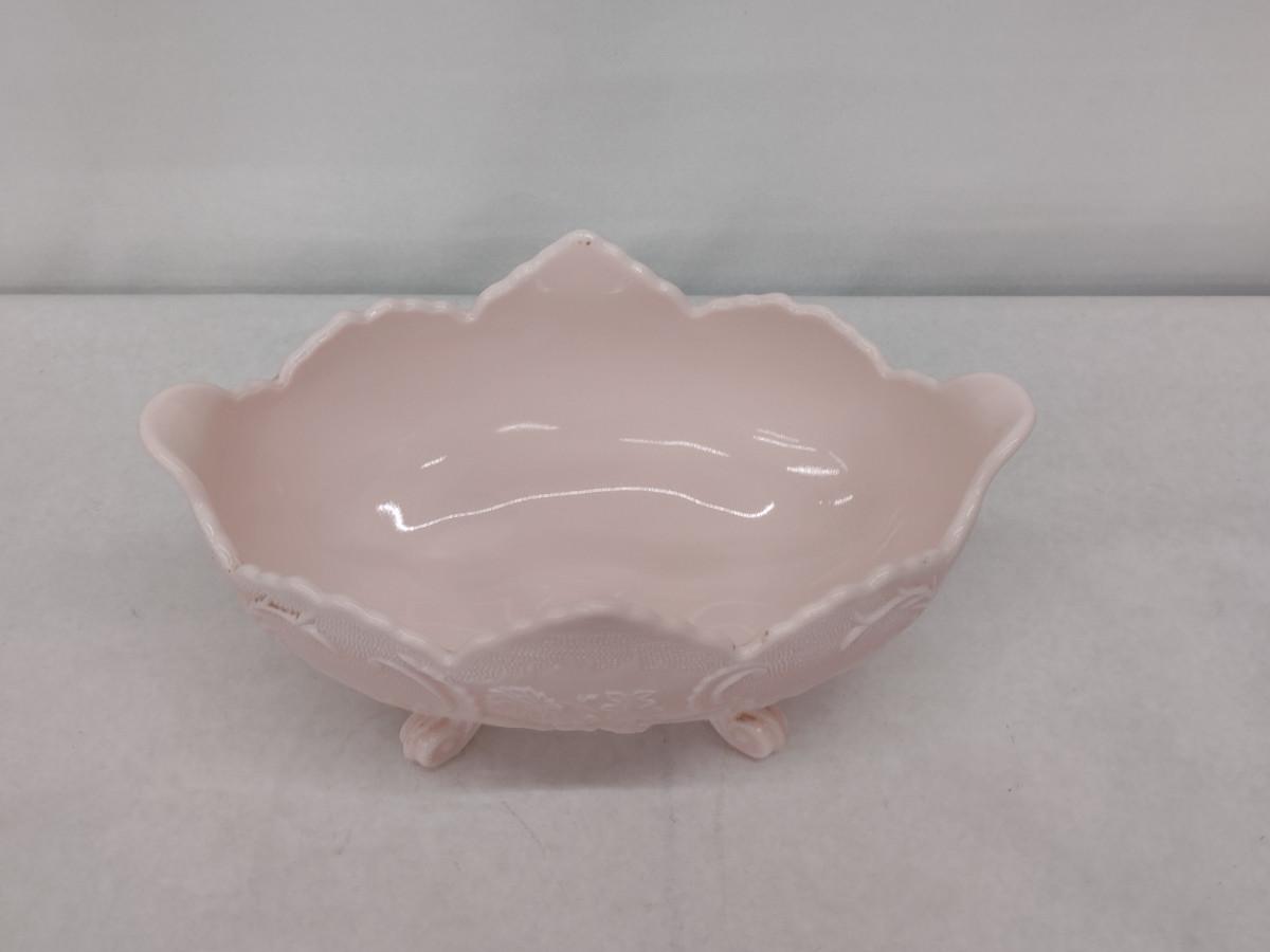 Vintage Pink Milk Glass Jeanette Lombardi Oval Footed Fruit Bowl. Approx 10 3/4" long. Item appears to be in good condition.