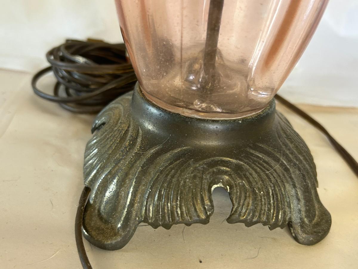 This lovely table lamp is made of pink glass with a pearl shade and brass base. Its delicate design adds a touch of class to any space.