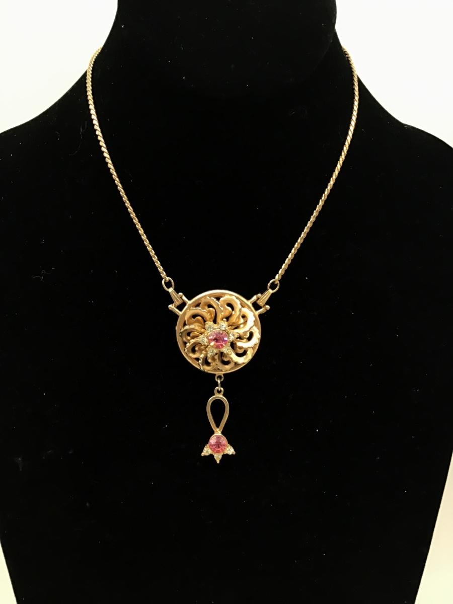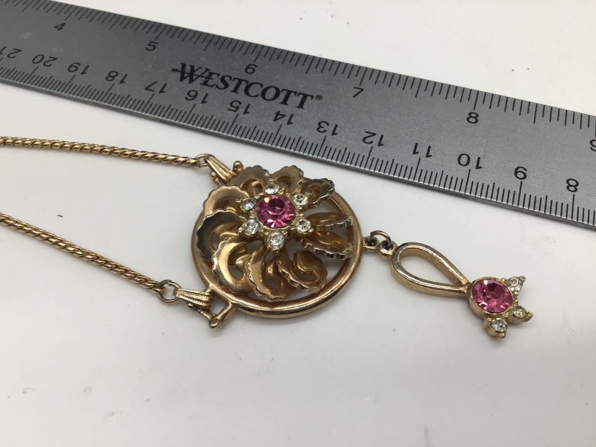 Vintage Pink rhinestone crystal Necklace Gold Tone