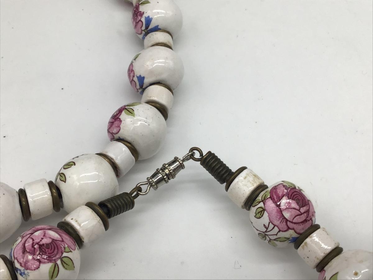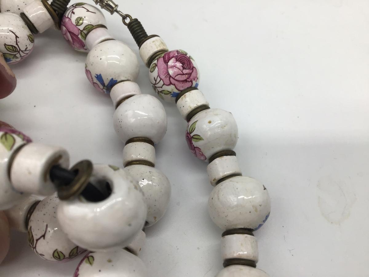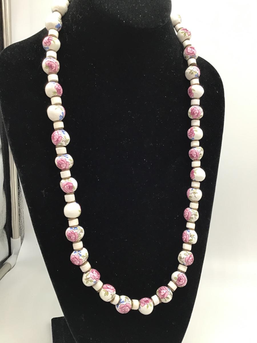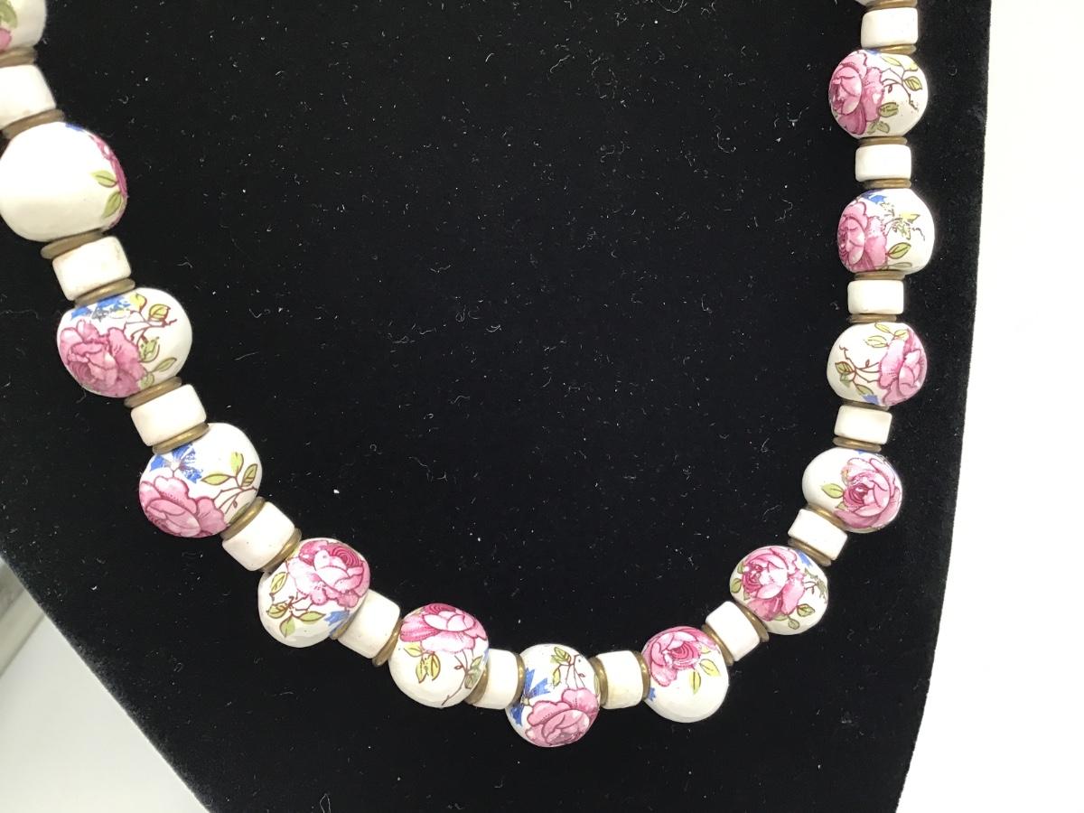 Vintage Pink Rose Floral Porcelain Ceramic Beads Necklace Fabric Chain