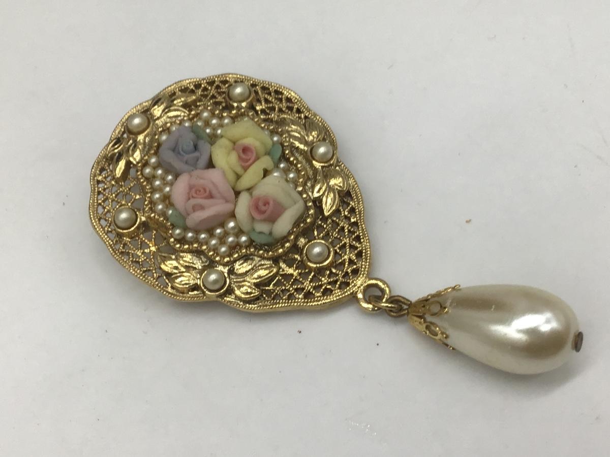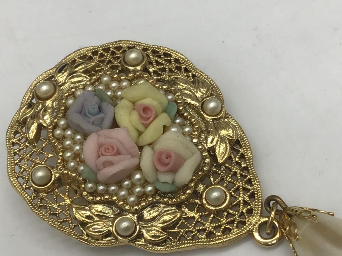 Vintage Pink Rose Flower Cameo Brooch Pin Porcelain