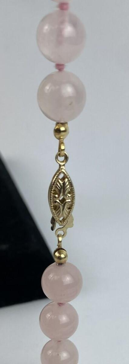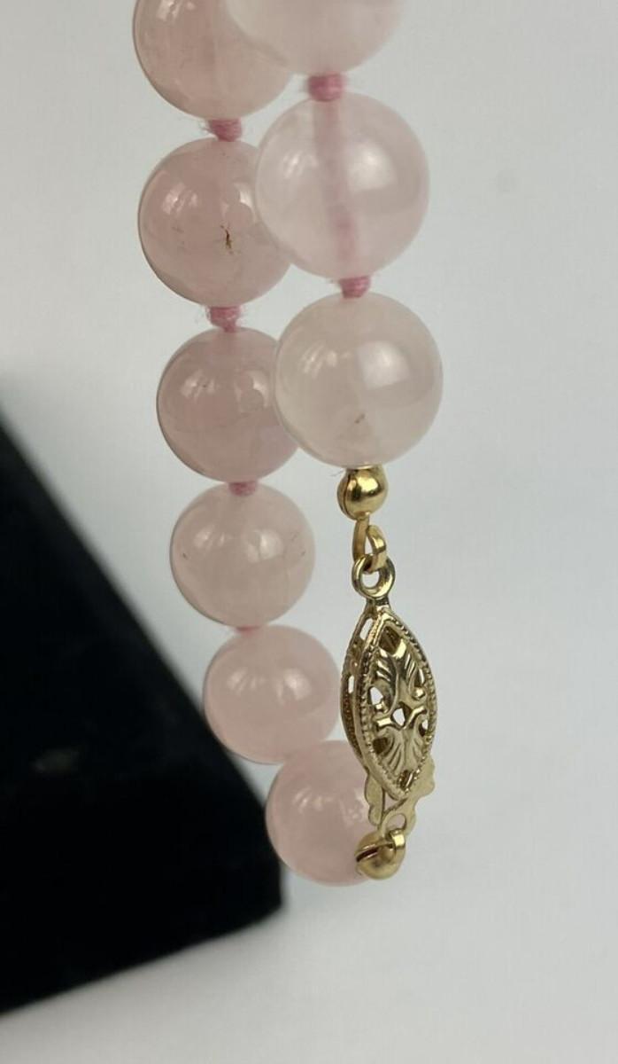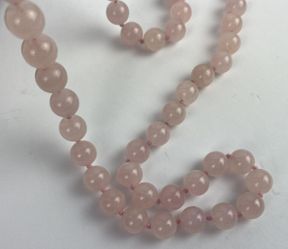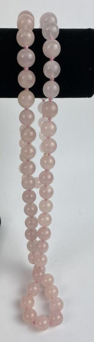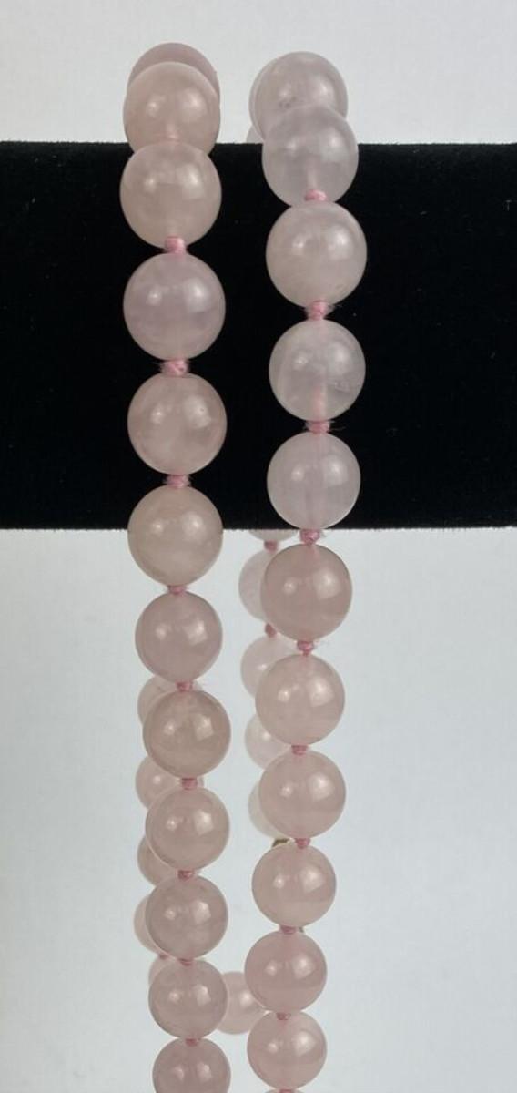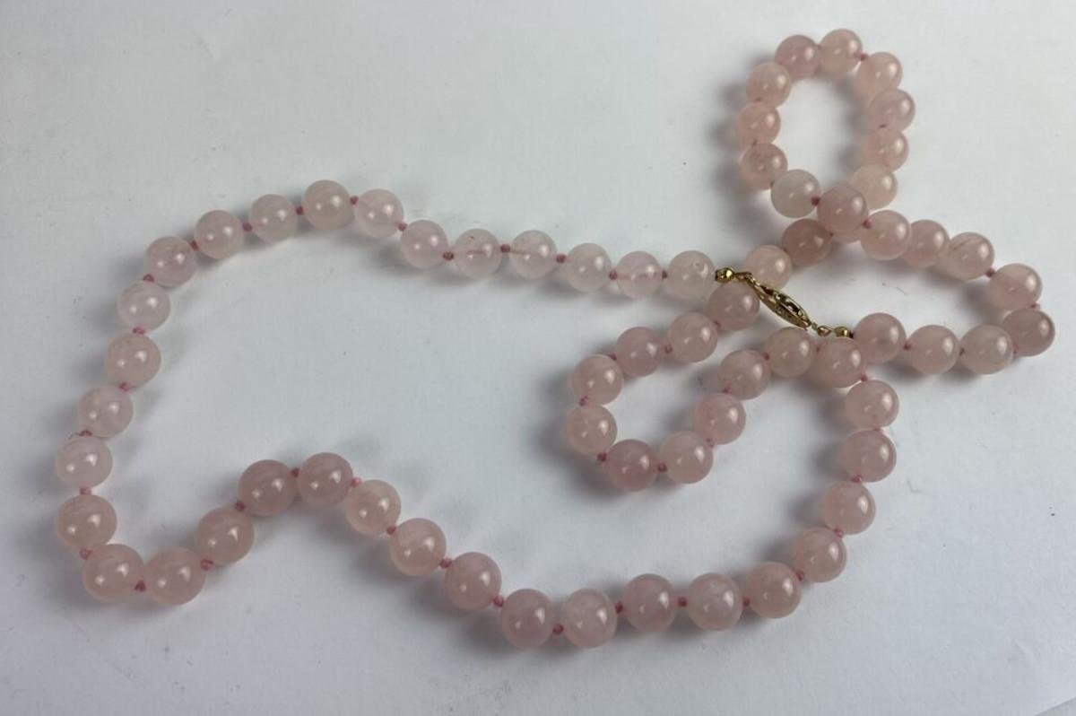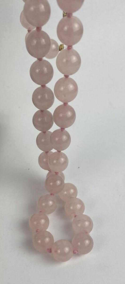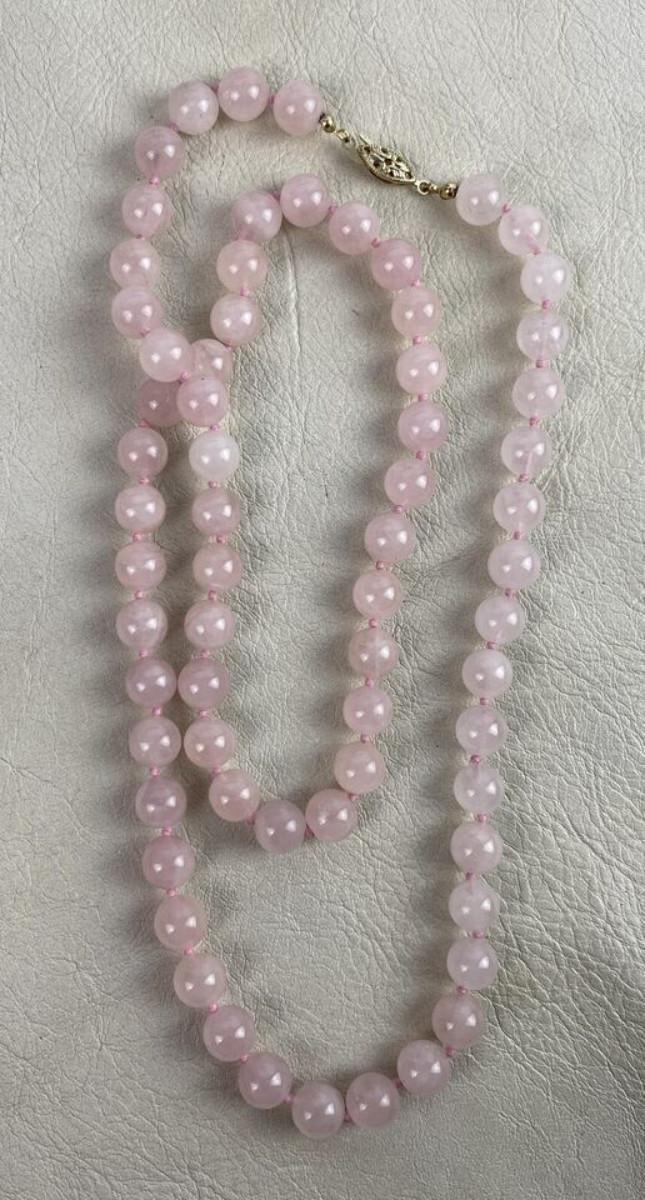 Subtle, pale pink rose quartz beaded necklace. Gold plated clasp...as shown..knotted..31 inches long...11mm beads...Unknown maker on this estate jewelry…