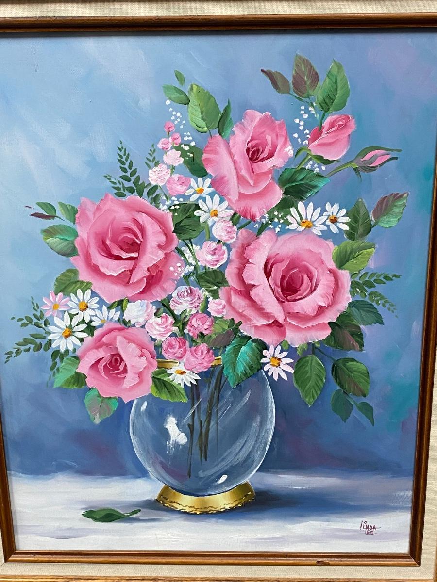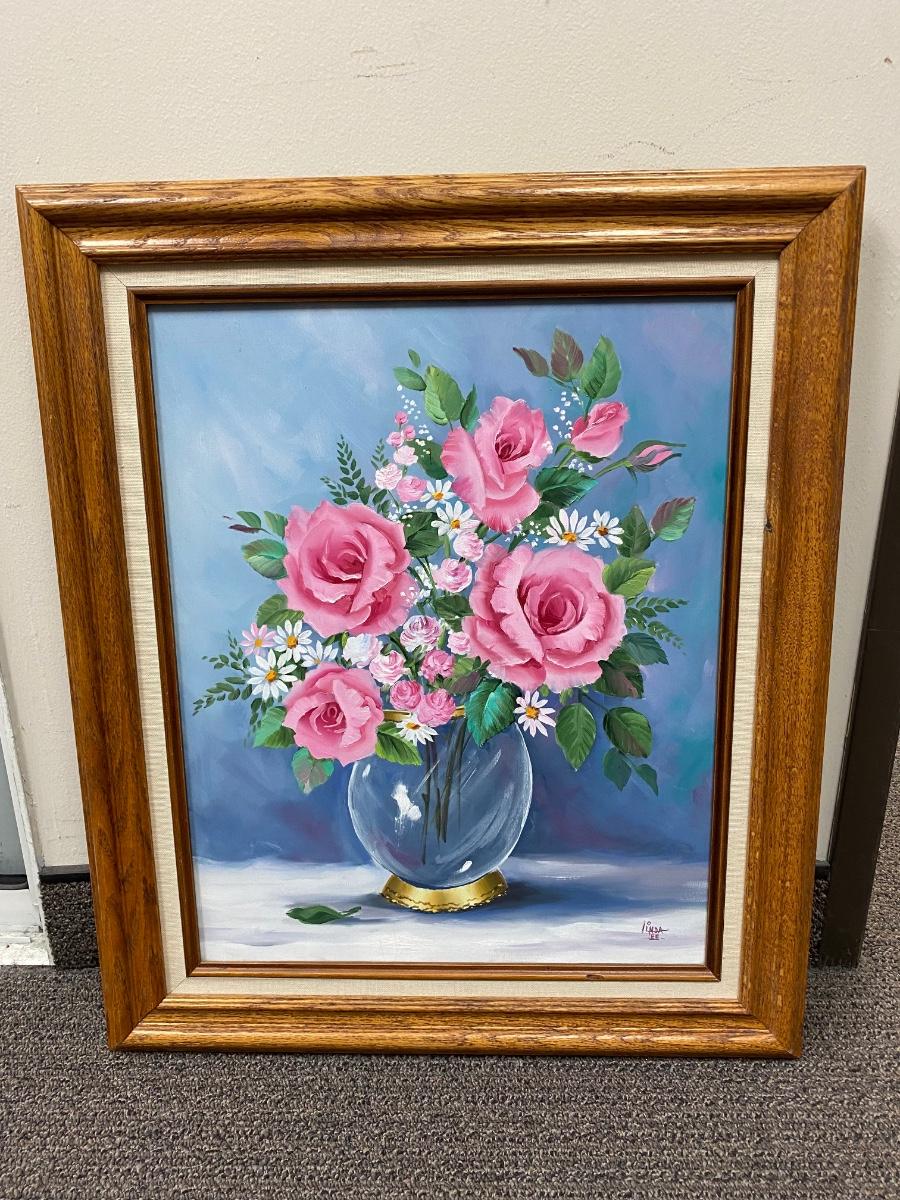 Pink roses in vase oil painting. Wood frame, artist signed. Vibrant colors, nicely done. Roughly 22"x26" size.