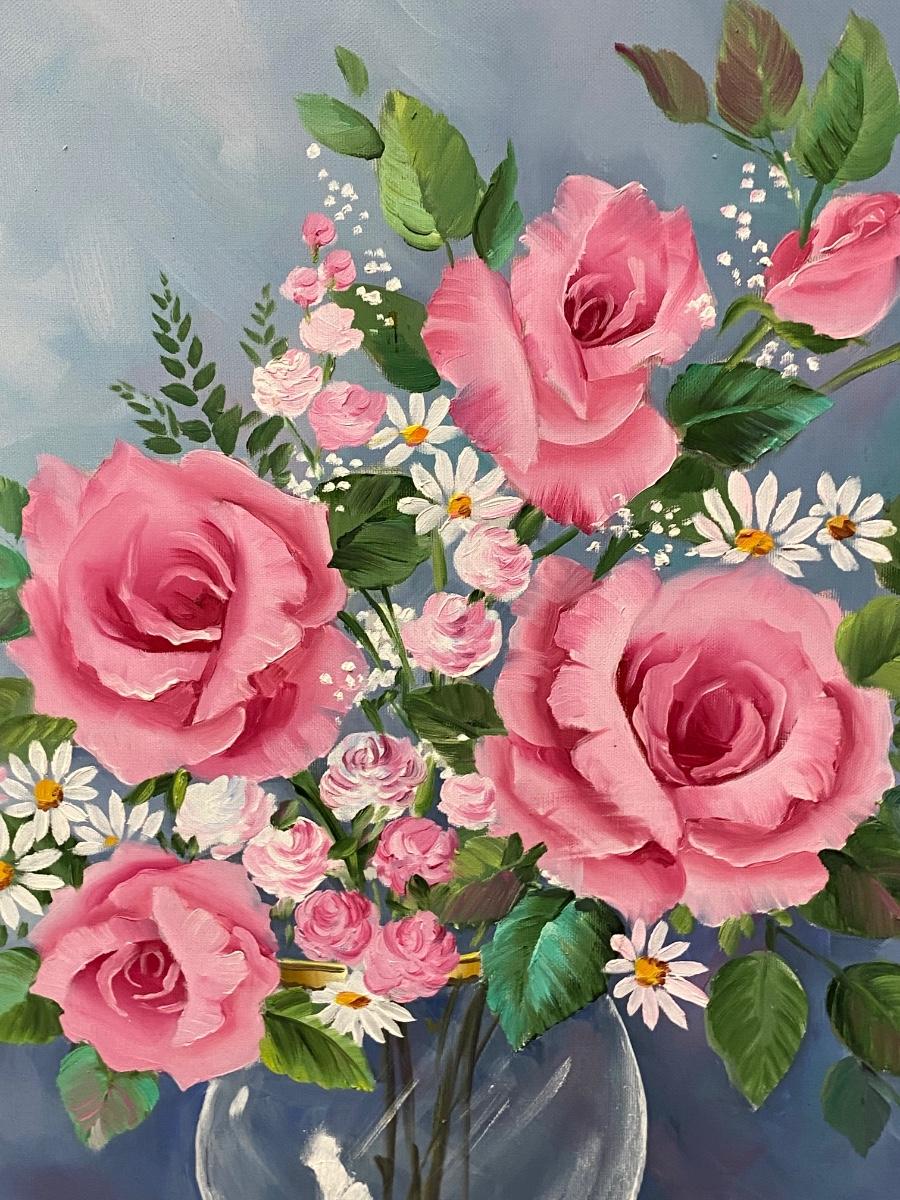 Vintage Pink Roses in Vase Oil Painting Wall Art