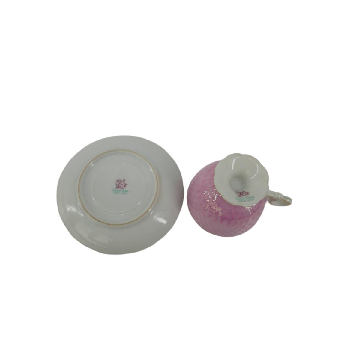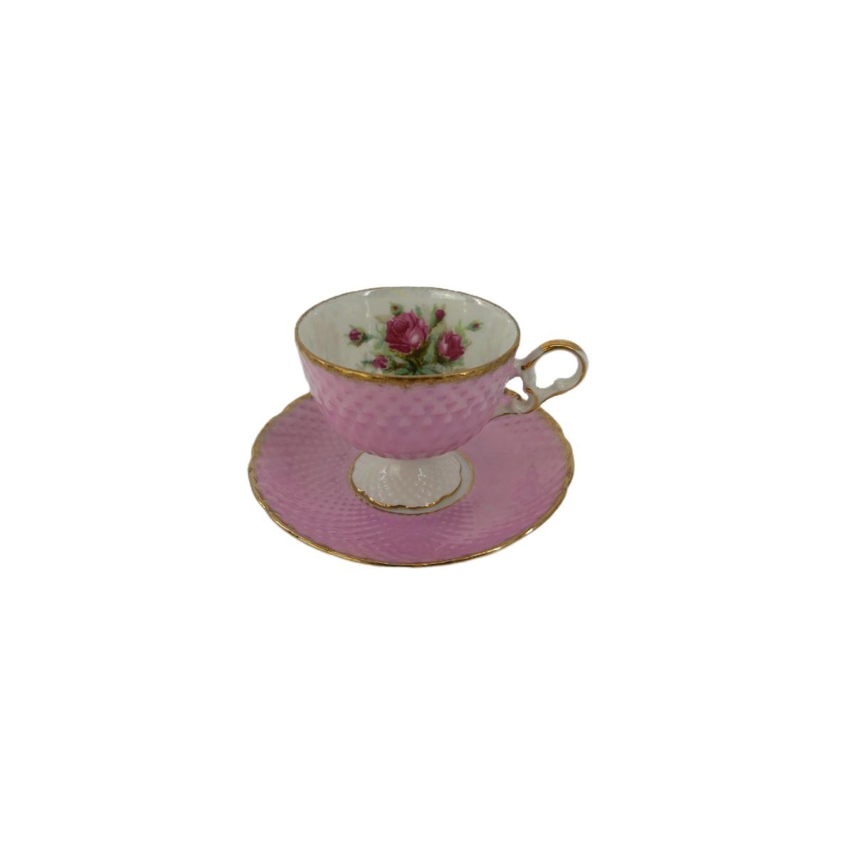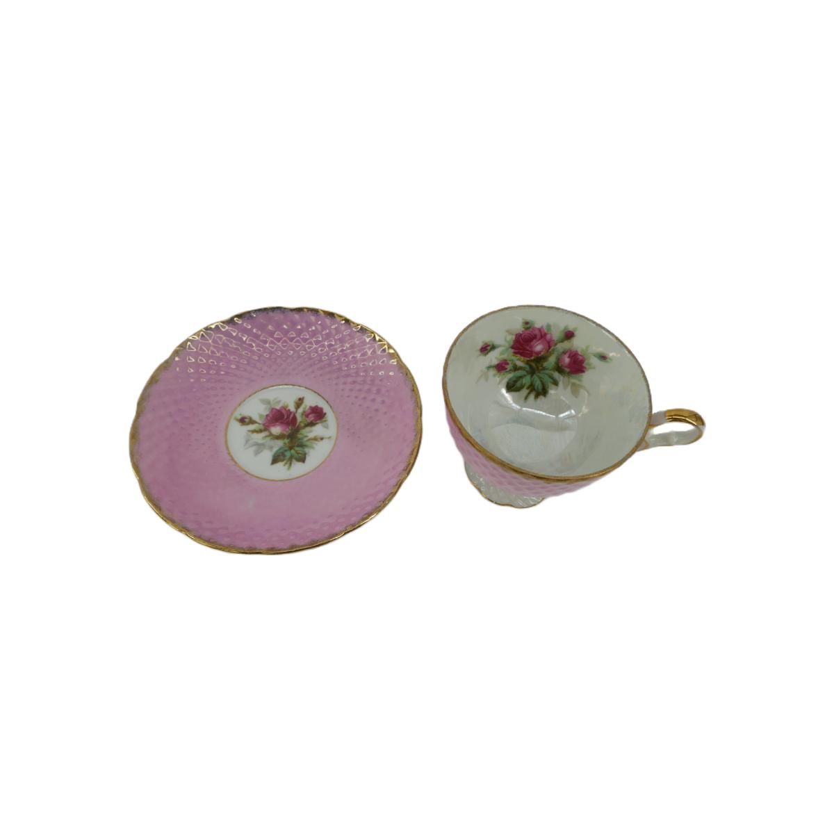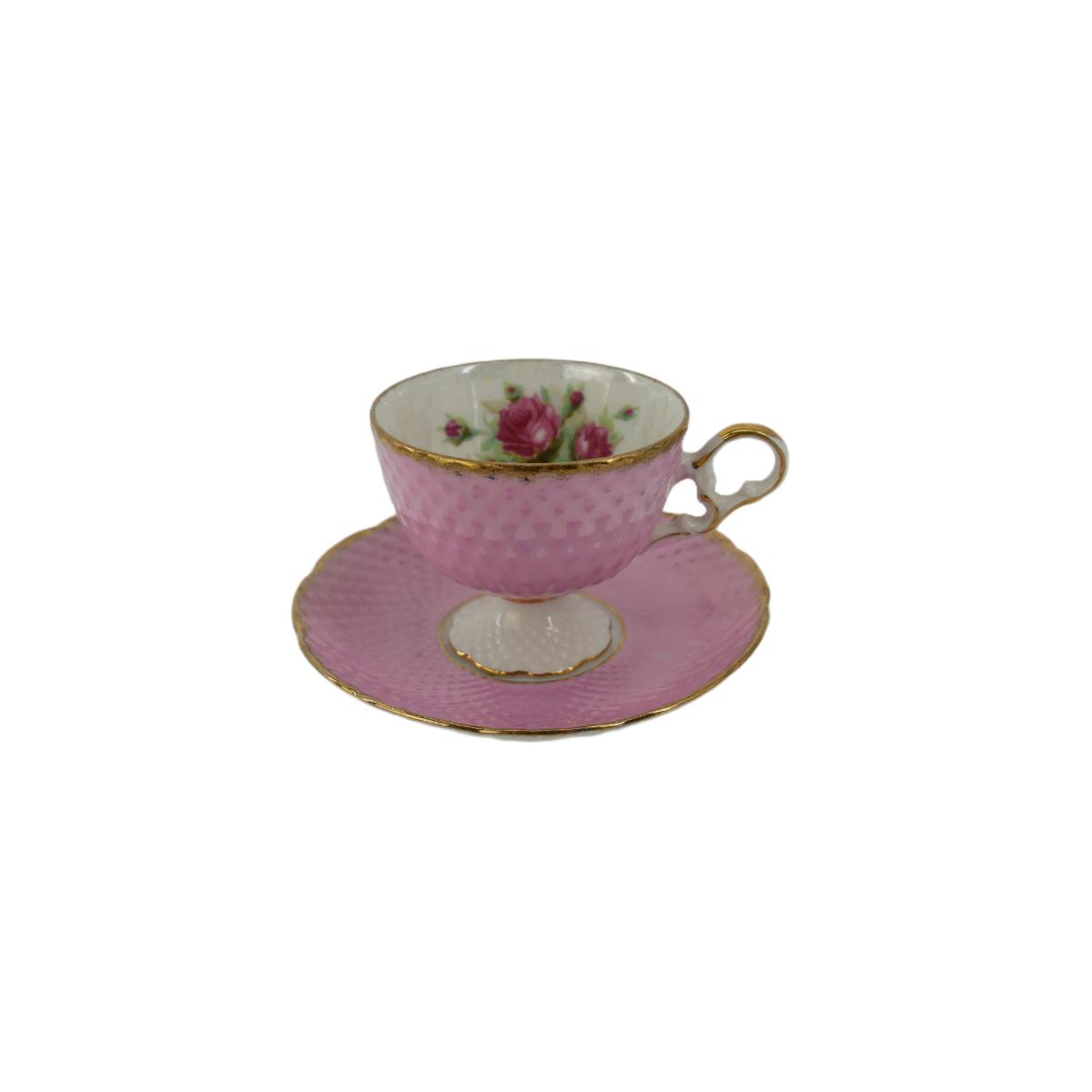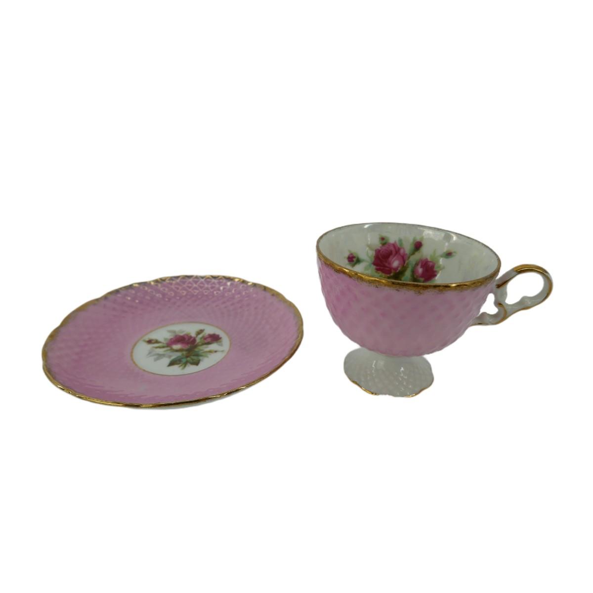 Stunning pink and iridescent textured and footed teacup and saucer. Has a victorian style with beautifully painted floral rose design. Slight paint wear from age. Excellent condition. Teacup measures 3.5" in diameter and 3" in height. Saucer measures 5.75" in diameter. Lot weighs 8 oz. (G17)
