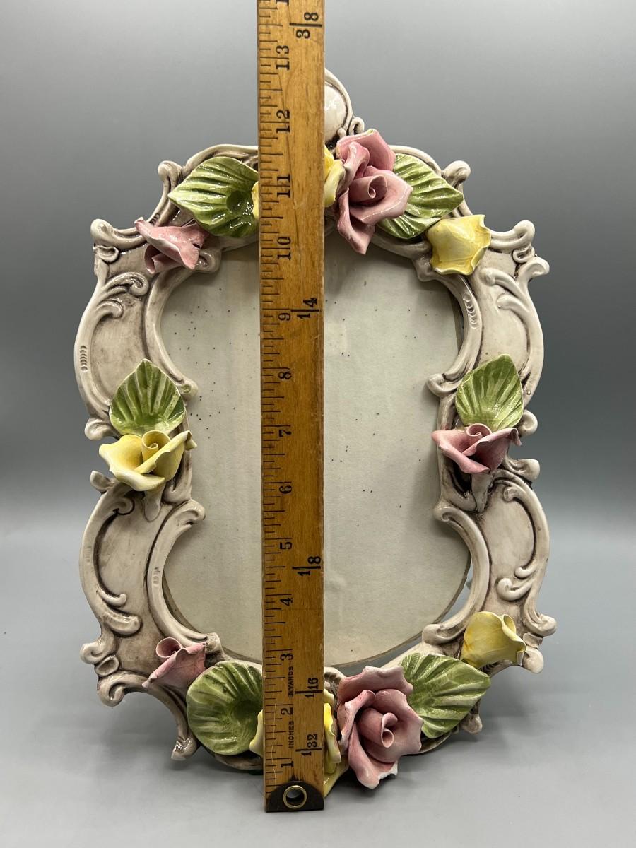Vintage Pink & Yellow Rose Capodimonte Floral Porcelain Picture Frame. Made in Italy. Marked on the back. In good condition. About 12" overall size, looks to hold a 5x7 photo.