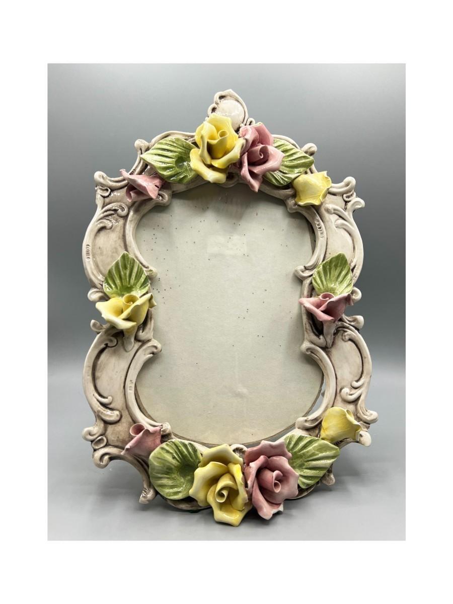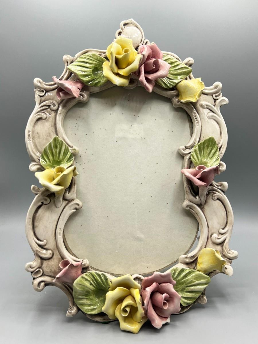 Vintage Pink & Yellow Rose Capodimonte Floral Porcelain Picture Frame. Made in Italy. Marked on the back. In good condition. About 12" overall size, looks to hold a 5x7 photo.