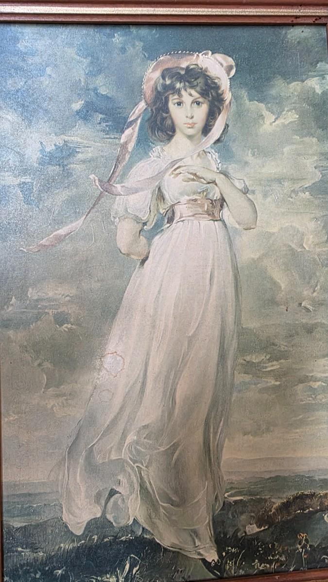 Soft, graceful, and quietly captivating, this vintage framed print brings to life one of the most beloved portraits in English art. “Pinkie,” originally painted in 1794 by Thomas Lawrence, portrays young Sarah Goodin Barrett Moulton standing against an expansive sky, her flowing dress and ribbon caught in a gentle breeze. The image has endured for centuries as a symbol of innocence and refinement, making it a timeless addition to traditional interiors.
