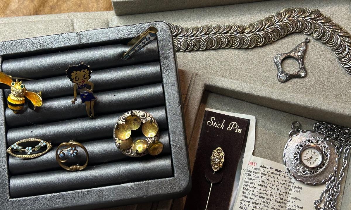 Vintage pins, bracelet & watch necklace