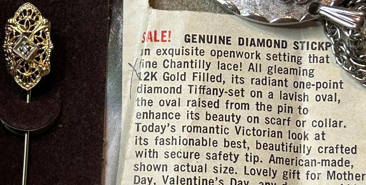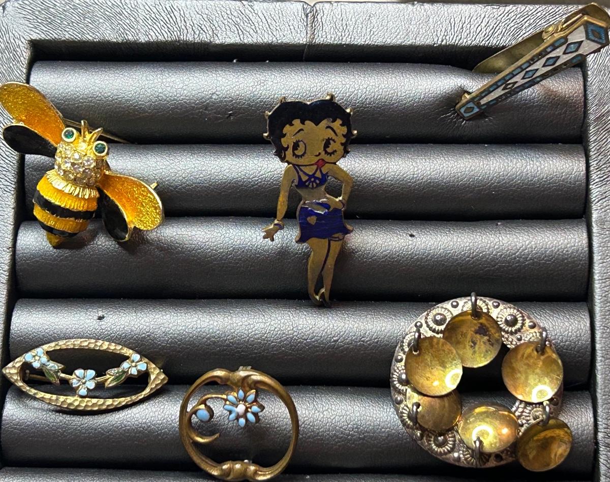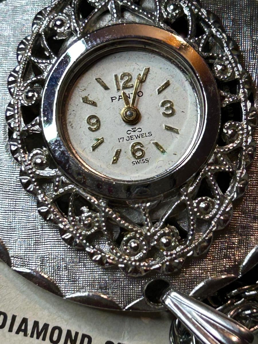The watch has no crystal & was bought @ Royal jewelers in the 70’s. The round pin is sterling (stamped) from Norway & the bee is on a spring & adorable! The stick pin is still on the card.