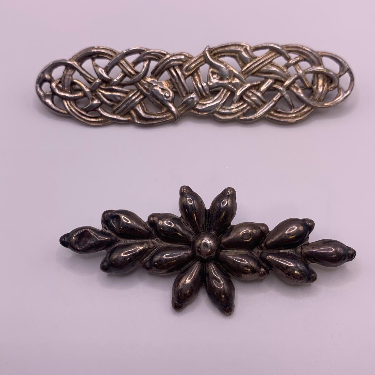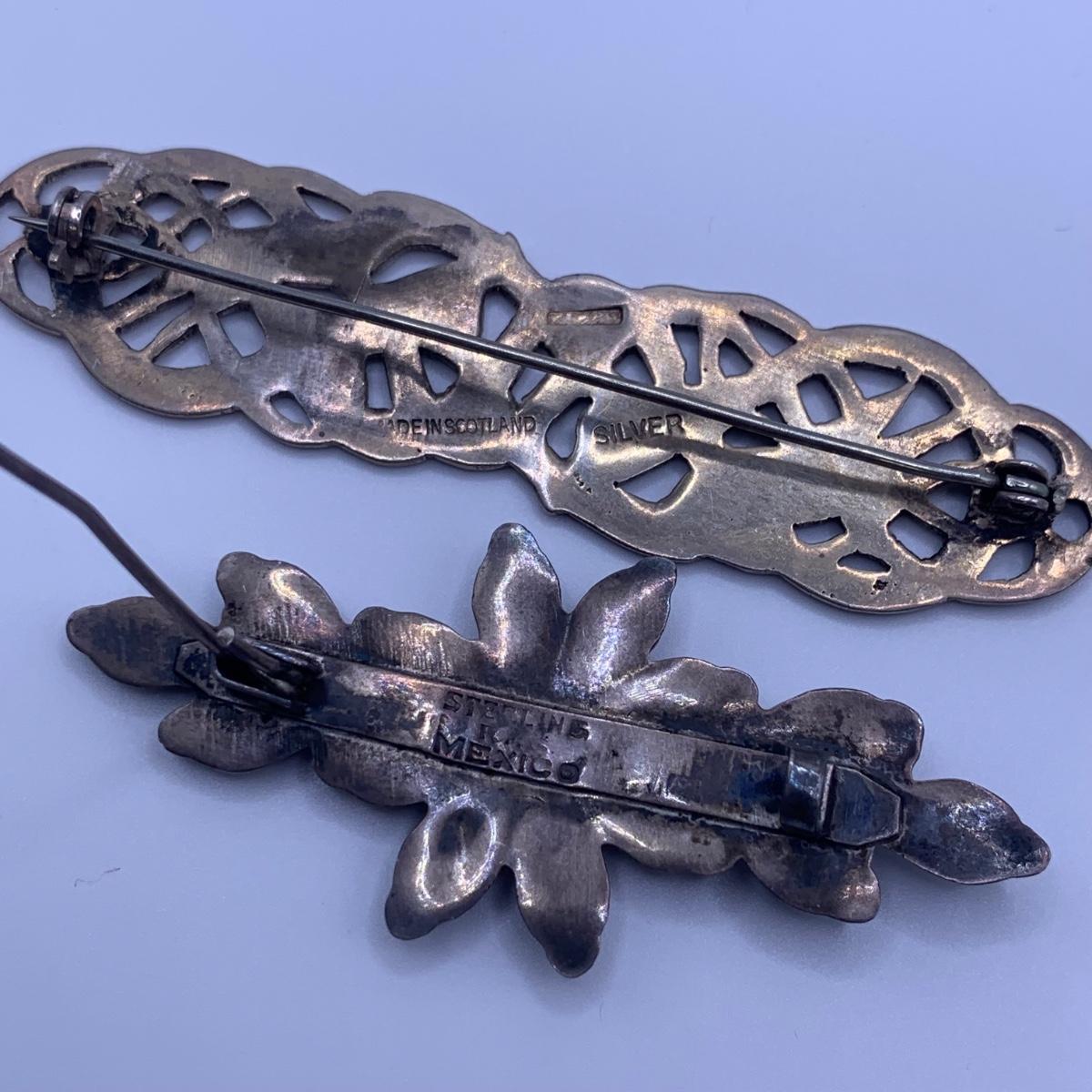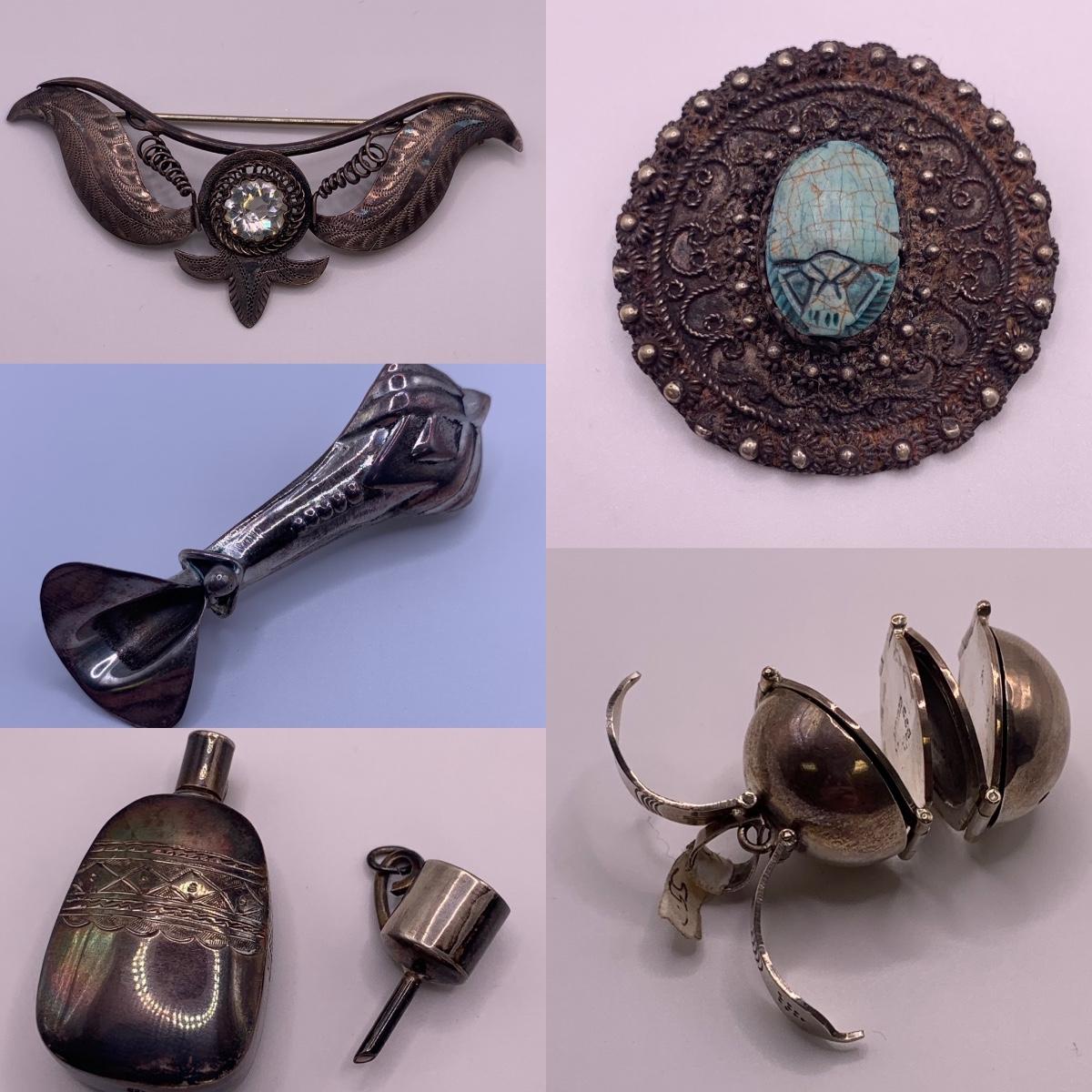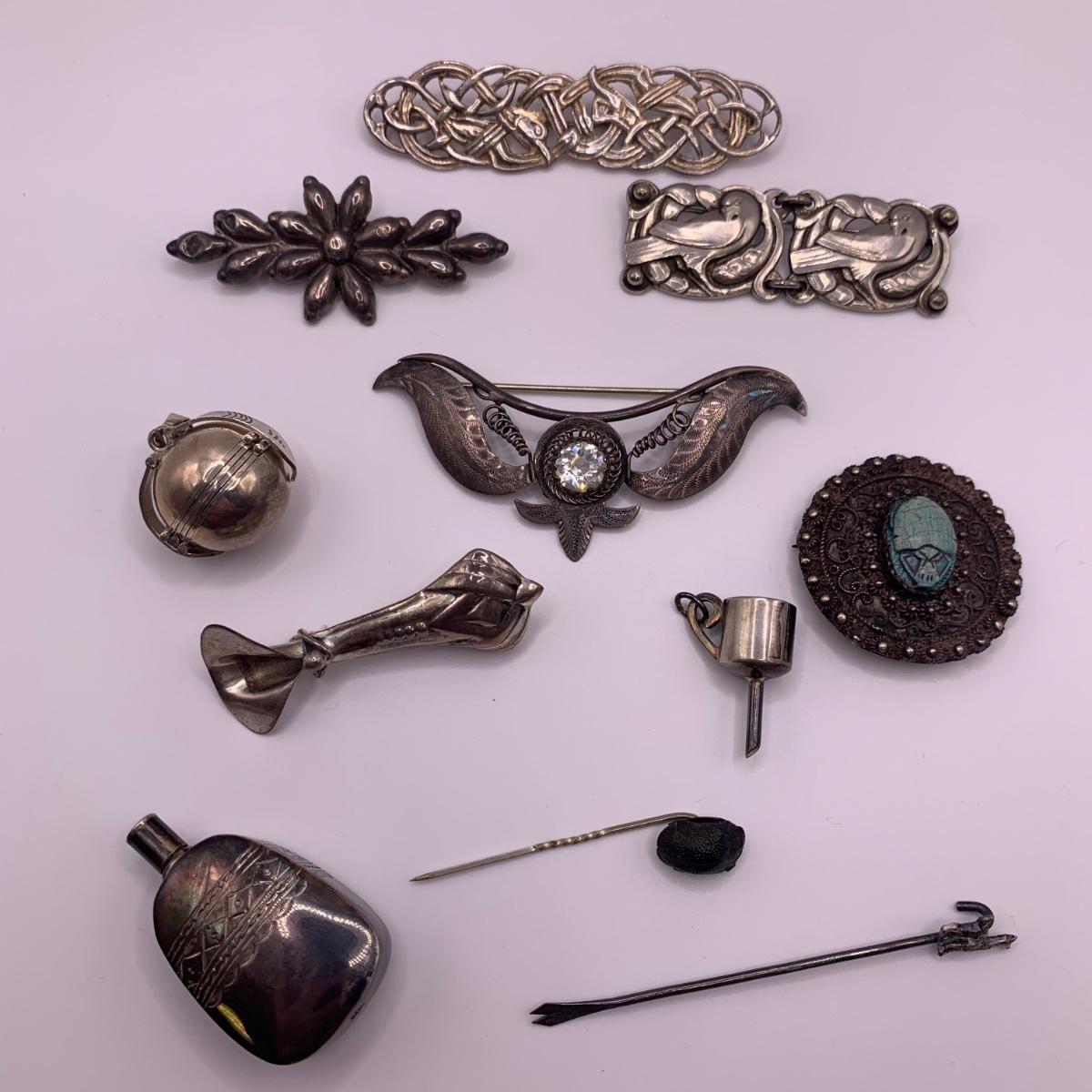A collection of unique vintage pins and pendants. 11 items total. A variety of items are stamped ‘Sterling’ or ‘925’. One pin has a stone that is turquoise in color (actual stone type not verified). One pin is a tiny bud vase and a pendant perfume bottle with its own funnel.. For reference, the knotted pin marked ‘Made in Scotland’ is approximately 3” x 1.25”.