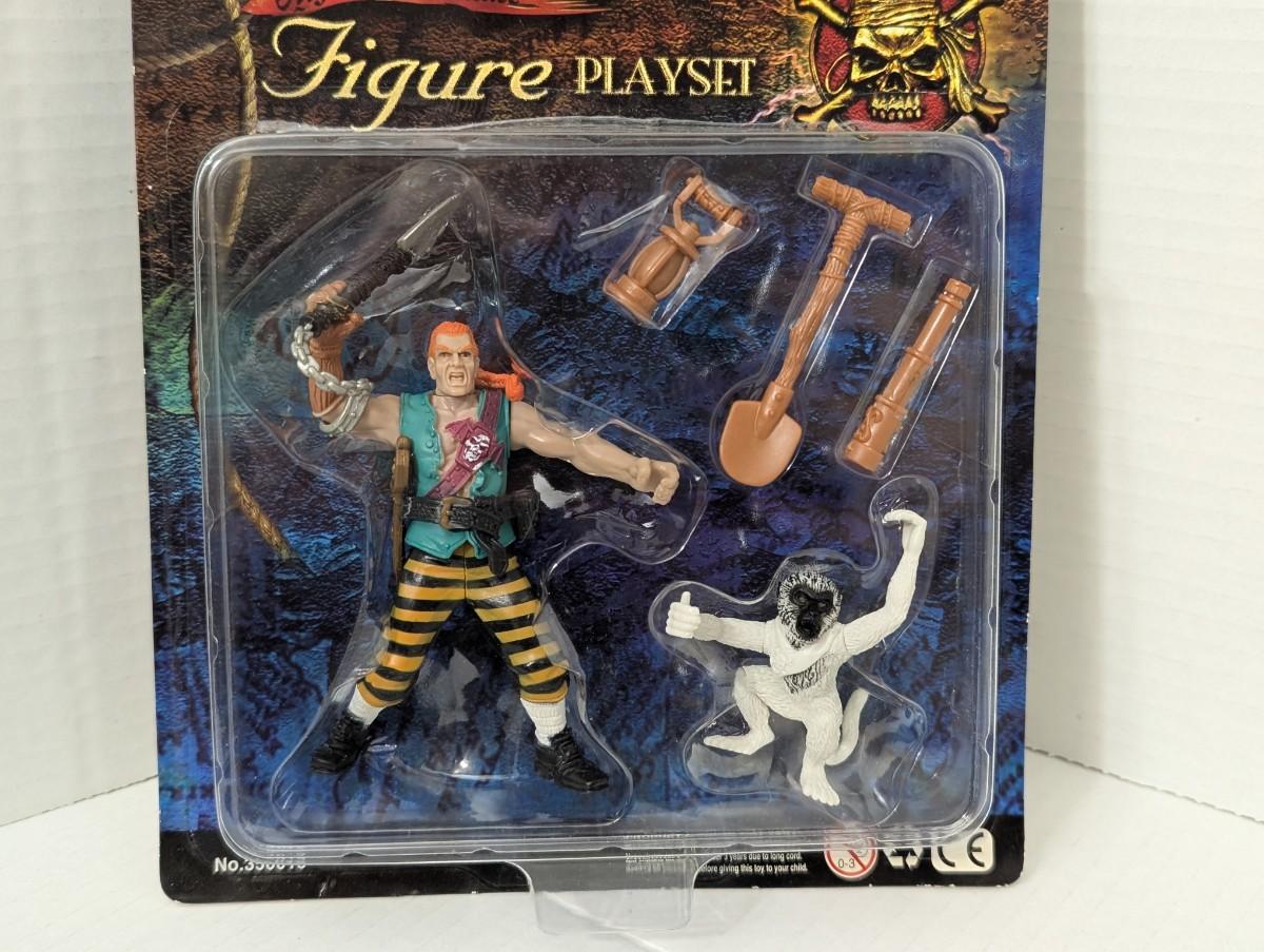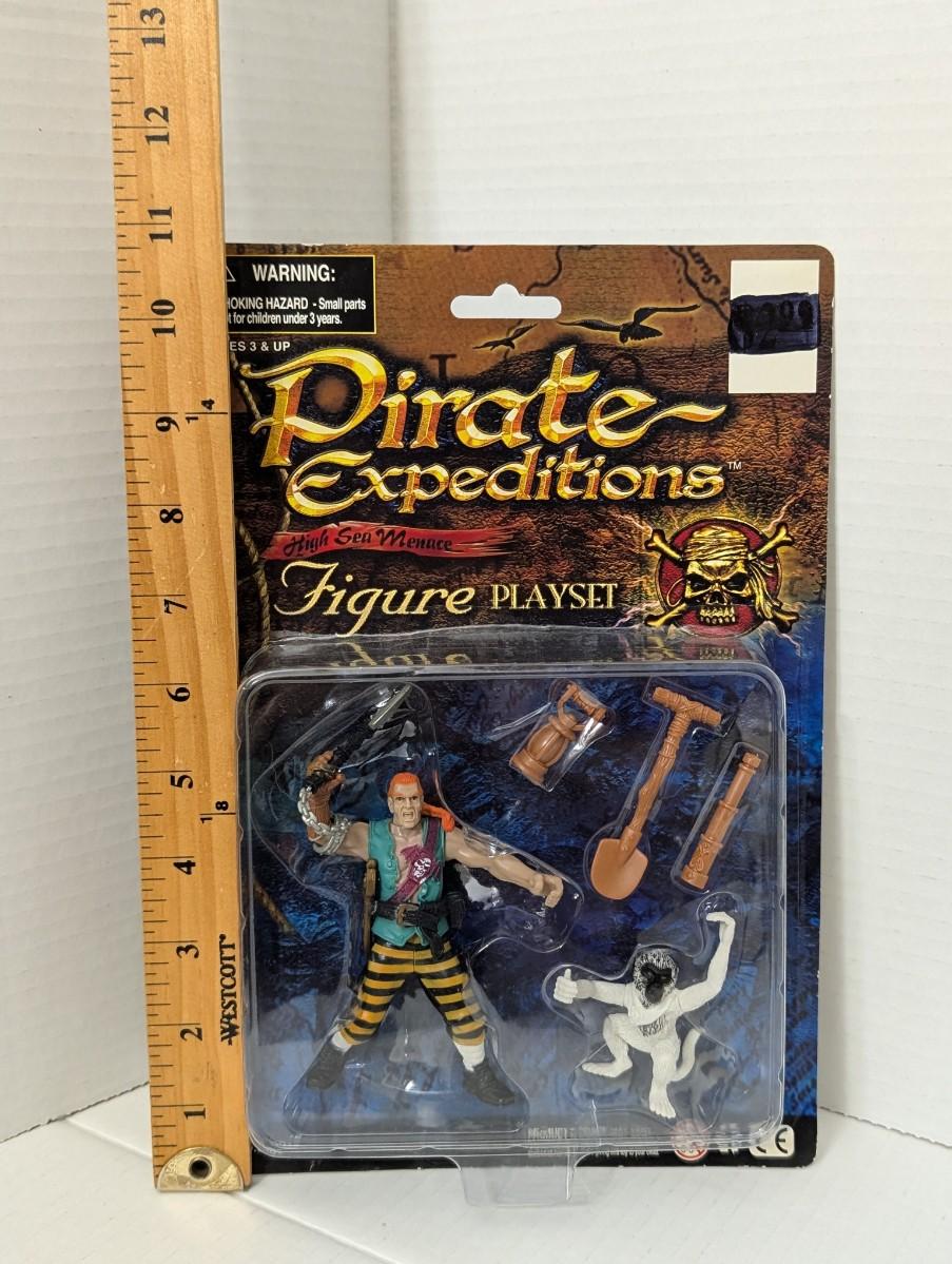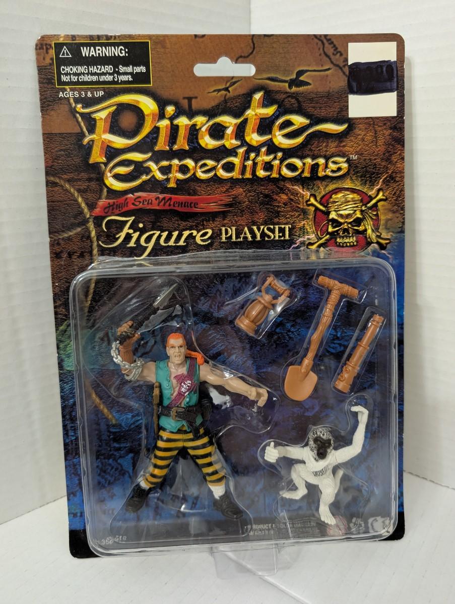 Sealed Pirate Expeditions: High Sea Menace action figure playset, complete with pirate figure, monkey companion, and detailed accessories including shovel, telescope, and cannon pieces. Still mint on card (MOC) with the original packaging.