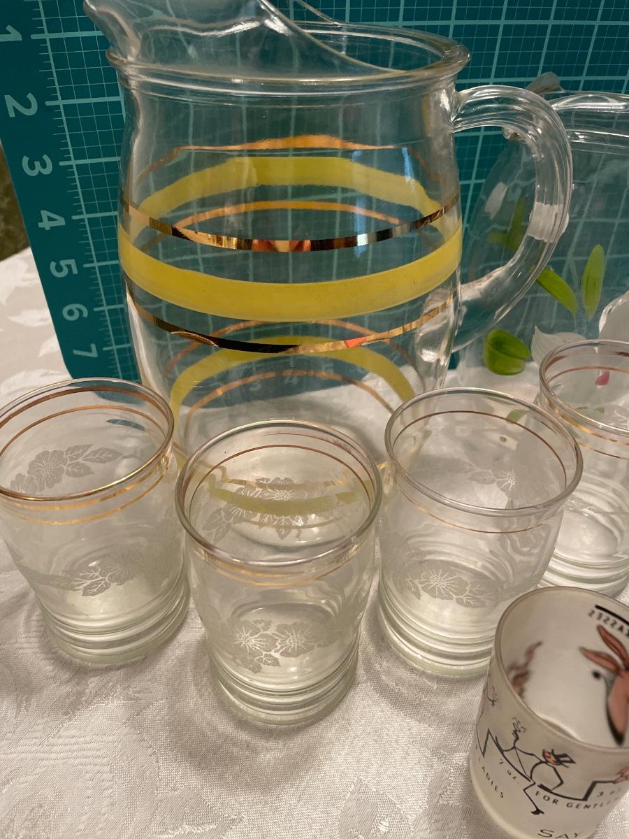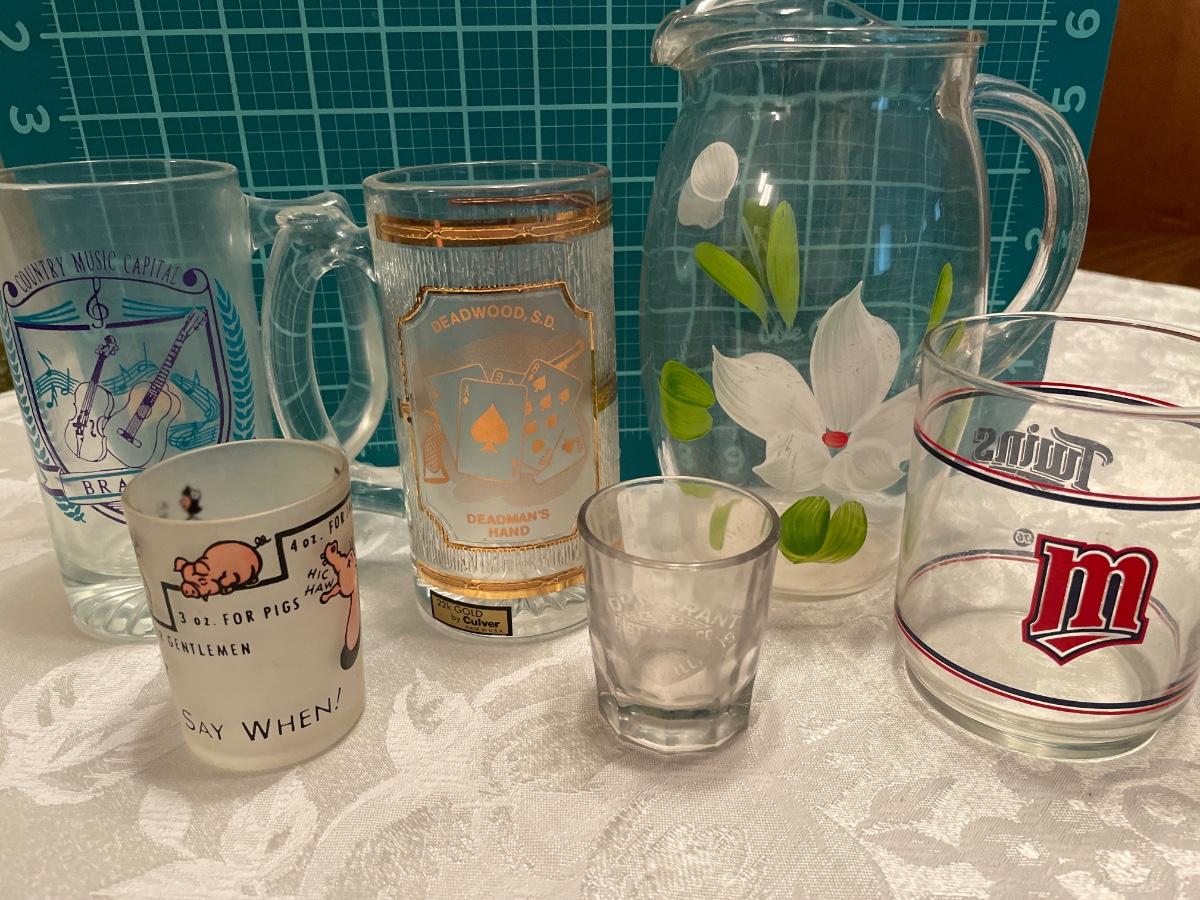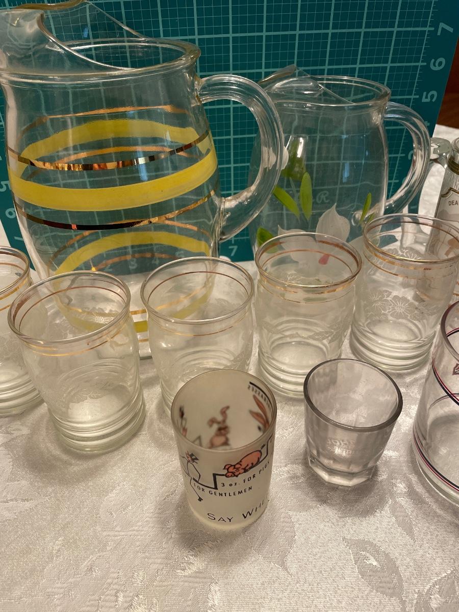 Vintage pitchers, shot glasses and mugs