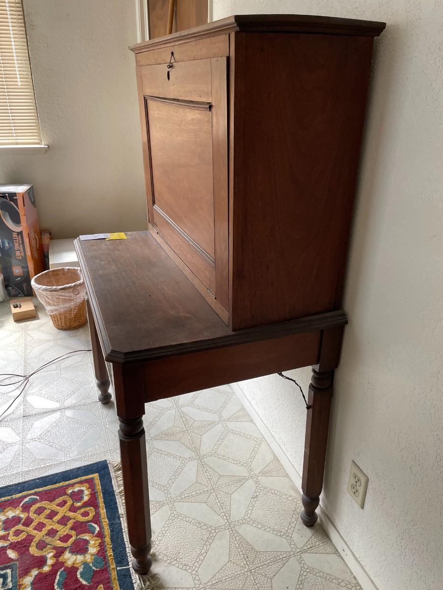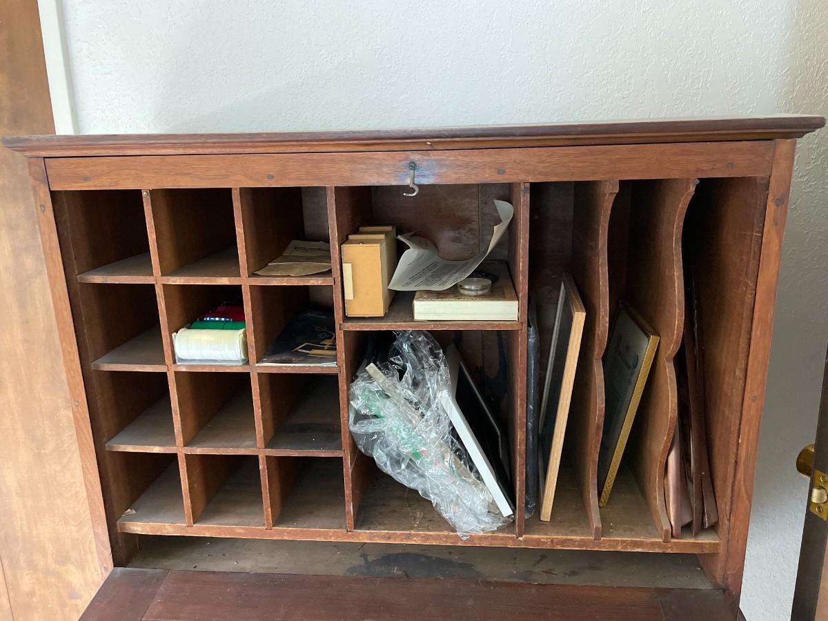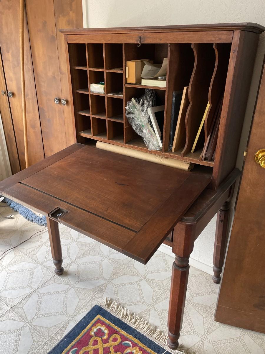 Secretary style desk. Drop down desktop, several compartments, 1 drawer, lock has been removed. Wear, scratches shown in photos. All wood, heavy - bring help - Stairs - 2nd floor. Contents not included
