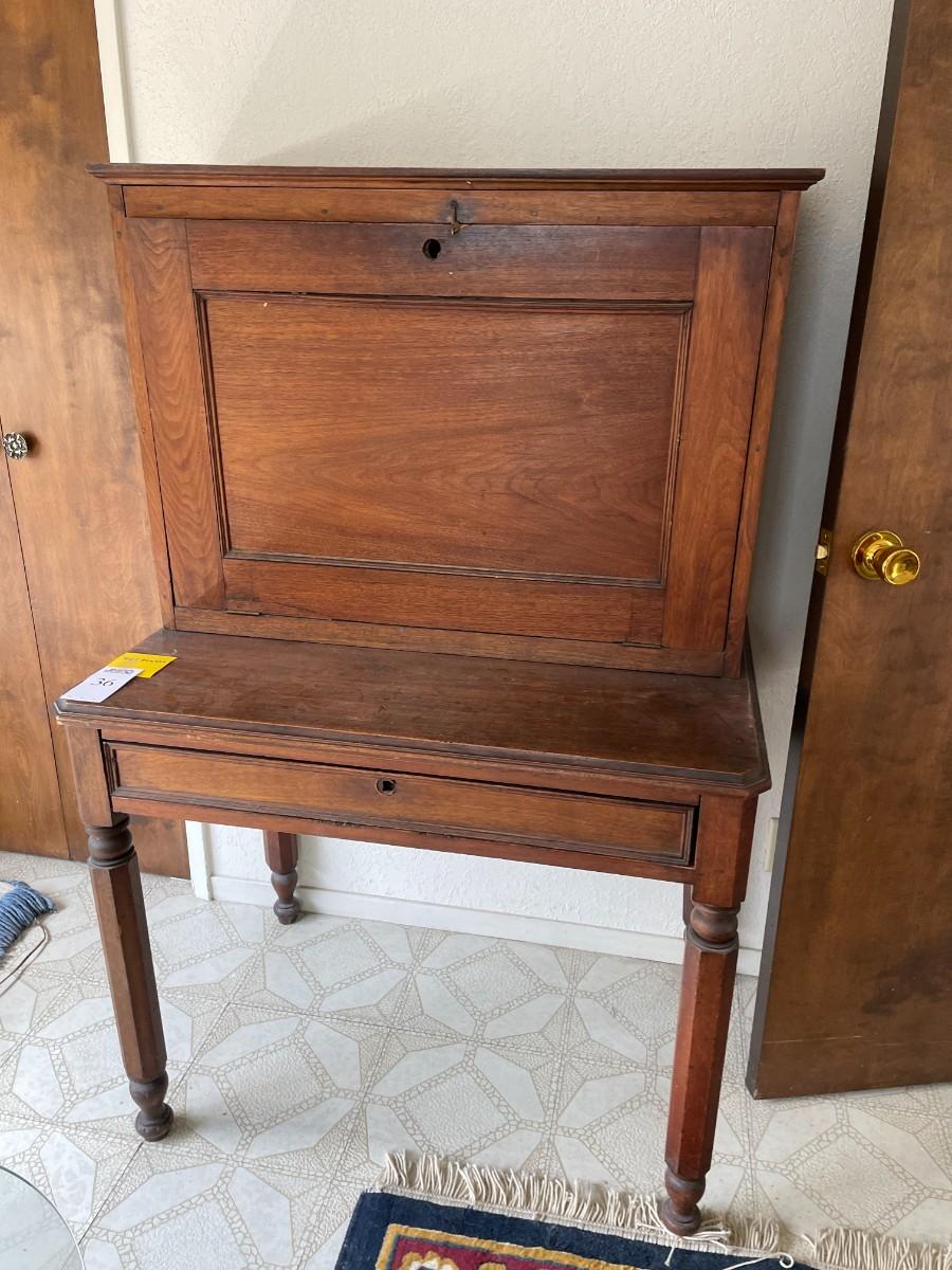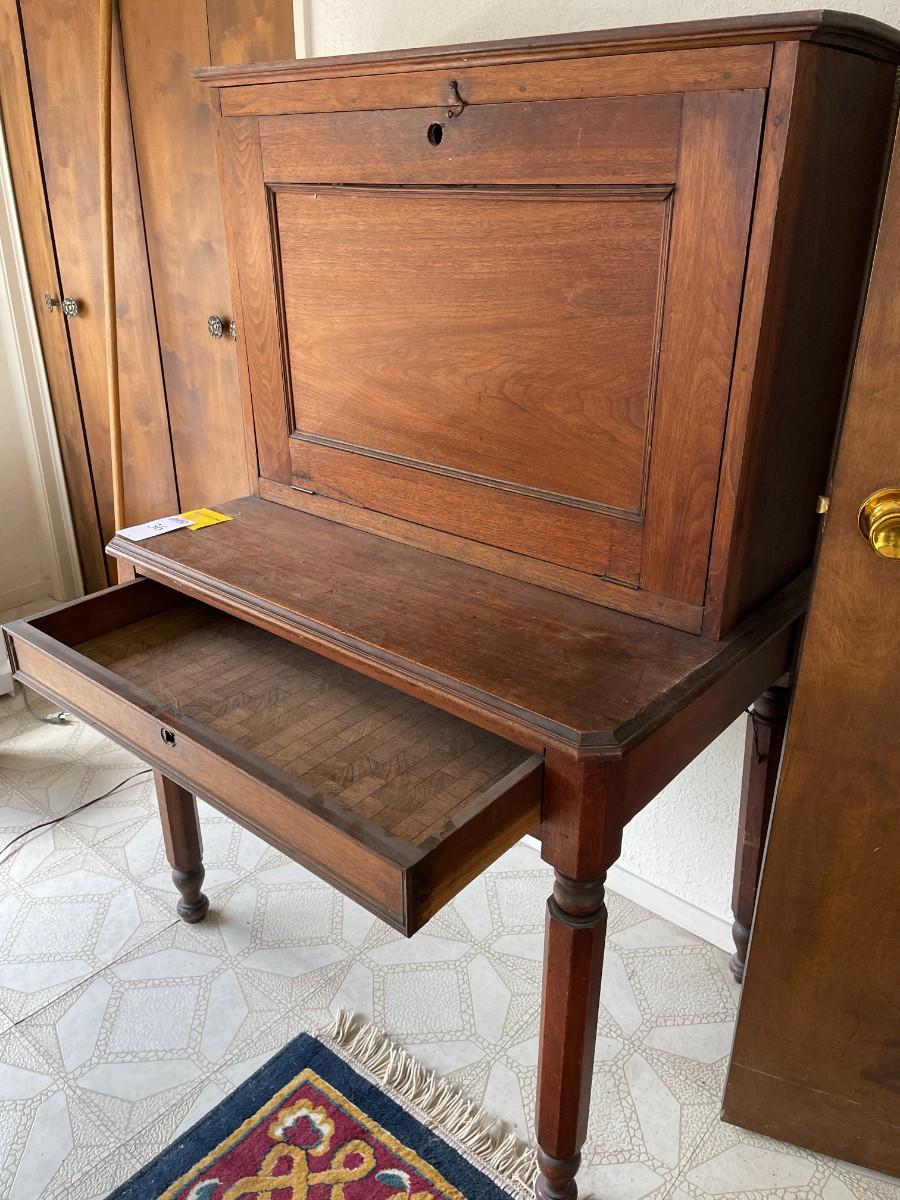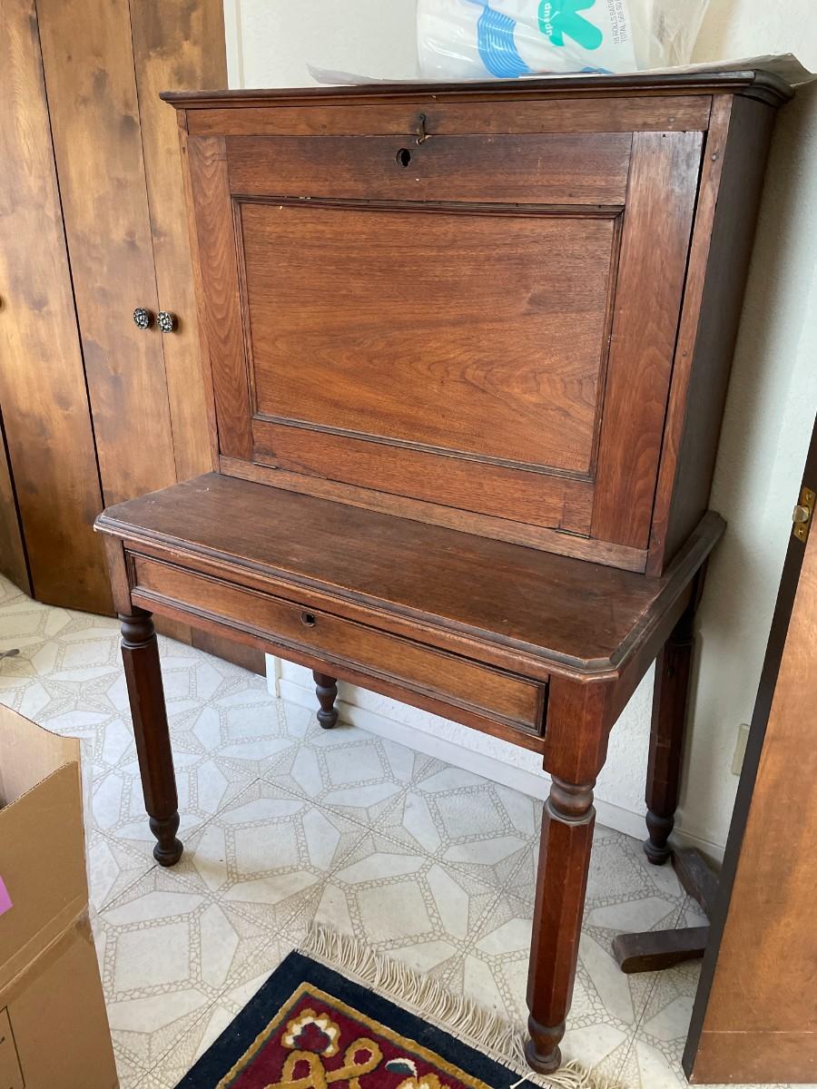 Secretary style desk. Drop down desktop, several compartments, 1 drawer, lock has been removed. Wear, scratches shown in photos. All wood, heavy - bring help - Stairs - 2nd floor. Contents not included