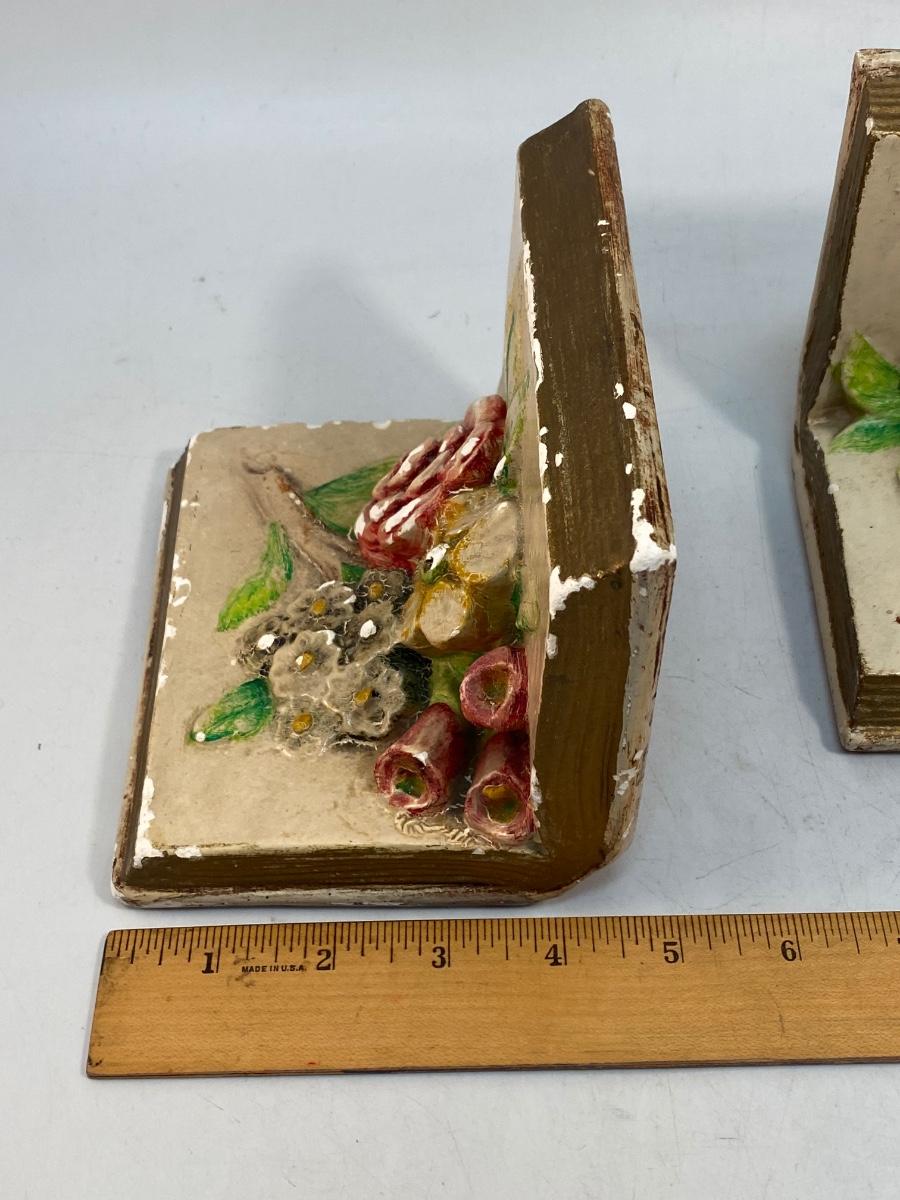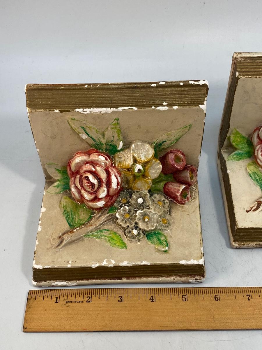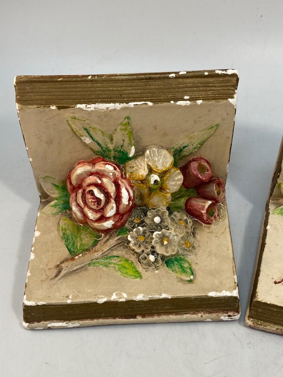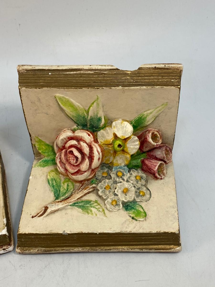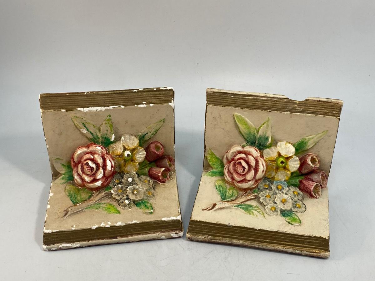 Vintage Plaster Bookend Open Books & Flowers. In fair condition. Chipping along edges, one on the bigger side. Could be repainted if desired.