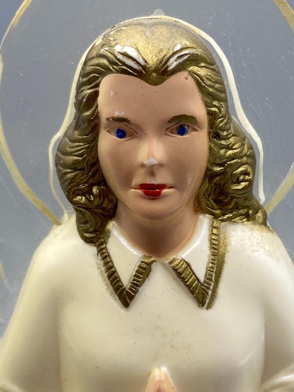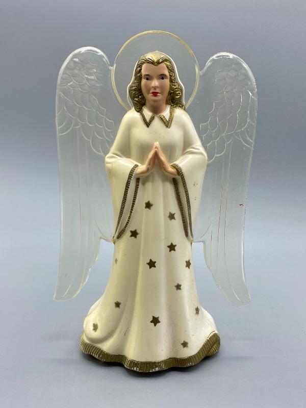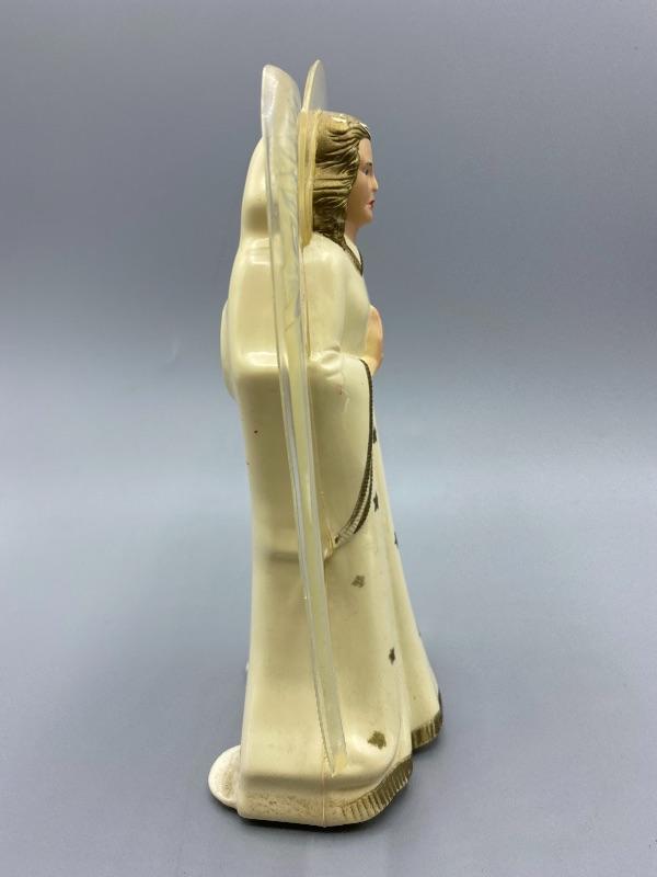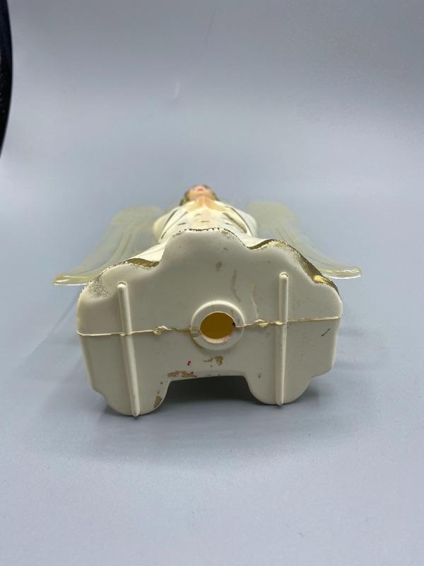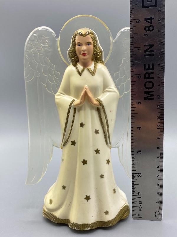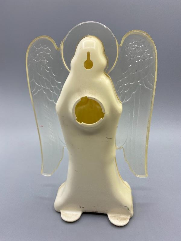 Vintage angel light. Hard plastic. Has a spot to hang on wall and has a place for a night light style bulb to be fitted. Stands a little over 8". Some signs of wear to the paint.