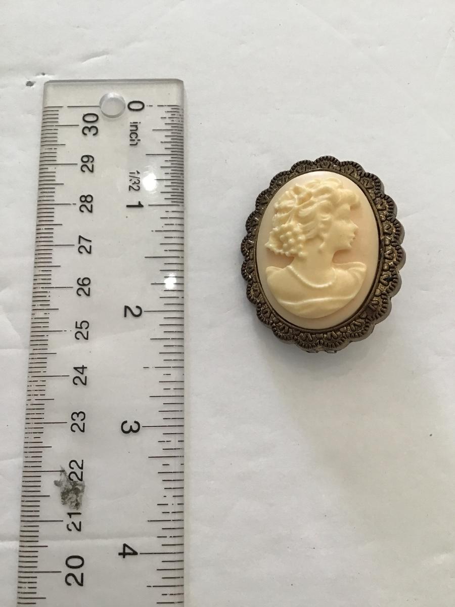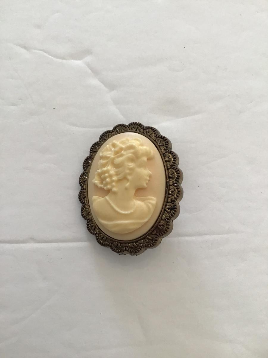 Vintage plastic cameo brooch. Please see attached photos.
