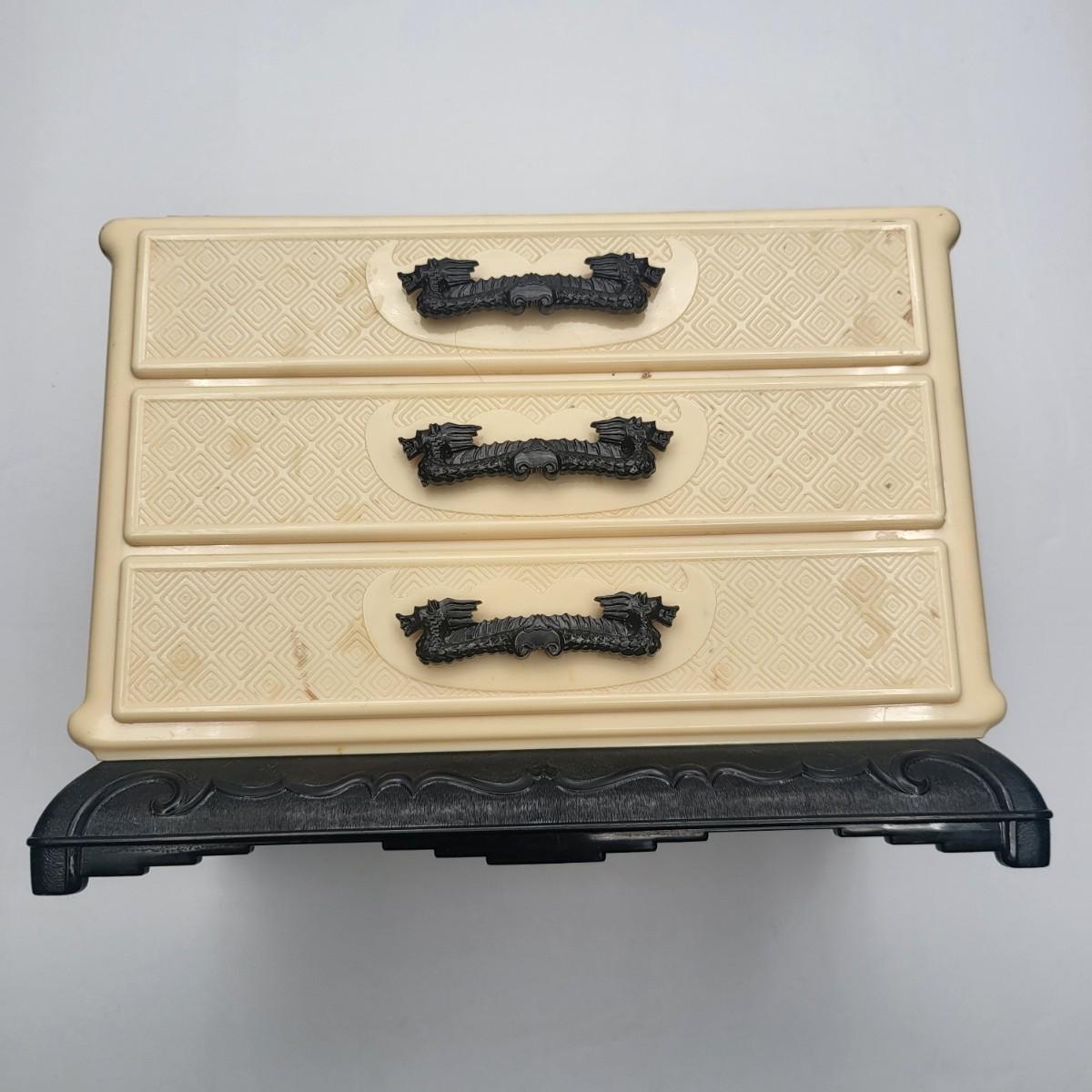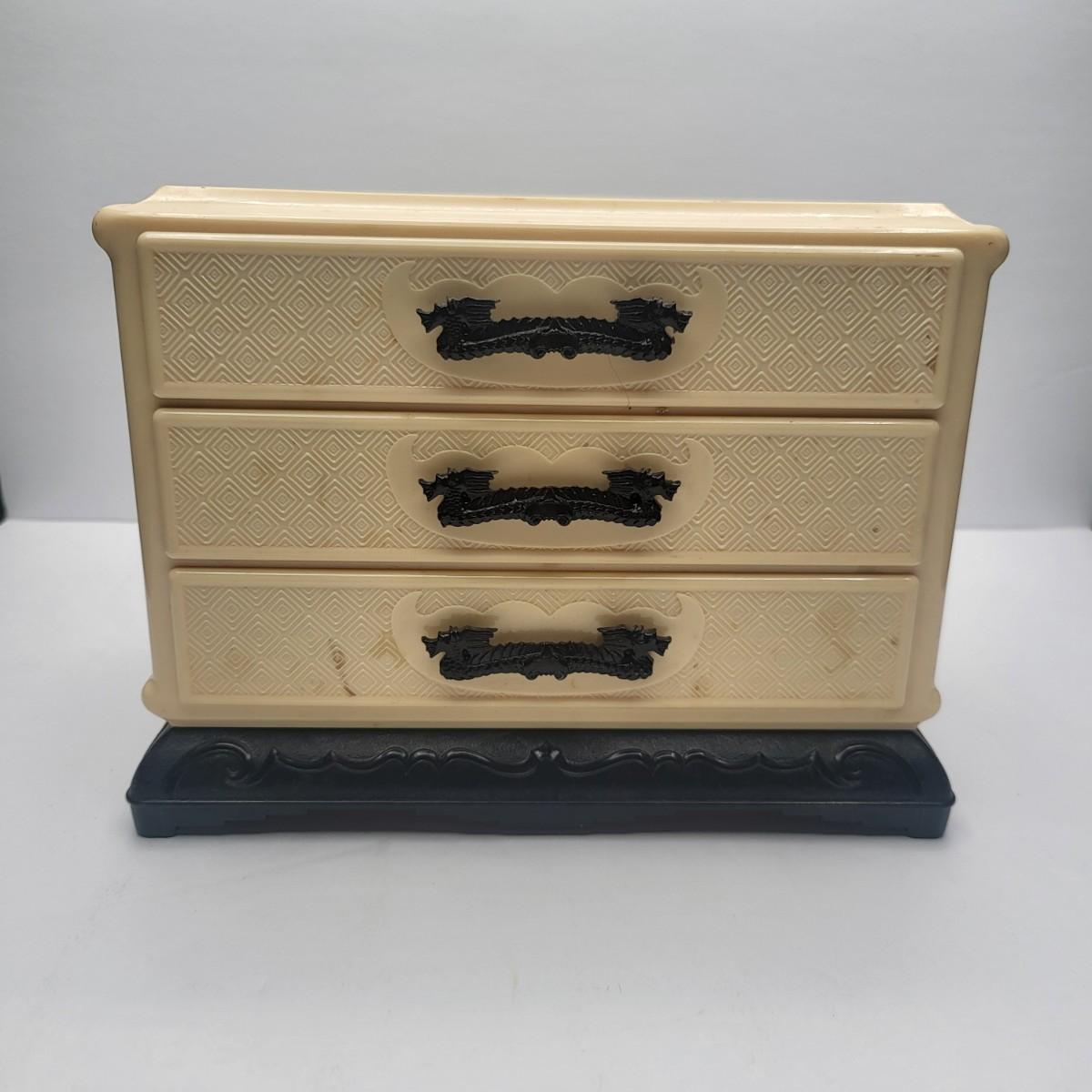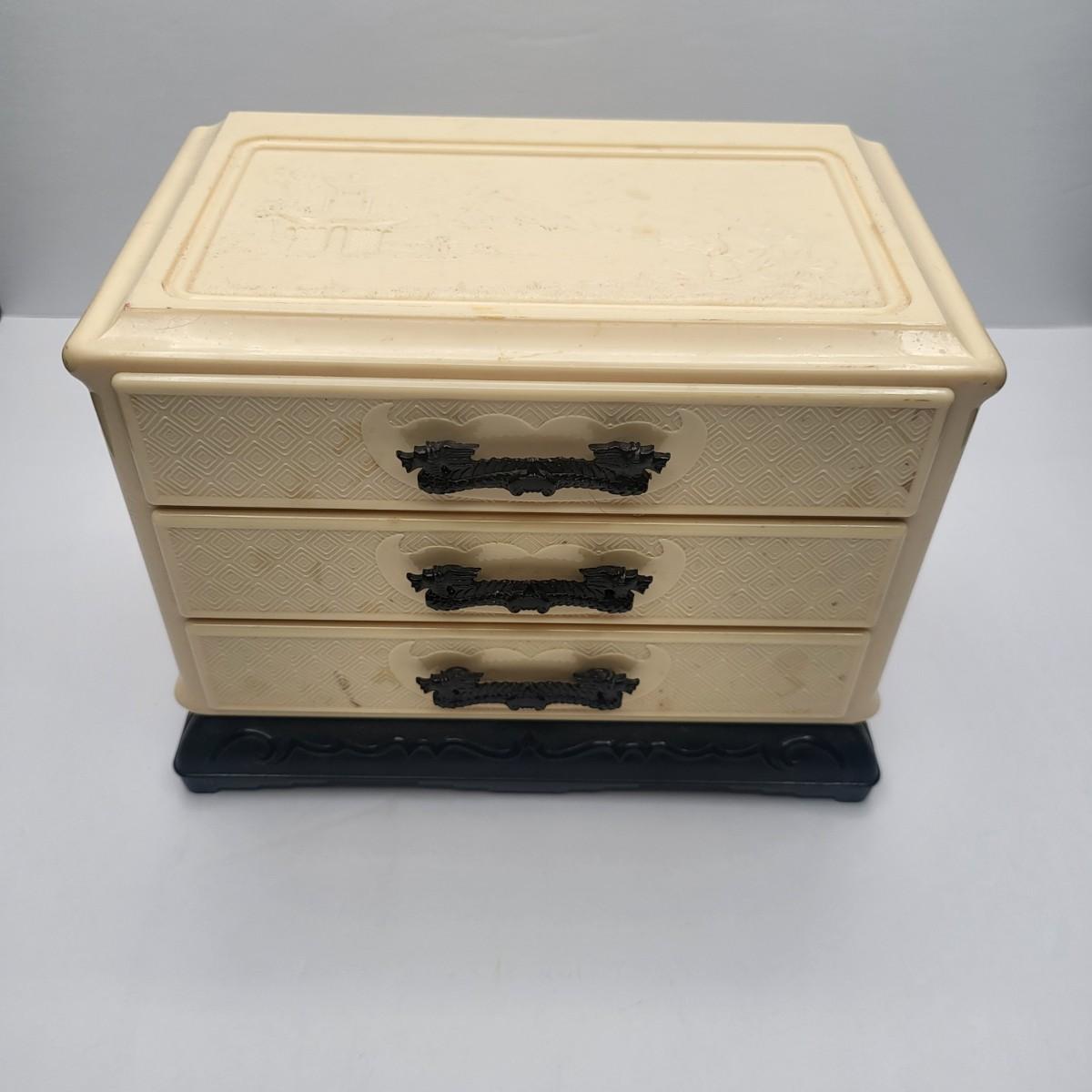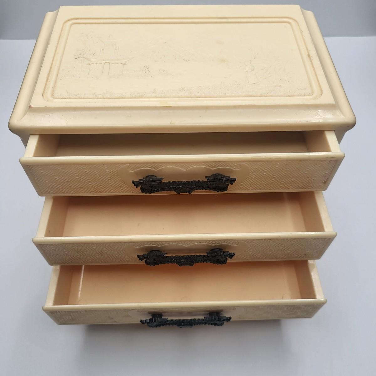 Cool little vintage plastic jewelry box with 3 drawers. Asian motif