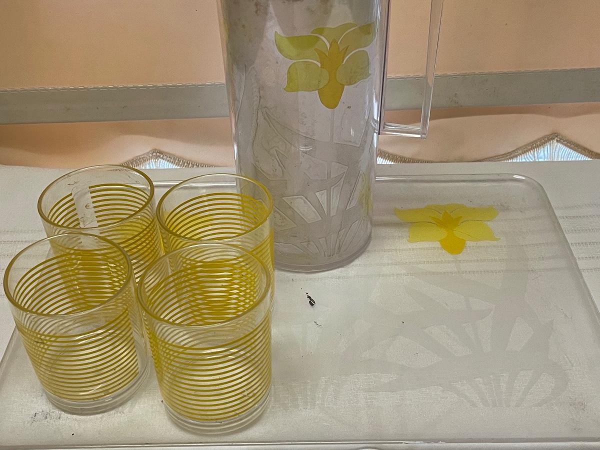 Vintage Plastic Pitcher and Tray with Four Glasses