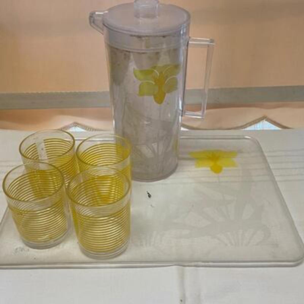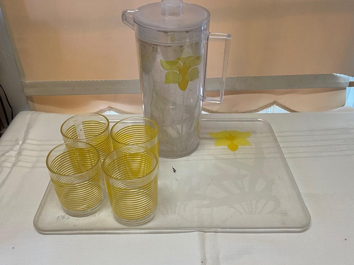 Vintage Plastic Pitcher and Tray with Four Glasses