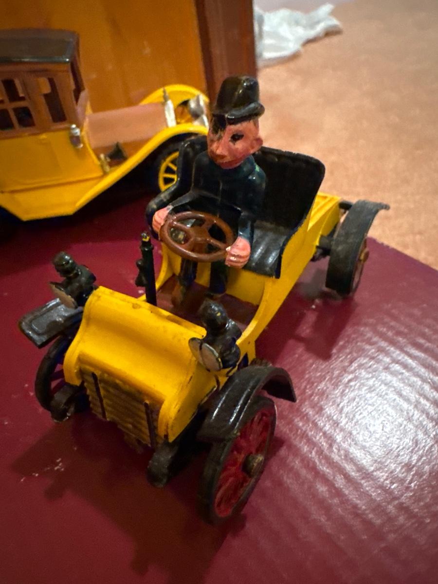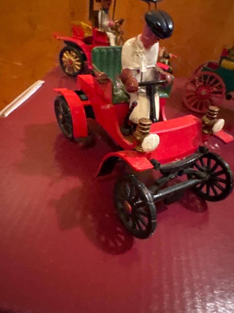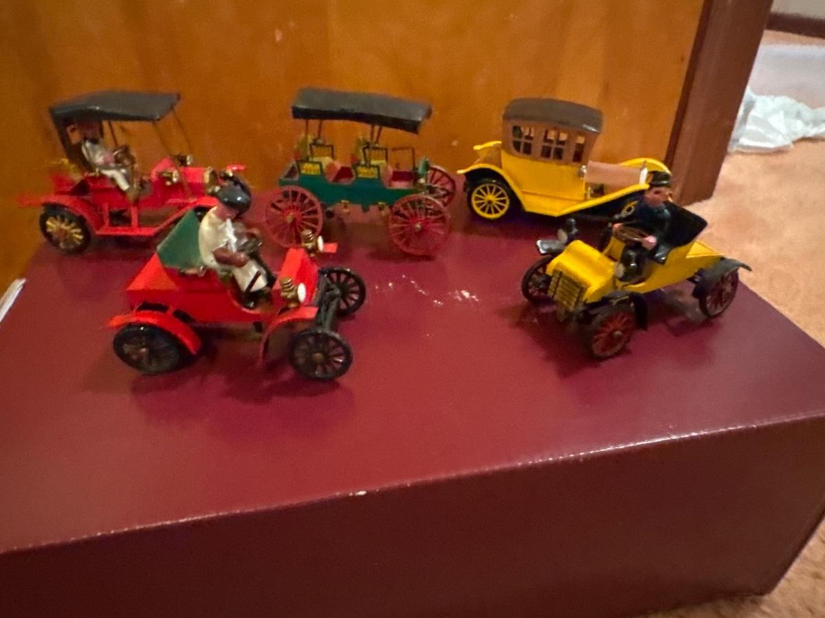Includes 5 plastic vintage toy cars. Made more for displaying vs playing with them. Broken: the driver is unhooked from the steering column on the small yellow car.