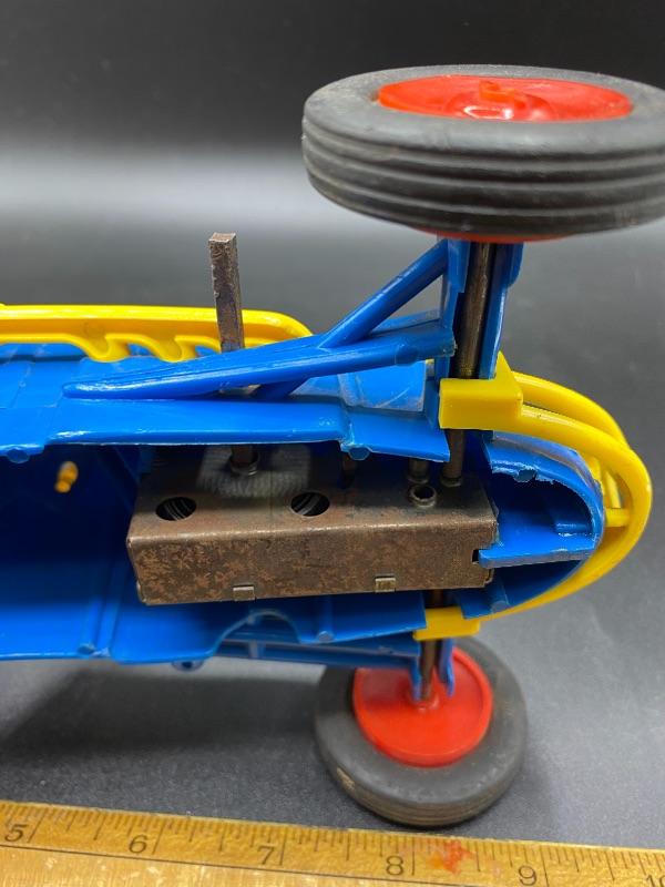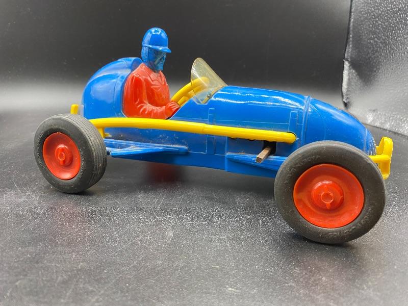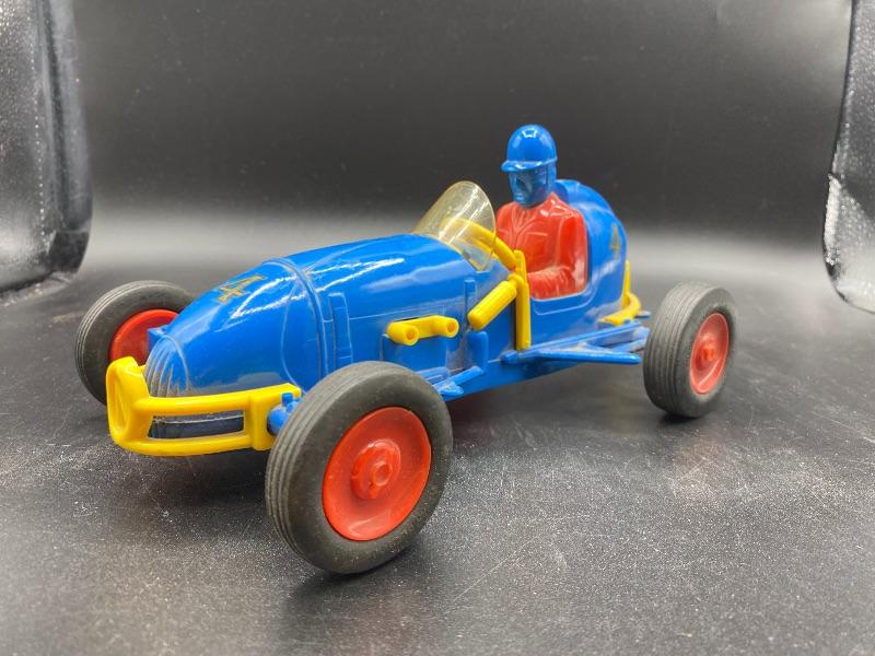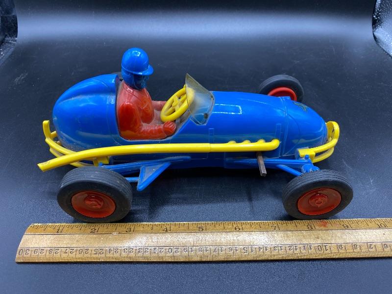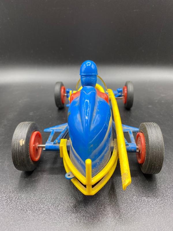 Vintage plastic wind up race car. Bright primary colors. Wind up box is on the front wheels. Do not have the key to wind this up. Missing a set of pipes on one side. Did not see a makers name on this anywhere. Wheels turn freely. 9" size.