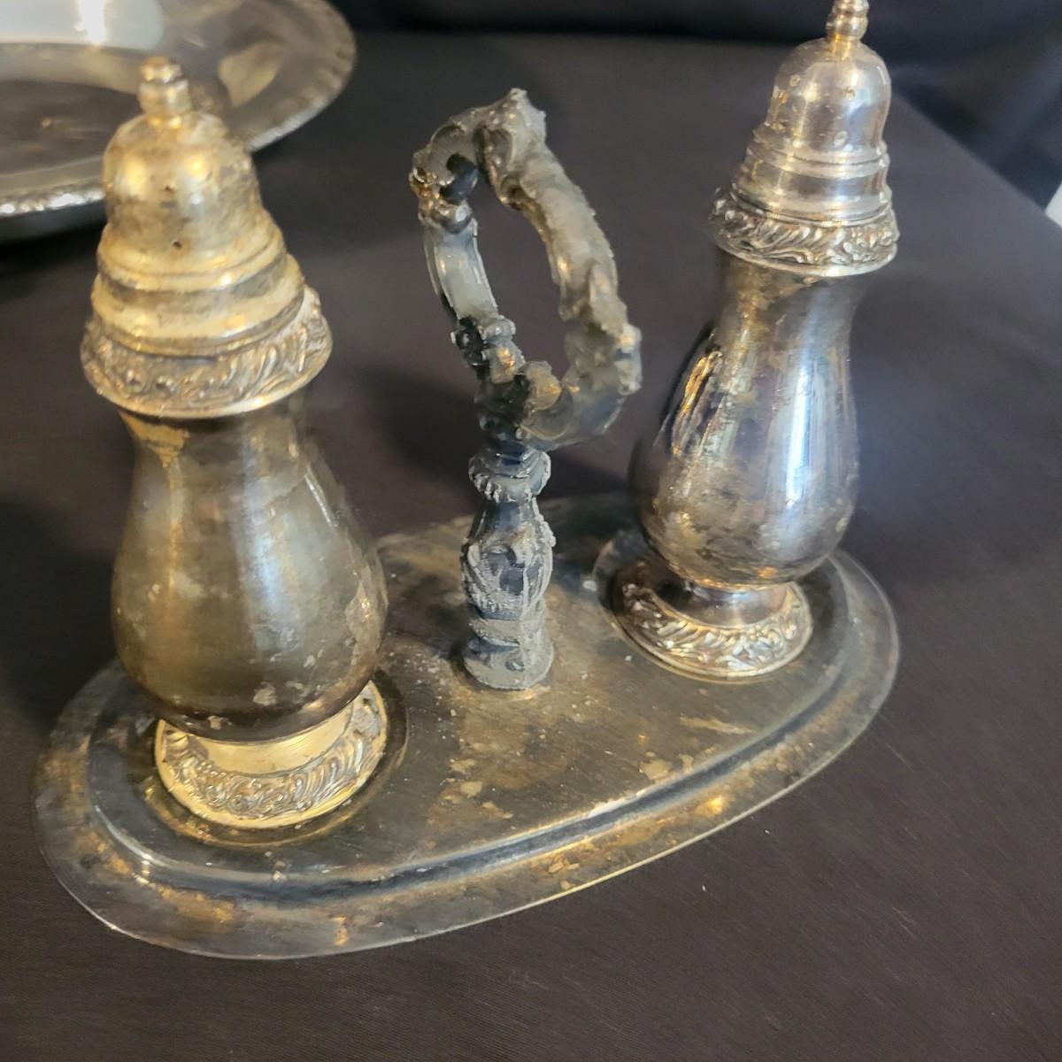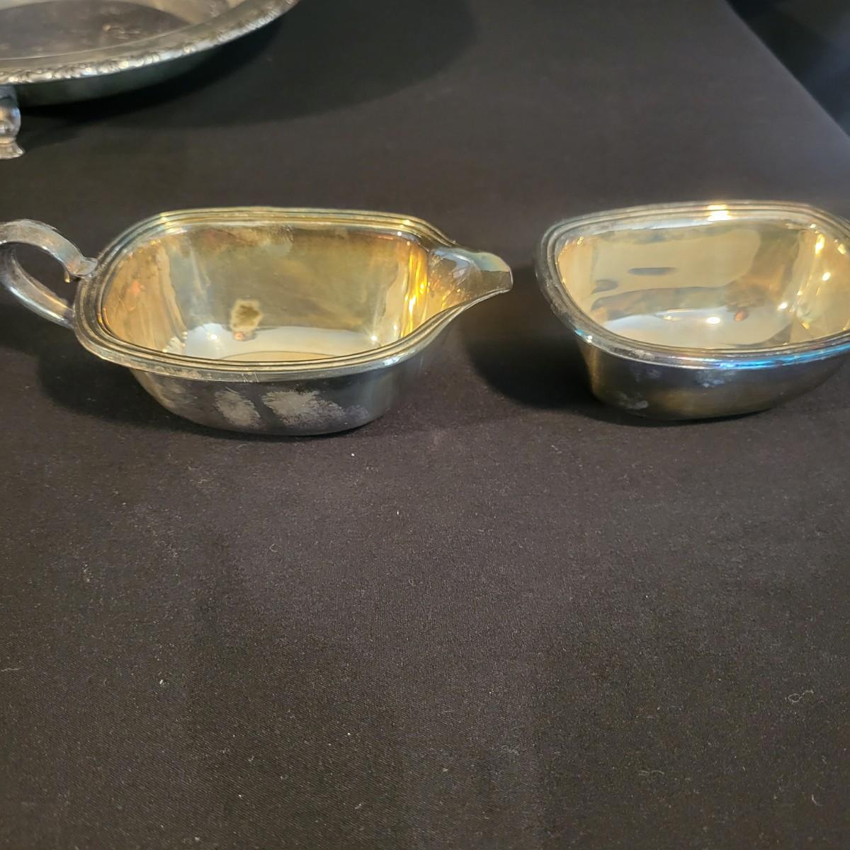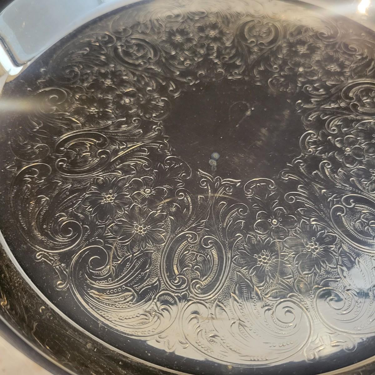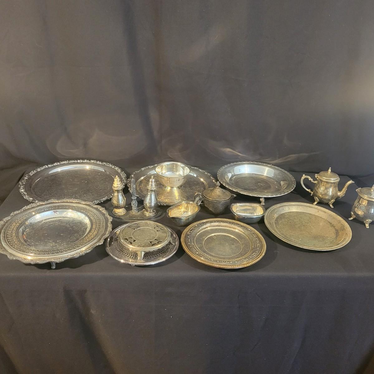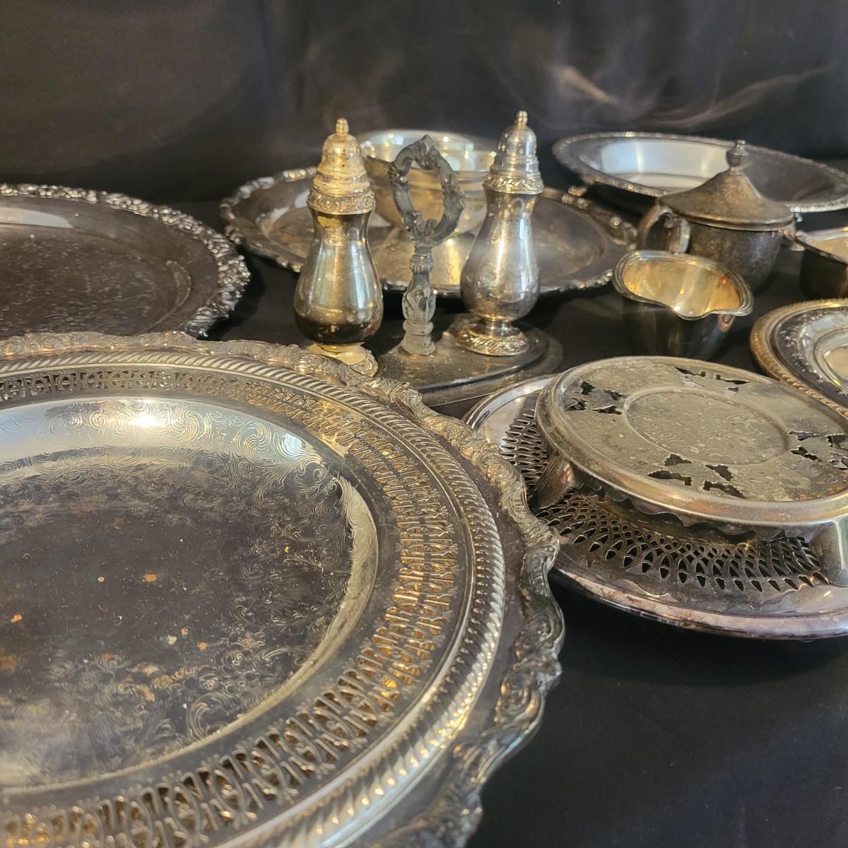 A large assortment of silver plated serving dishes, salt & pepper shakers, gravy boats, serving platters and trivets. Pieces range from good to fair in condition. All show some use and minor scratches. One small teapot is missing its handle. Some have a heavy patina and some show very little oxidation. See attached pictures for more detail. Largest serving platter measures approximately 14" x .5". Shipping available. Shipping can be costly, please call UPS store at 828-252-6930 for quote.