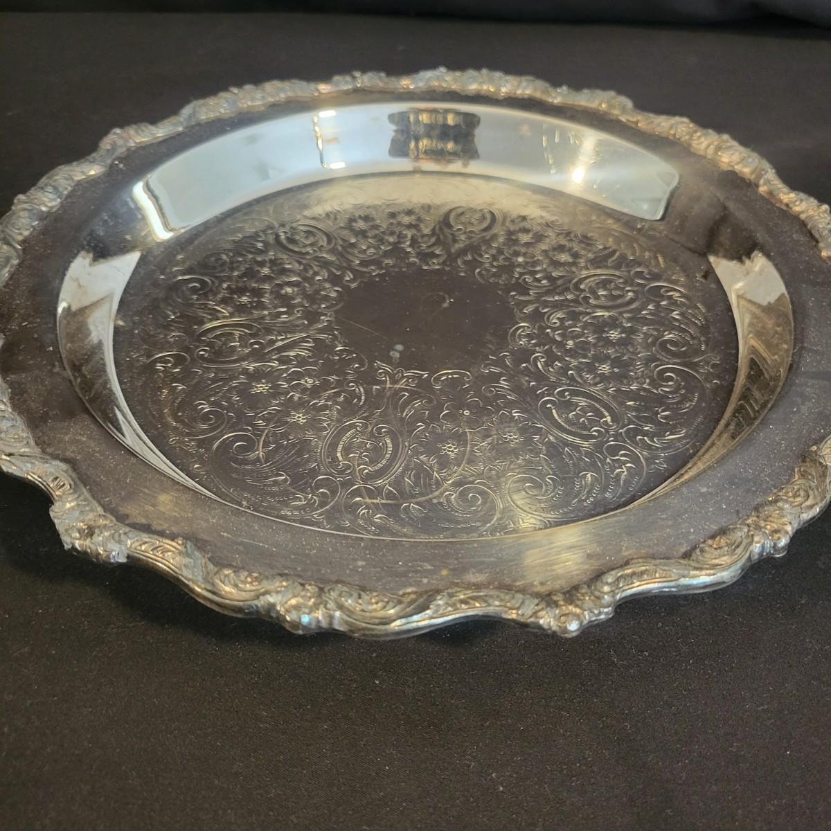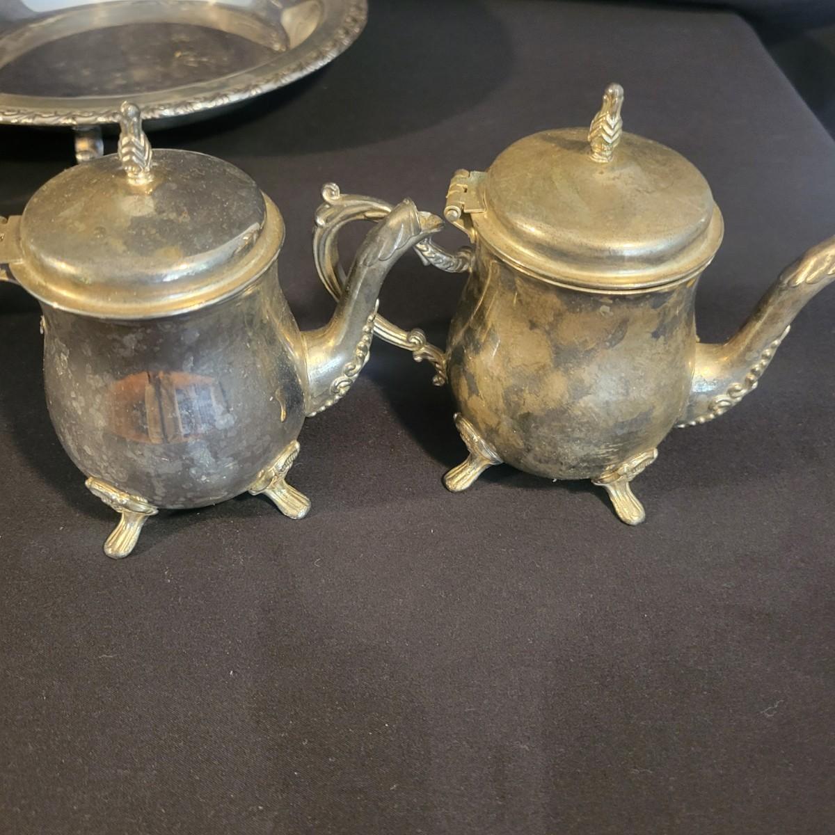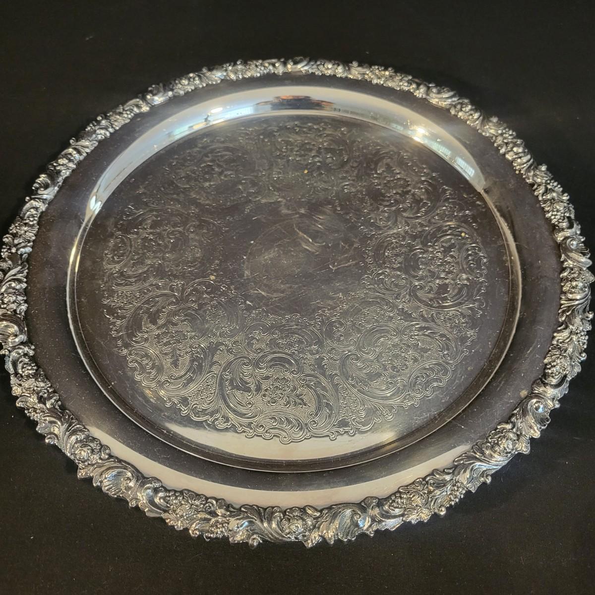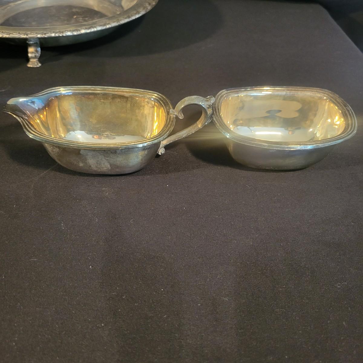 A large assortment of silver plated serving dishes, salt & pepper shakers, gravy boats, serving platters and trivets. Pieces range from good to fair in condition. All show some use and minor scratches. One small teapot is missing its handle. Some have a heavy patina and some show very little oxidation. See attached pictures for more detail. Largest serving platter measures approximately 14" x .5". Shipping available. Shipping can be costly, please call UPS store at 828-252-6930 for quote.