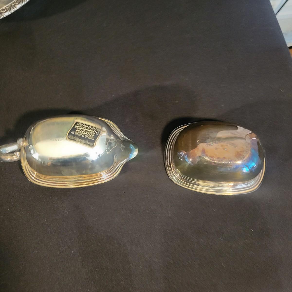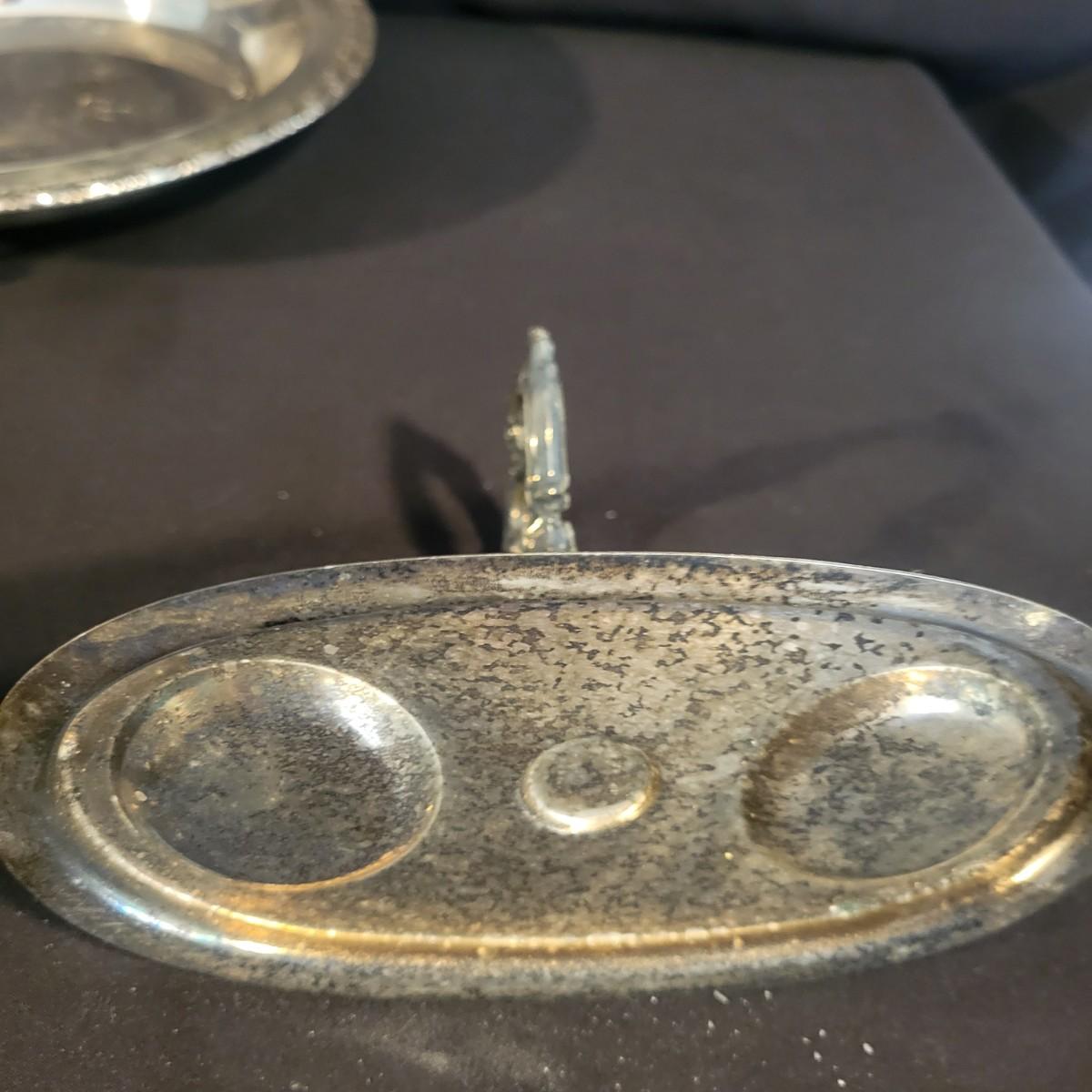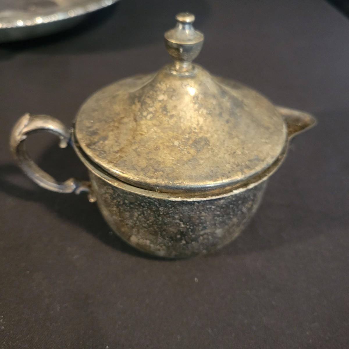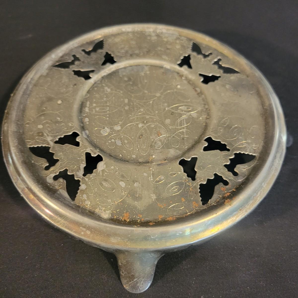 A large assortment of silver plated serving dishes, salt & pepper shakers, gravy boats, serving platters and trivets. Pieces range from good to fair in condition. All show some use and minor scratches. One small teapot is missing its handle. Some have a heavy patina and some show very little oxidation. See attached pictures for more detail. Largest serving platter measures approximately 14" x .5". Shipping available. Shipping can be costly, please call UPS store at 828-252-6930 for quote.