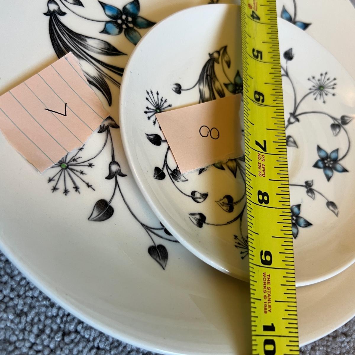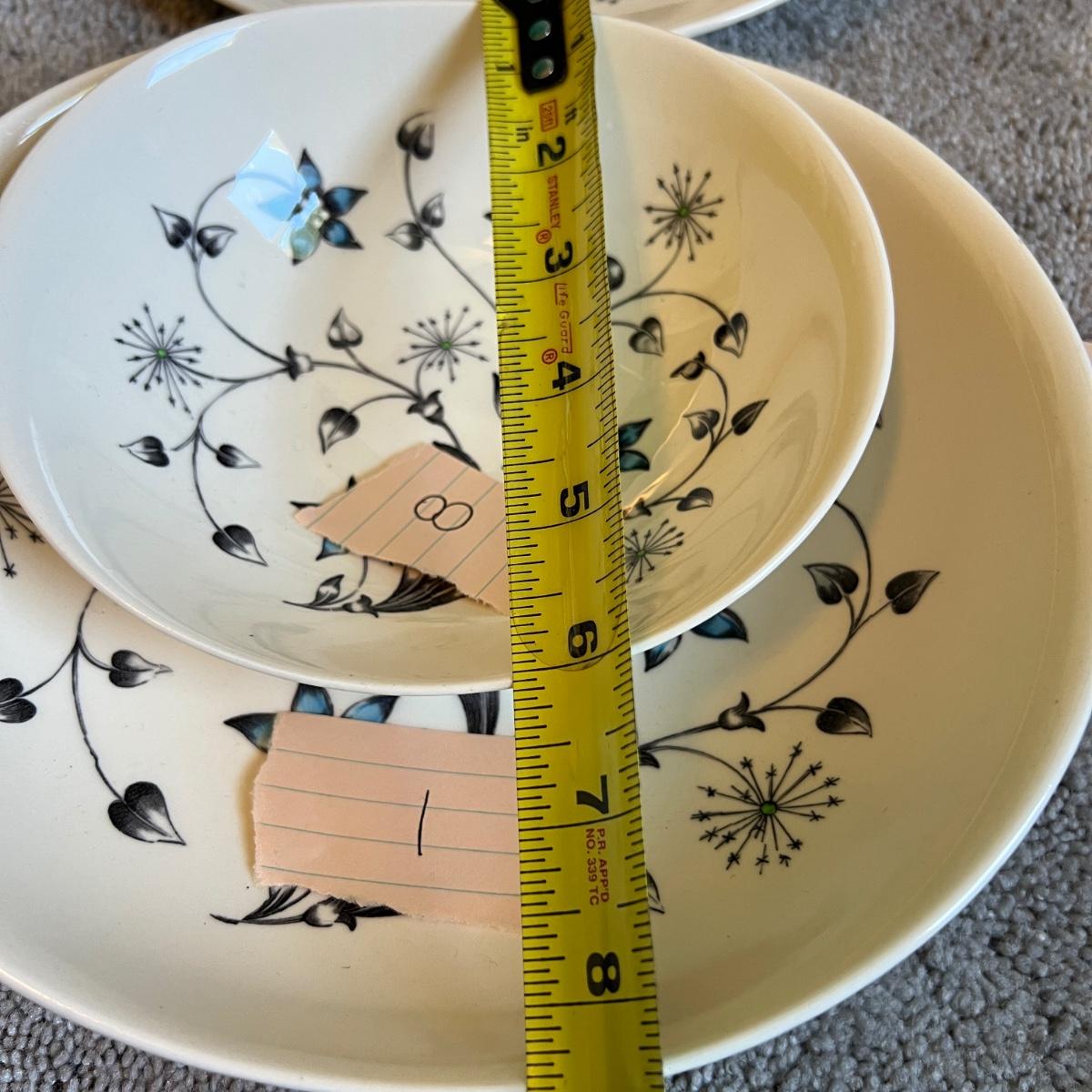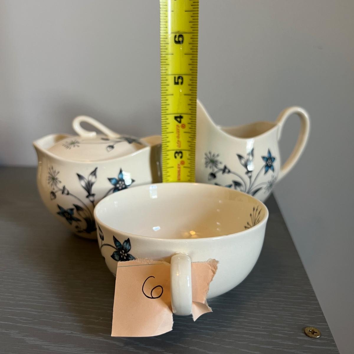 Set includes 6 tea cups, 8 tea cup plates, 7 dinner plates, 8 bowls, 1 serving bowl, 1 creamer, 1 sugar. Buying "as is - as found" in this wonderful estate. See ALL PHOTOS for content, condition, & dimensions. NEVER a Buyer's Premium or Credit Card Fee added.