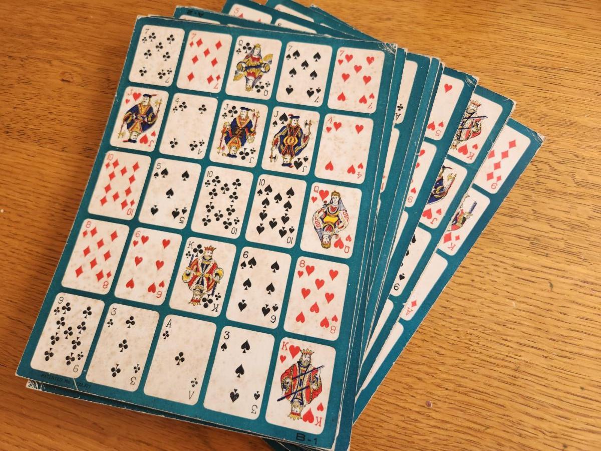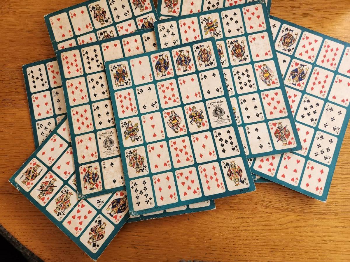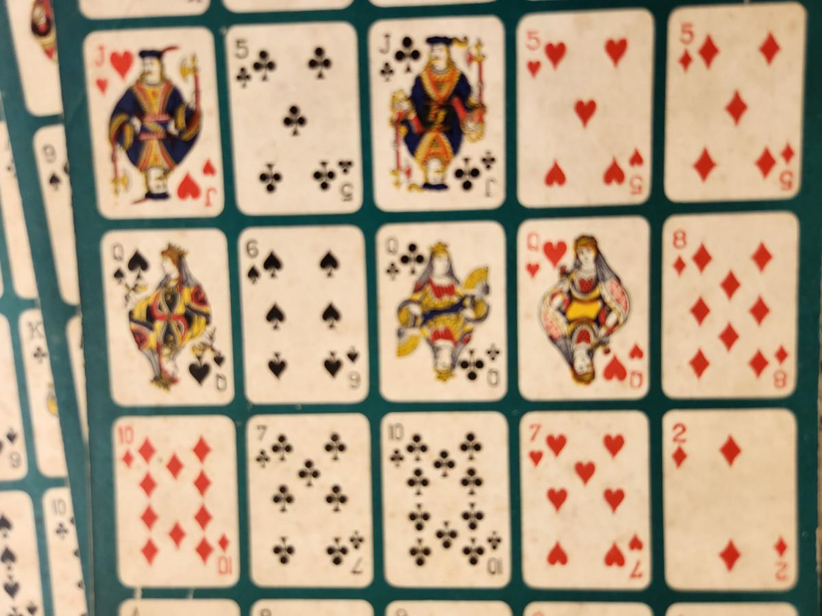 This auction lot is for a group of Vintage Playing Card Boards. These boards measure about 7X9-inches and are heavy paper stock. They were no doubt part of some game. Or used for Poker Bingo or some such game. They have light brown foxing and would be perfect for so many crafts, art or other use. 12 Boards total.